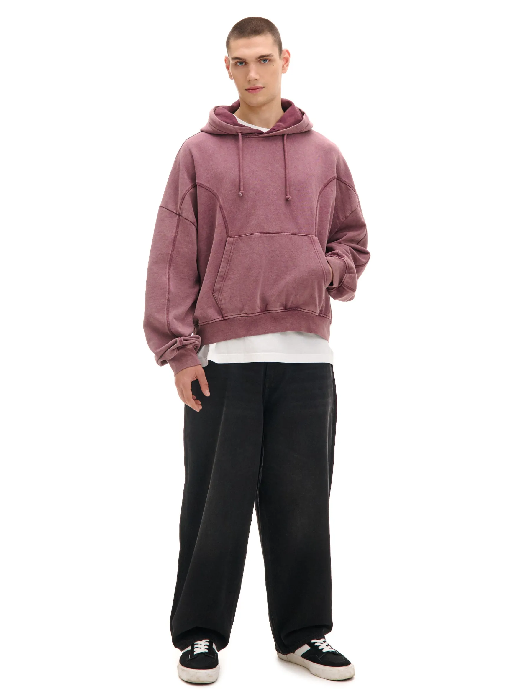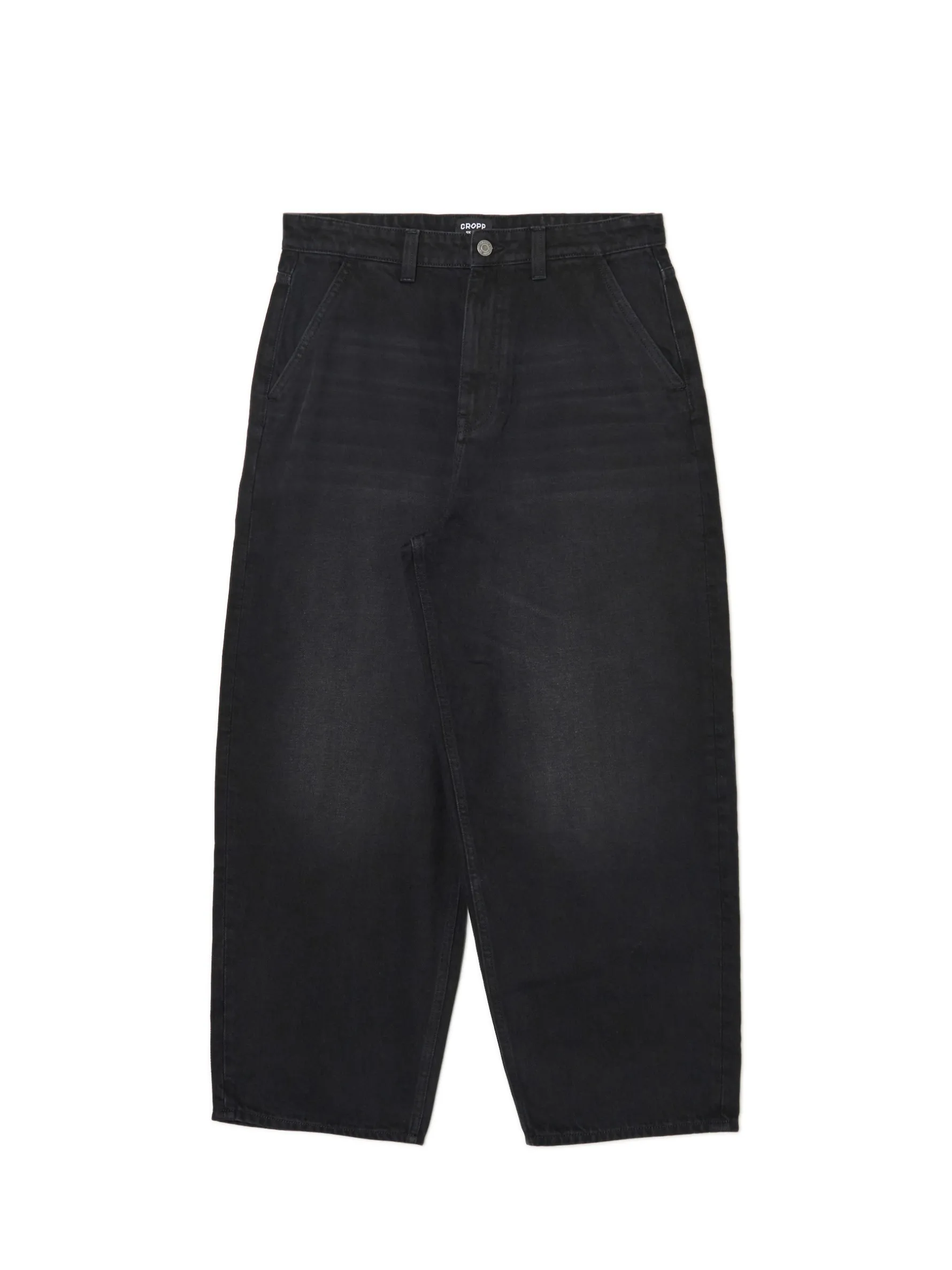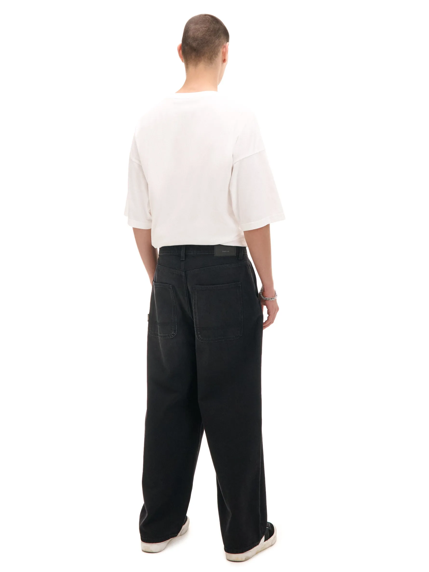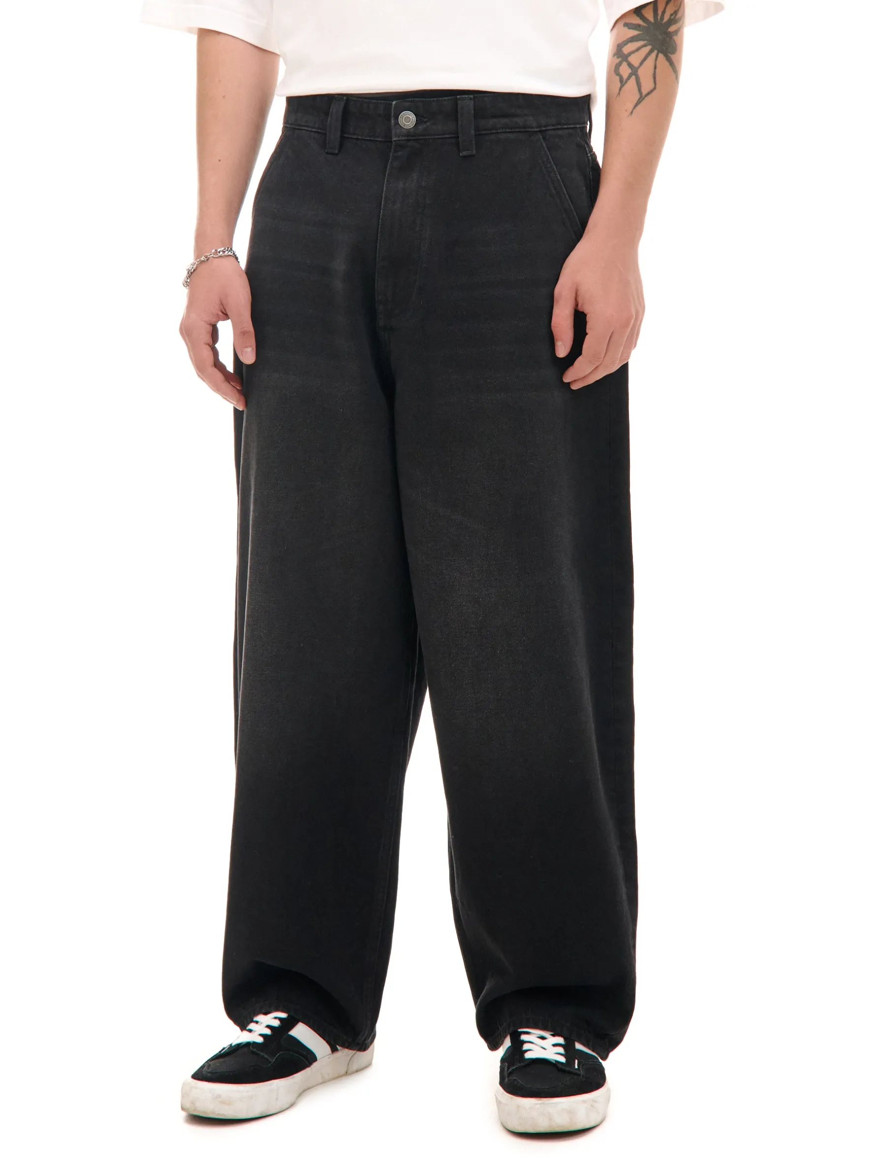 Denimowe męskie spodnie o kroju skater, uszyte z bawełnianej tkaniny. Fason charakteryzuje się mocno obniżonym krokiem i bardzo szeroką nogawką dla zapewnienia komfortu noszenia. 100% bawełny streetowy fason skater zapięcie na suwak i guzik długie, szerokie nogawki skośne kieszenie po bokach naszywane kieszenie z tyłu efekt sprania na całości
