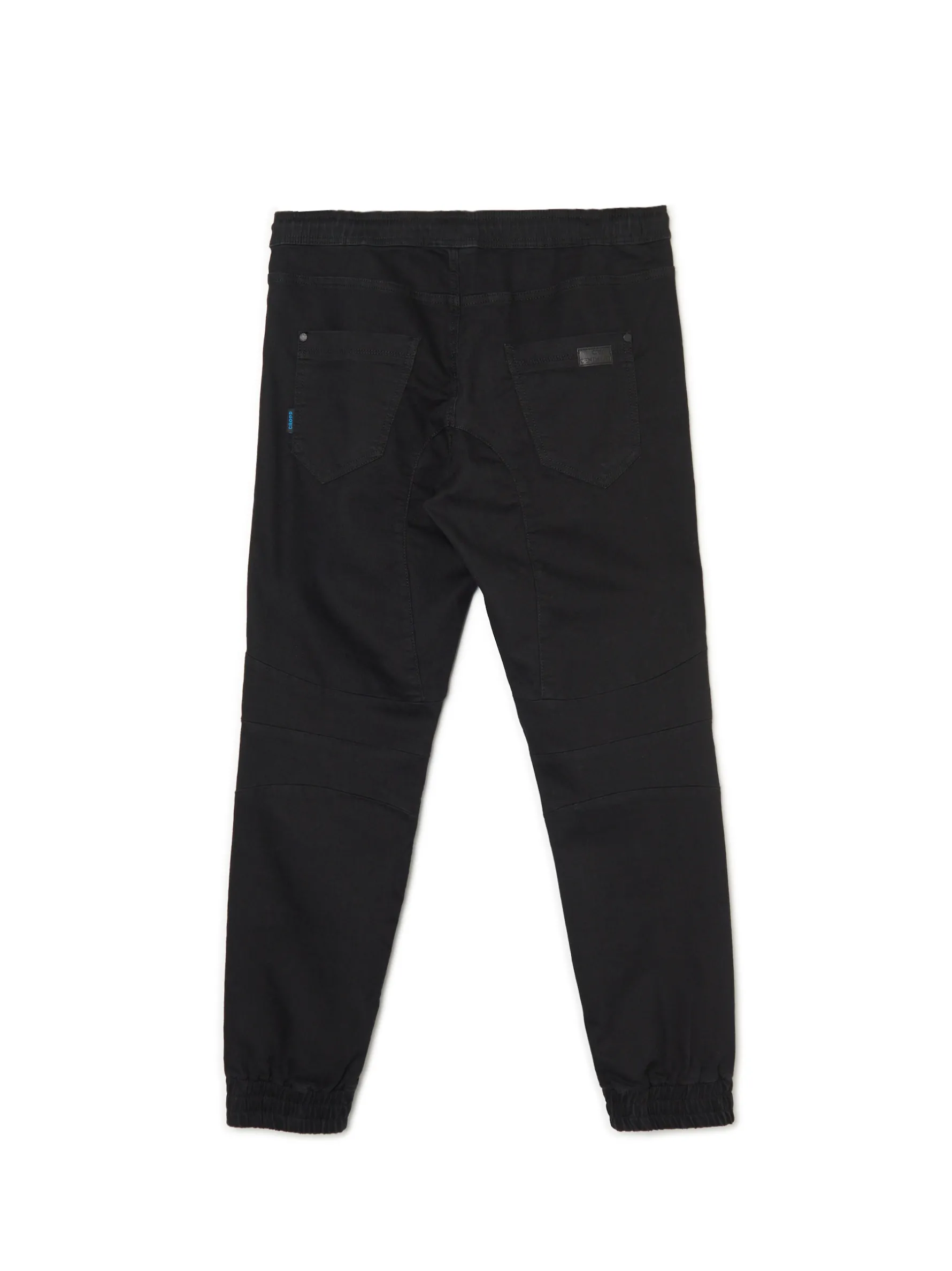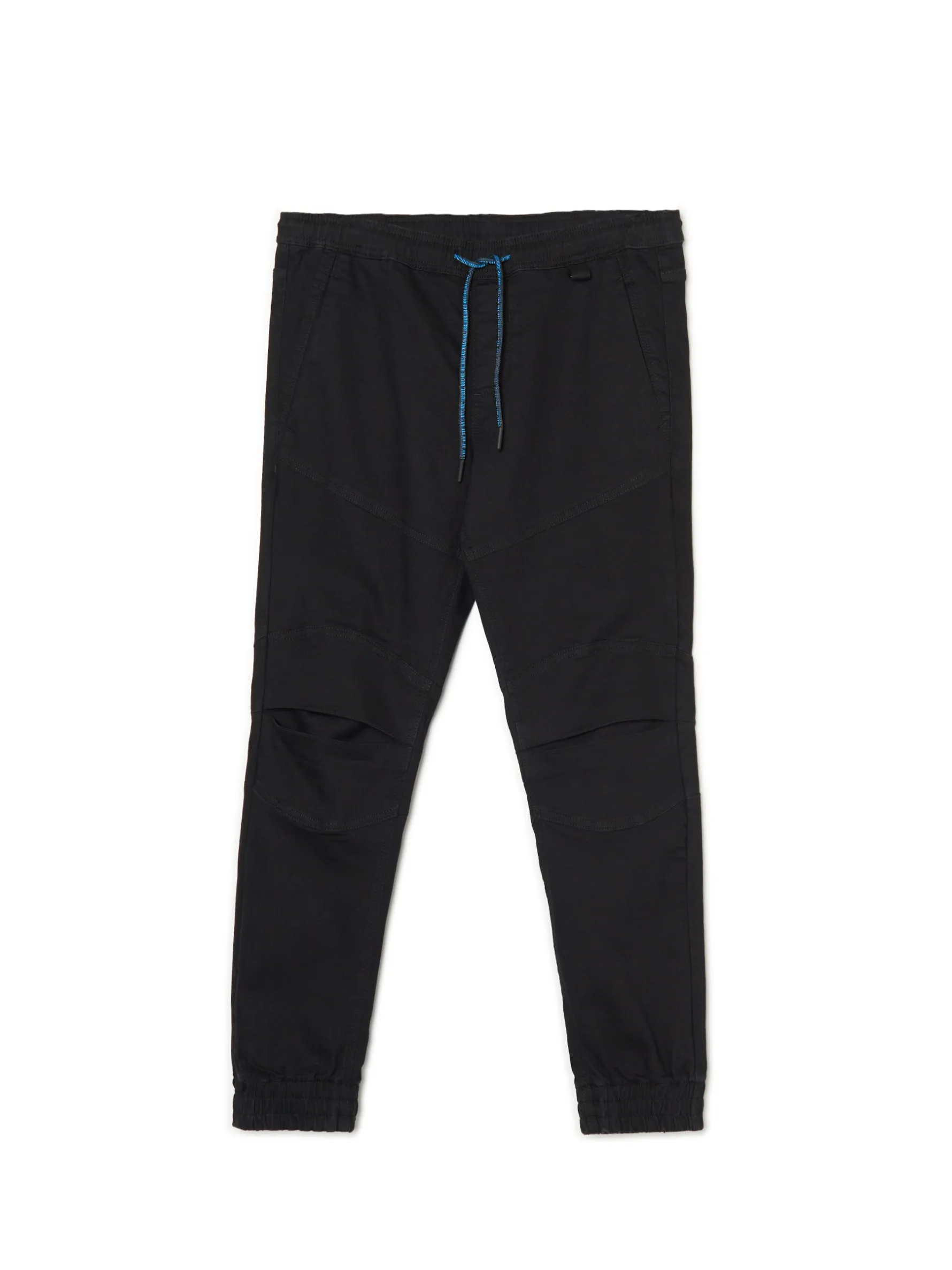 Męskie spodnie o kroju typu joggery, uszyte z czarnego denimu o wysokiej zawartości bawełny, regularny stan w pasie elastyczna gumka oraz sznurek do regulacji nogawka z cięciami i przeszyciami, zakończona ściągaczem z gumką cztery kieszenie