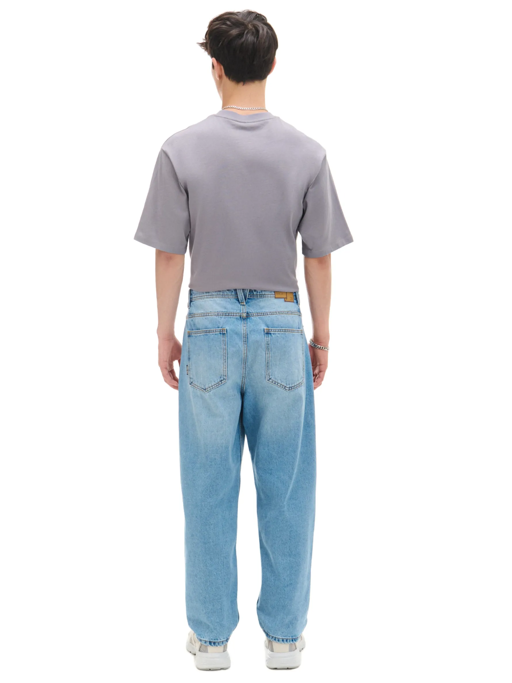 Niebieskie męskie jeansy o kroju loose, uszyte w 100% z bawełny. regularny stan, w pasie zamek i guzik obniżony krok cztery kieszenie luźna nogawka, lekko zwężana ku dołowi efekt sprania materiału szlufki na pasek Model prezentuje produkt w rozmiarze M. Wzrost modela: 185 cm