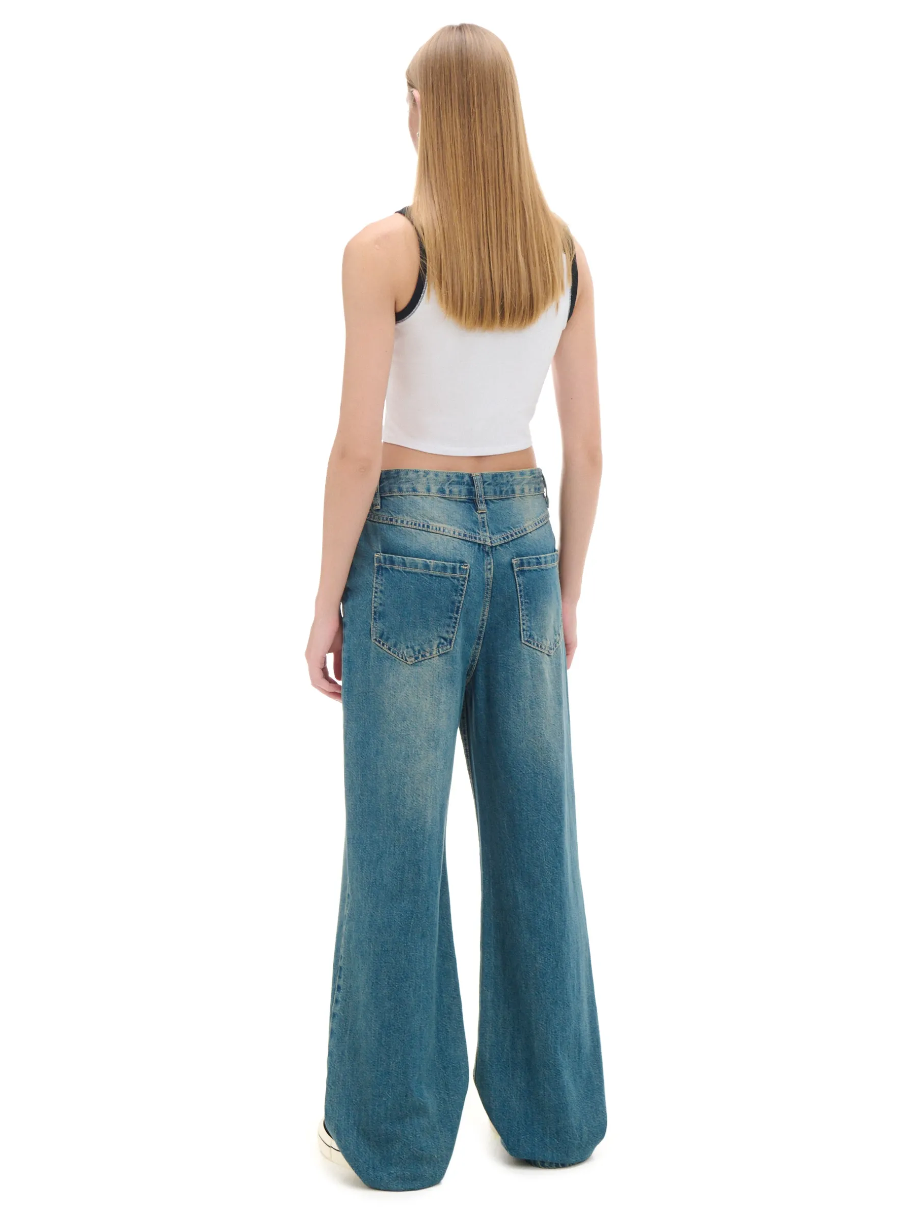 Damskie spodnie jeansowe uszyte z bawełnianej tkaniny. Szerokie nogawki, praktyczne kieszenie i wygodne zapiecie, zapewnią Ci komfort podczas każdej aktywności. denim o klasycznym kolorze z delikatnym efektem sprania obszerny krój baggy zapięcie na zamek i guzik długie, szerokie nogawki pięć kieszeni Potrzebna Ci wersja petite? Jest tu: 747AQ-55M .