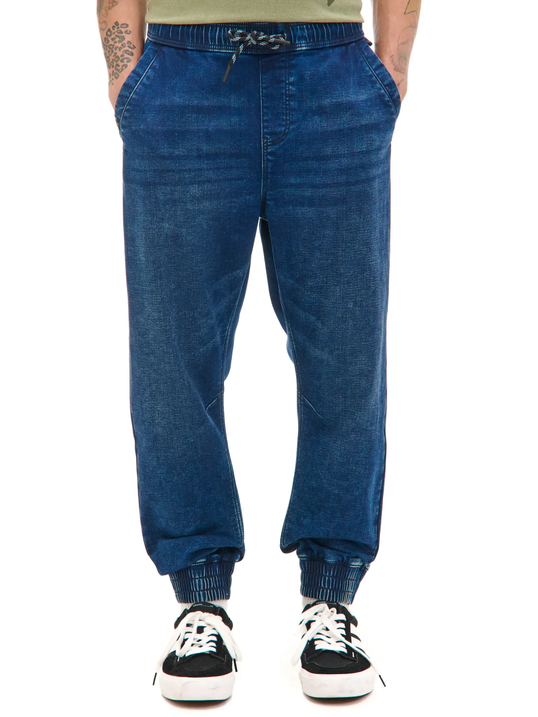 Jeansy i dresy w jednym modelu? Czemu nie! Te męskie denimowe joggery zostały uszyte z mieszanki tkanin z elastycznym wykończeniem. Ściągacze przy nogawkach, guma z regulacją w pasie i praktyczne kieszenie przypominają wyglądem dresy. dresowe joggery o kroju regular tkanina z dodatkiem elastycznych włókien, dzięki czemu model dopasowuje się do zmieniającej się sylwetki guma w pasie ze sznurkiem do regulacji nogawki zakończone ściągaczem skośne kieszenie po bokach dwie naszyte kieszenie tylnie efekt sprania na całości dodatkowa szlufka, np. na klucze lub otwieracz do piwa naszywka Cropp