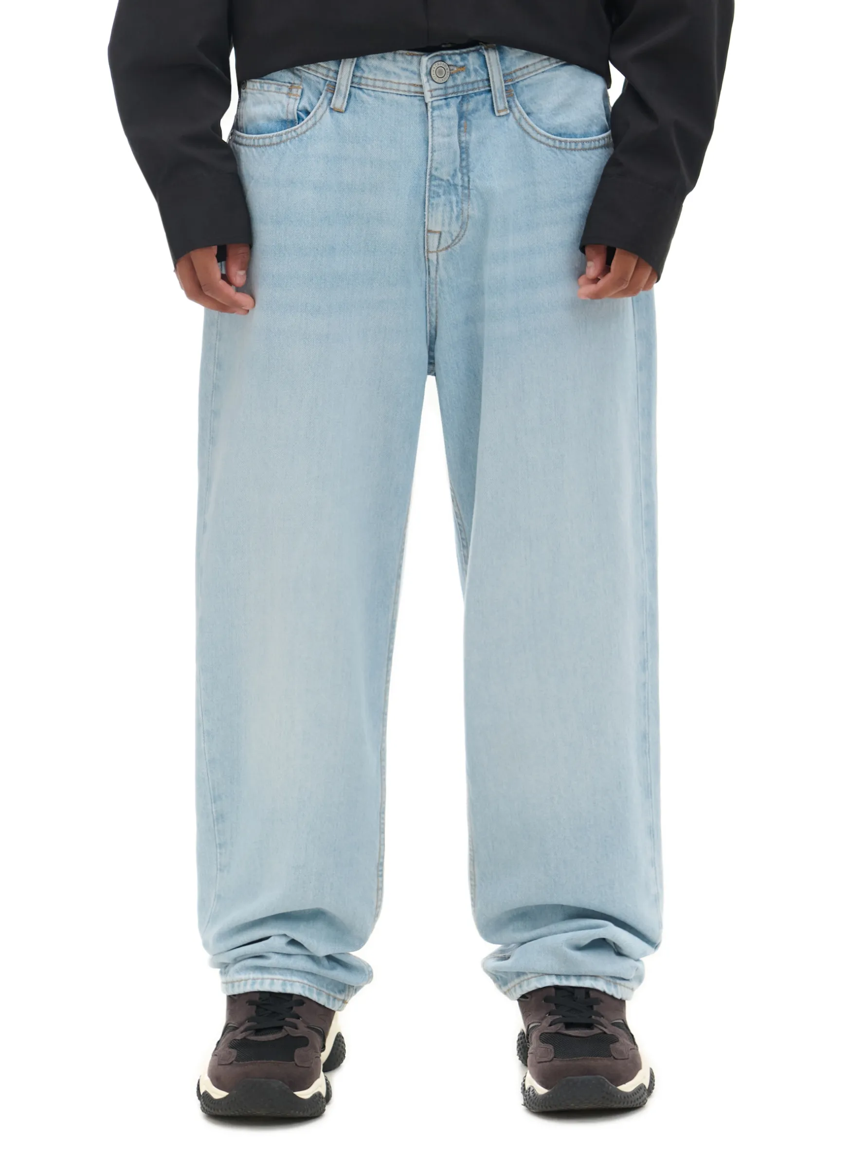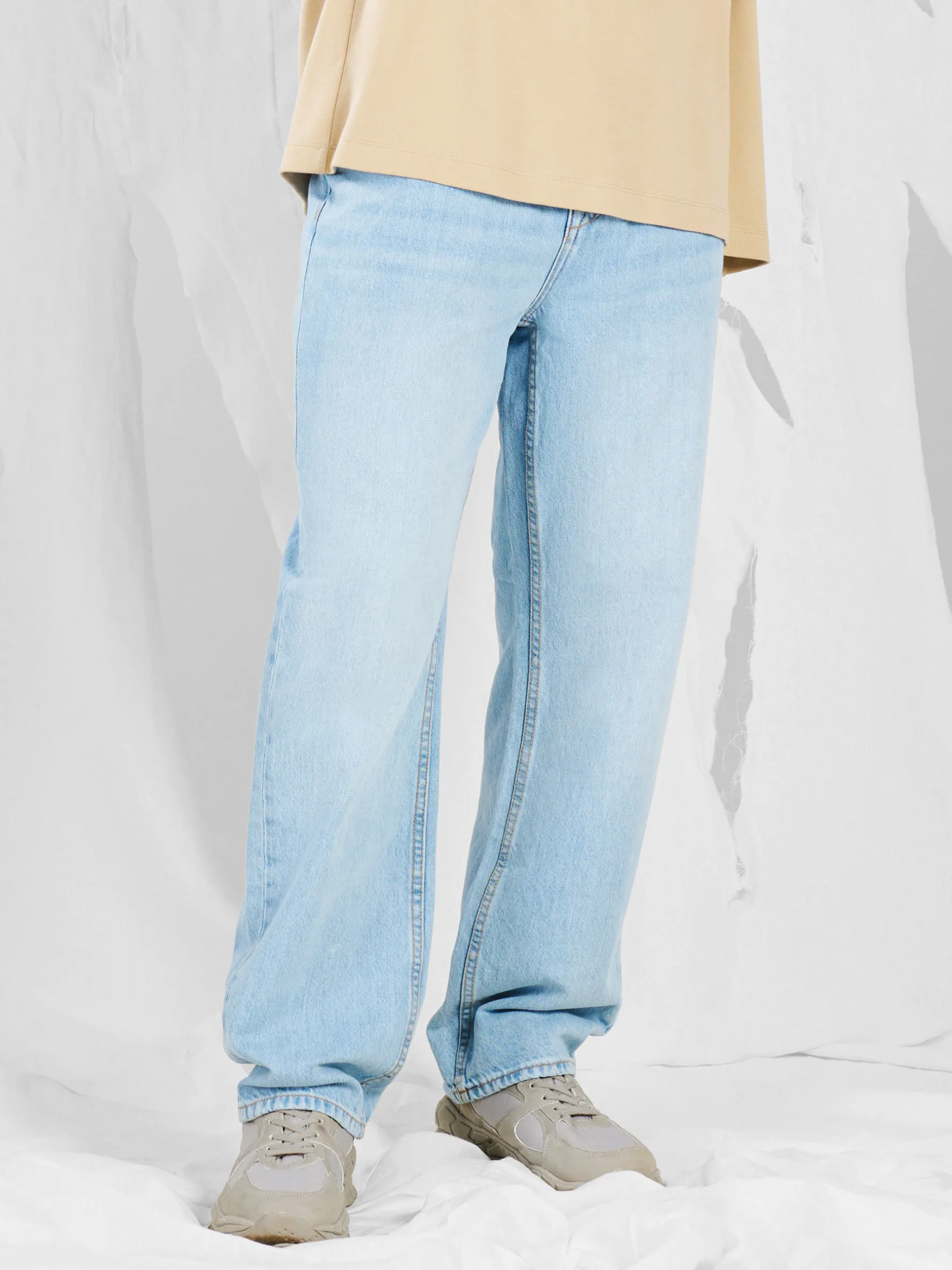 Męskie spodnie jeansowe typu relaxed, uszyte z bawełnianej tkaniny w jasnym odcieniu. Szlufki blisko siebie to praktyczne rozwiązanie na zmęczone ręce po całym dniu. Zrelaksuj się! 100% bawełny prosty krój zapięcie na zamek i guzik wąskie szlufki na pasek pięć kieszeni delikatny efekt sprania