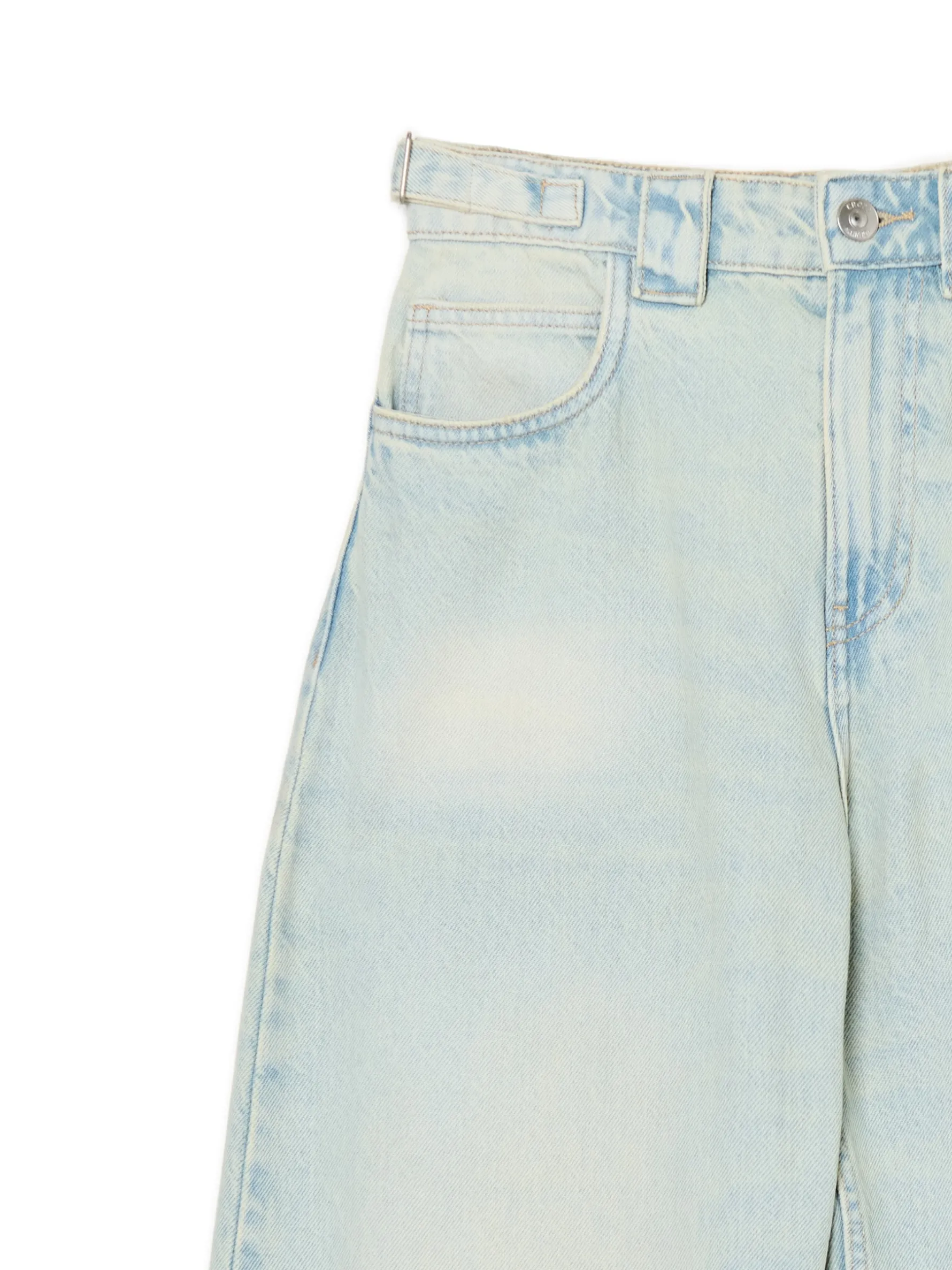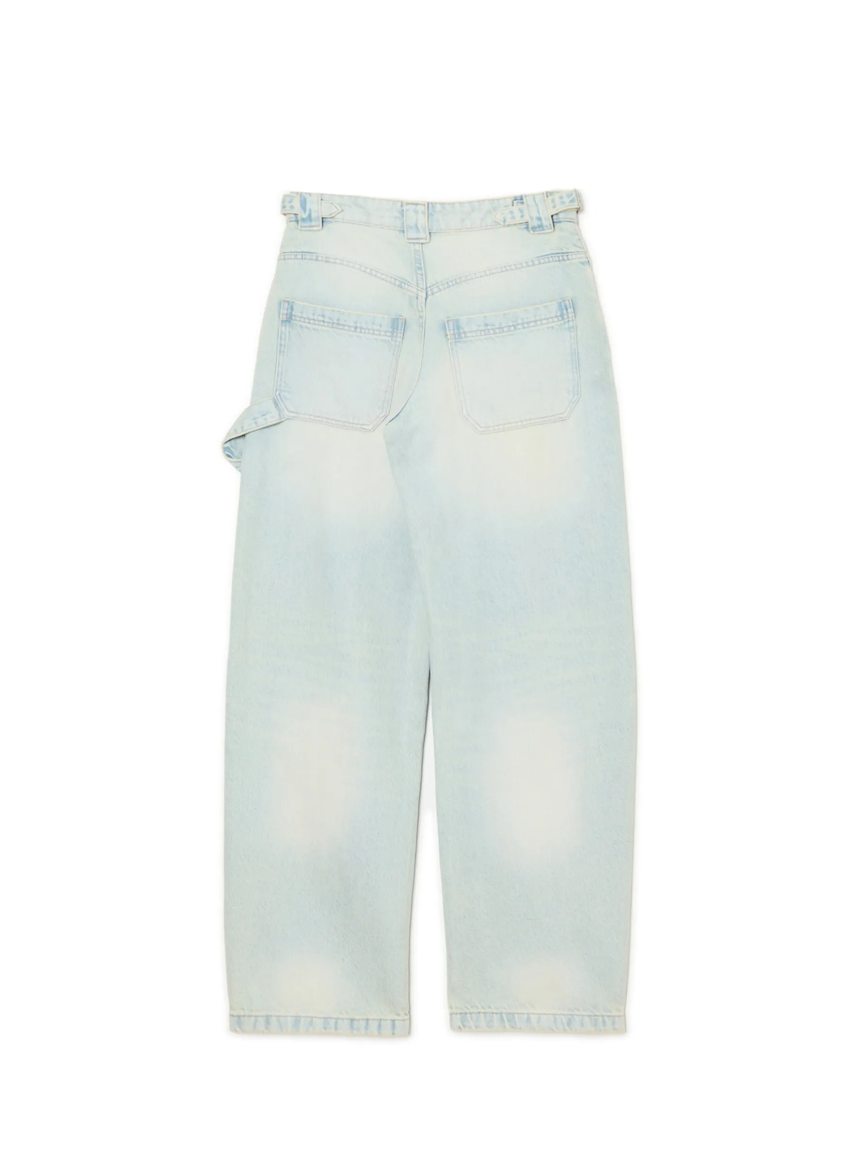 Damskie spodnie jeansowe z wysokim stanem o kroju skater, uszyte z bawełny. Ozdobą tego itemu są paski z metalowymi klamrami i efekt sprania na całości. 100% bawełny swobodny, luźny krój wysoki stan, zapięcie na zamek i guzik pięć kieszeni hammer loop na lewej nogawce dwa wąskie, regulowane paski delikatny efekt sprania Wzrost modelki: 177 cm