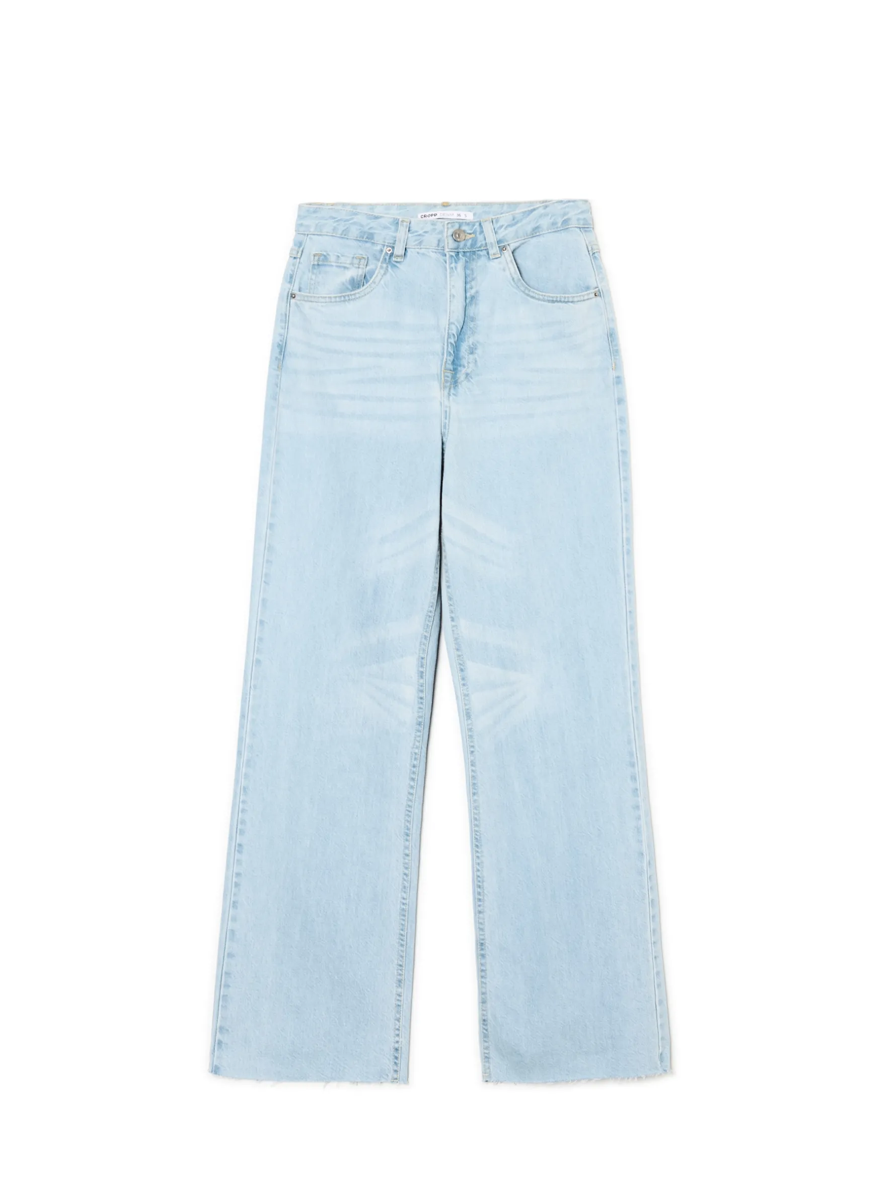 Damskie jeansy wide leg w jasnym odcieniu uszyte w 100% z bawełny. regularny stan, zapięcie na zamek i guzik długa, szeroka nogawka z surowym wykończeniem cztery kieszenie efekt sprania