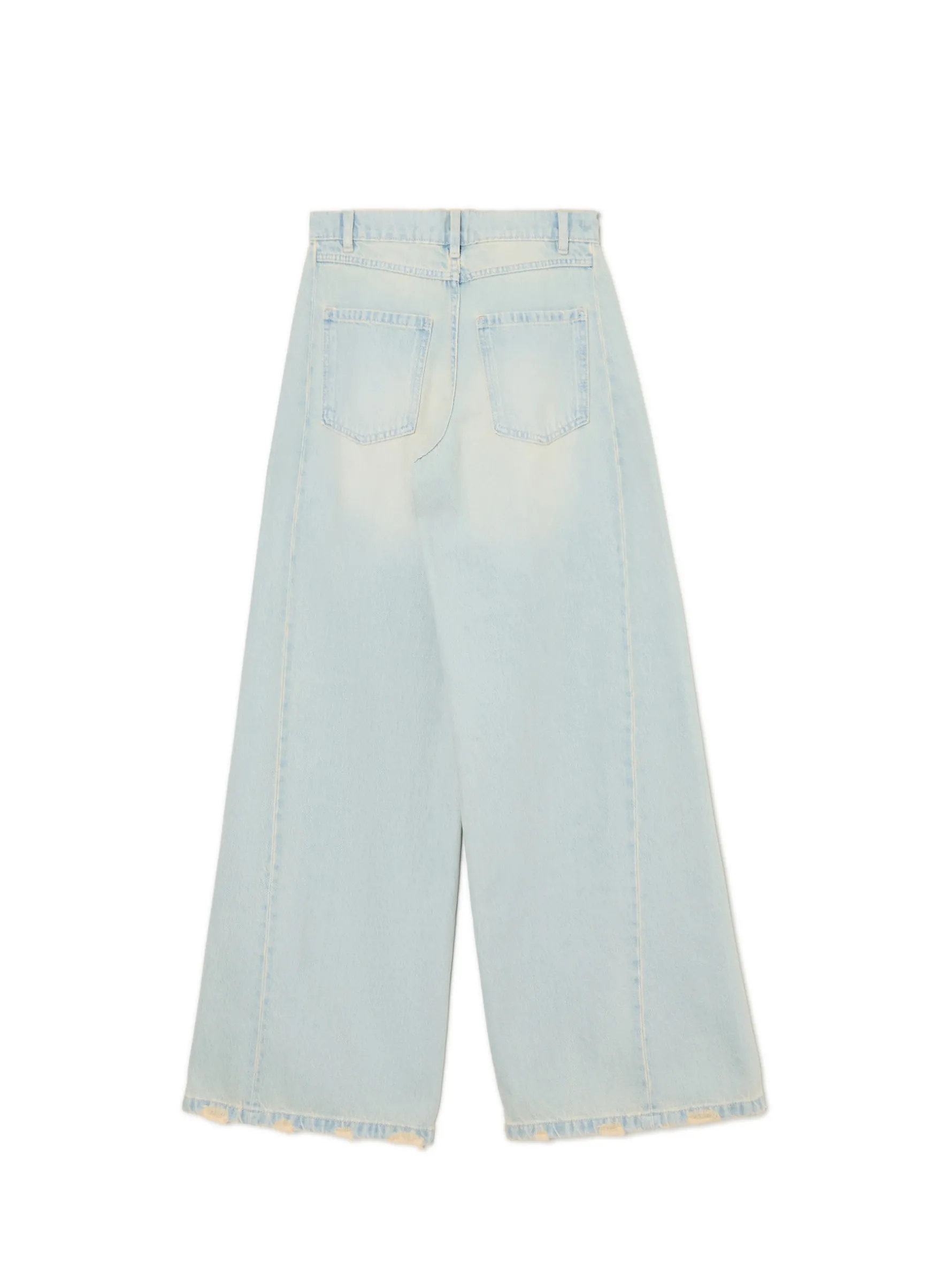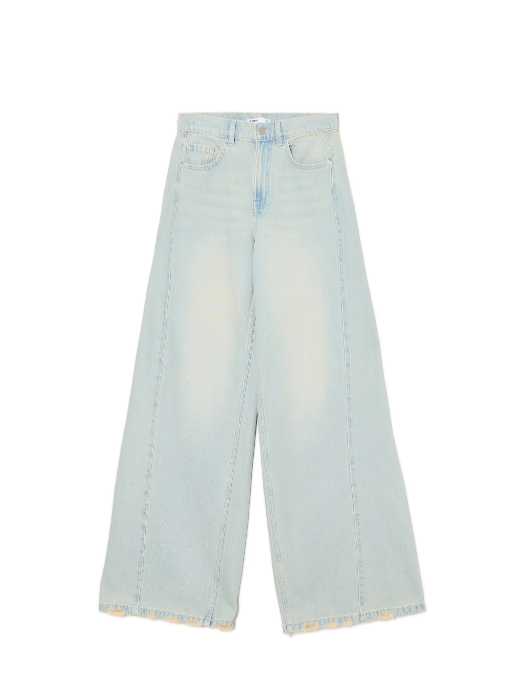 Jasne spodnie damskie typu wide leg, uszyte z bawełnianej tkaniny z surowo wykończonymi nogawkami. 100% bawełny długie, szerokie nogawki zapięcie na zamek i guzik pięć kieszeni surowe wykończenie nogawki z postrzępieniami efekt sprania na całości
