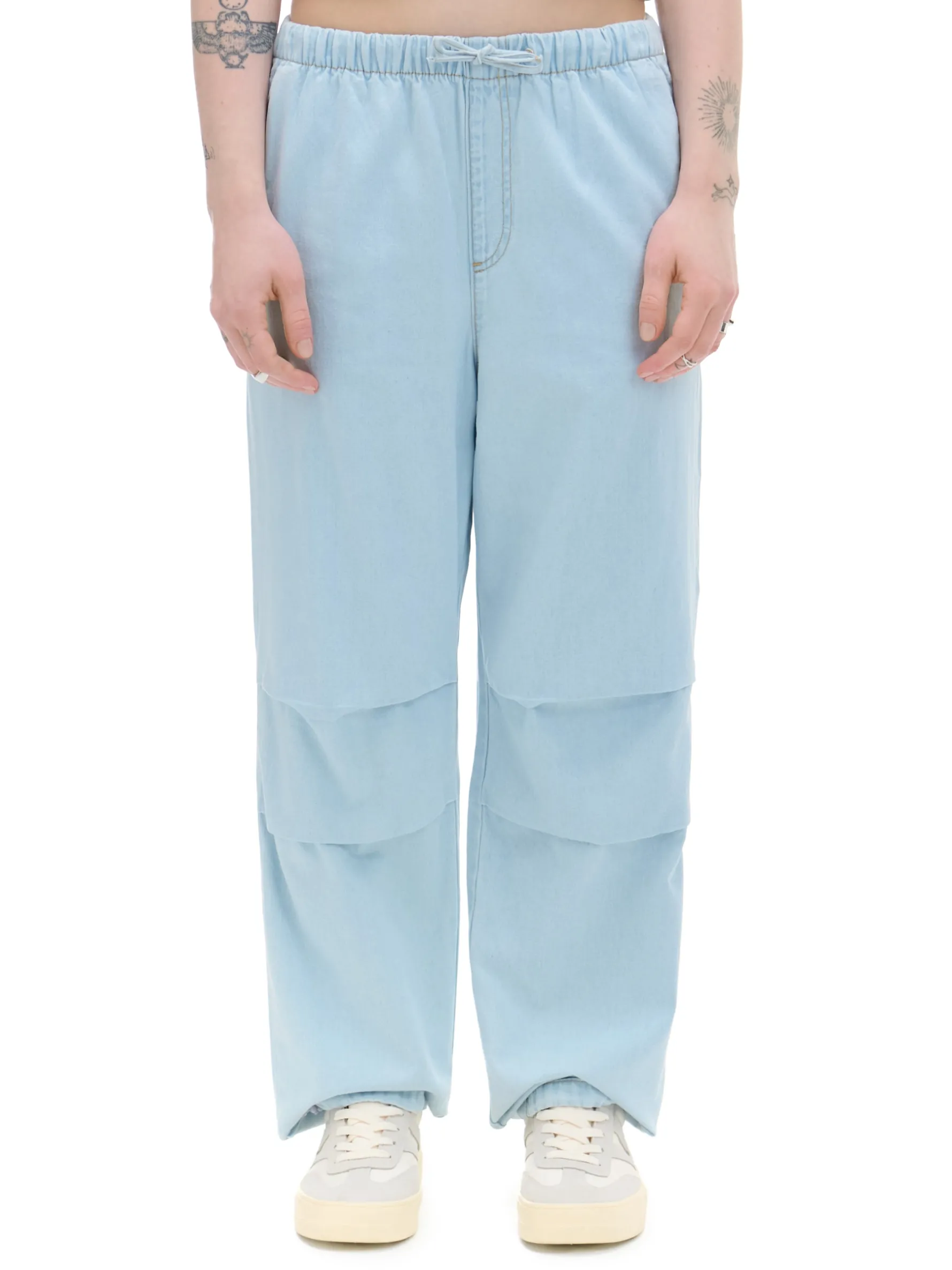 Damskie spodnie jeansowe o swobodnym fasonie parachute, uszyte z bawełny. W pasie gumka i sznurek do regulacji, boczne kieszenie, szeroka nogawka z regulacją u dołu.