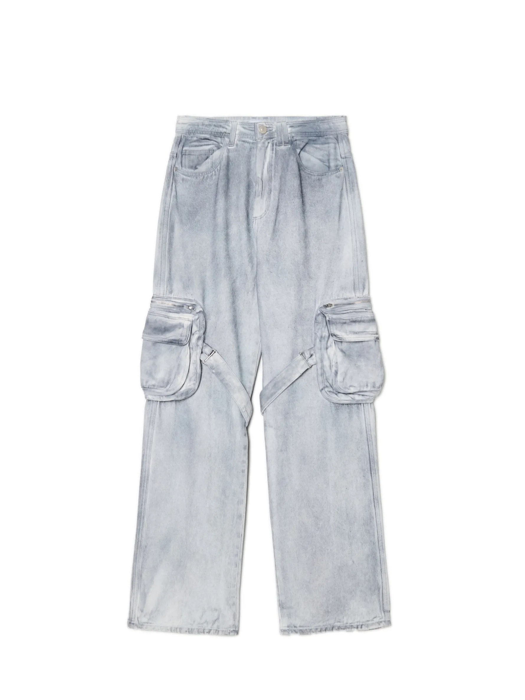 Damskie spodnie jeansowe o kroju baggy, uszyte z bawełnianej tkaniny. Wyjątkowe w tym modelu są praktyczne kieszenie na wszystkie najpotrzebniejsze rzeczy. 100% bawełny obszerny krój baggy zapięcie na zamek i guzik 5 kieszeni, w tym kieszenie cargo dodatkowe kieszenie cargo na nogawkach szlufki na pasek dekoracyjne paski przy nogawkach z możliwością regulacji efekt sprania