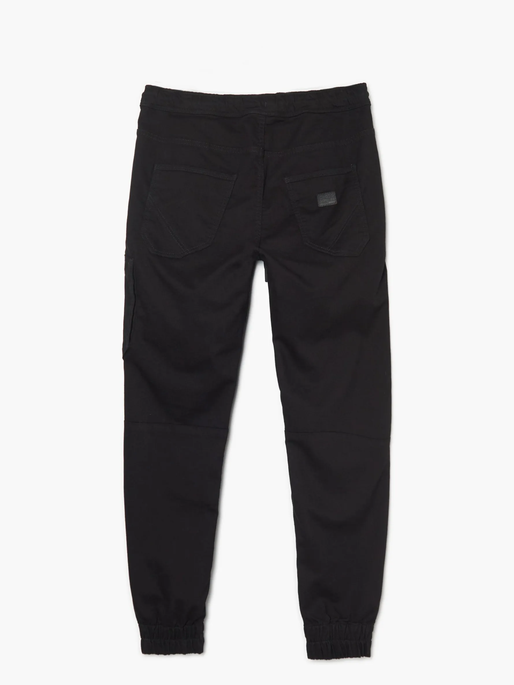 Męskie spodnie jeansowe w kolorze czarnym, uszyte z tkaniny o wysokiej zawartości bawełny. regularny stan, w pasie gumka oraz sznurek do regulacji długa nogawka, zakończona ściągaczem z gumką pięć kieszeni, w tym jedna cargo, zapinana na suwak przeszycia