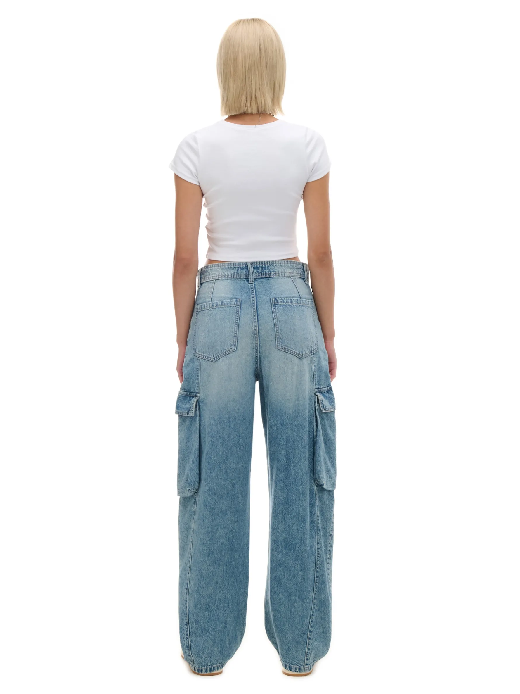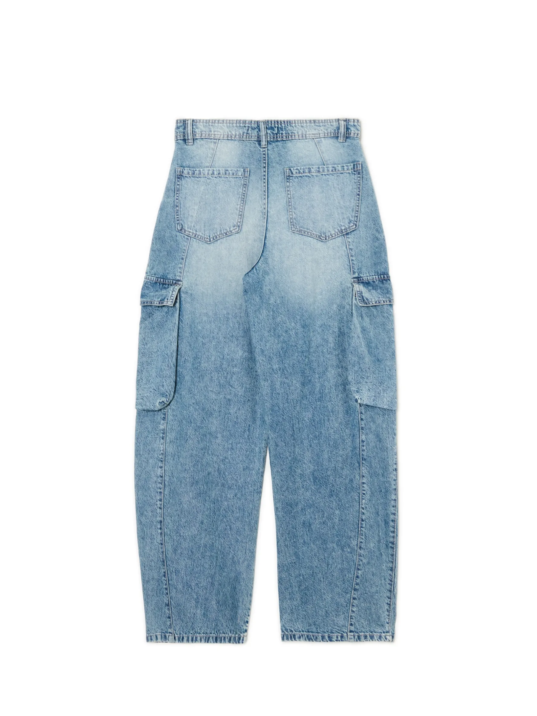 Damskie denimowe spodnie o unikatowym kroju. Wyposażone w wygodne zapięcie, praktyczne kieszenie i delikatny efekt sprania. Idealne na spontany! denim o klasycznym kolorze z delikatnym efektem sprania długie, szerokie nogawki zapięcie na zamek i guzik szerokie szlufki na pasek 6 kieszeni, w tym kieszenie cargo delikatny efekt sprania Wzrost modelki: 177 cm