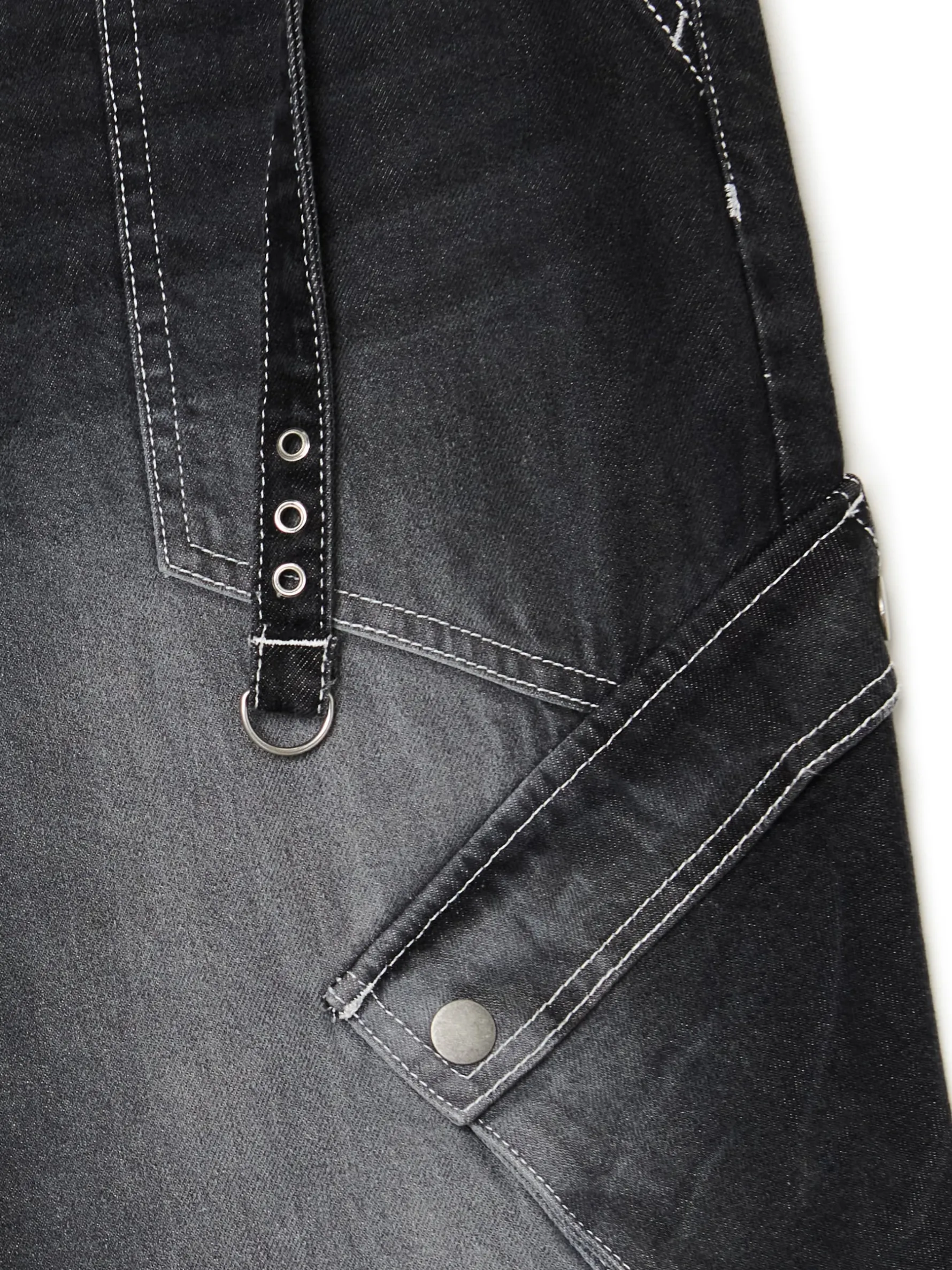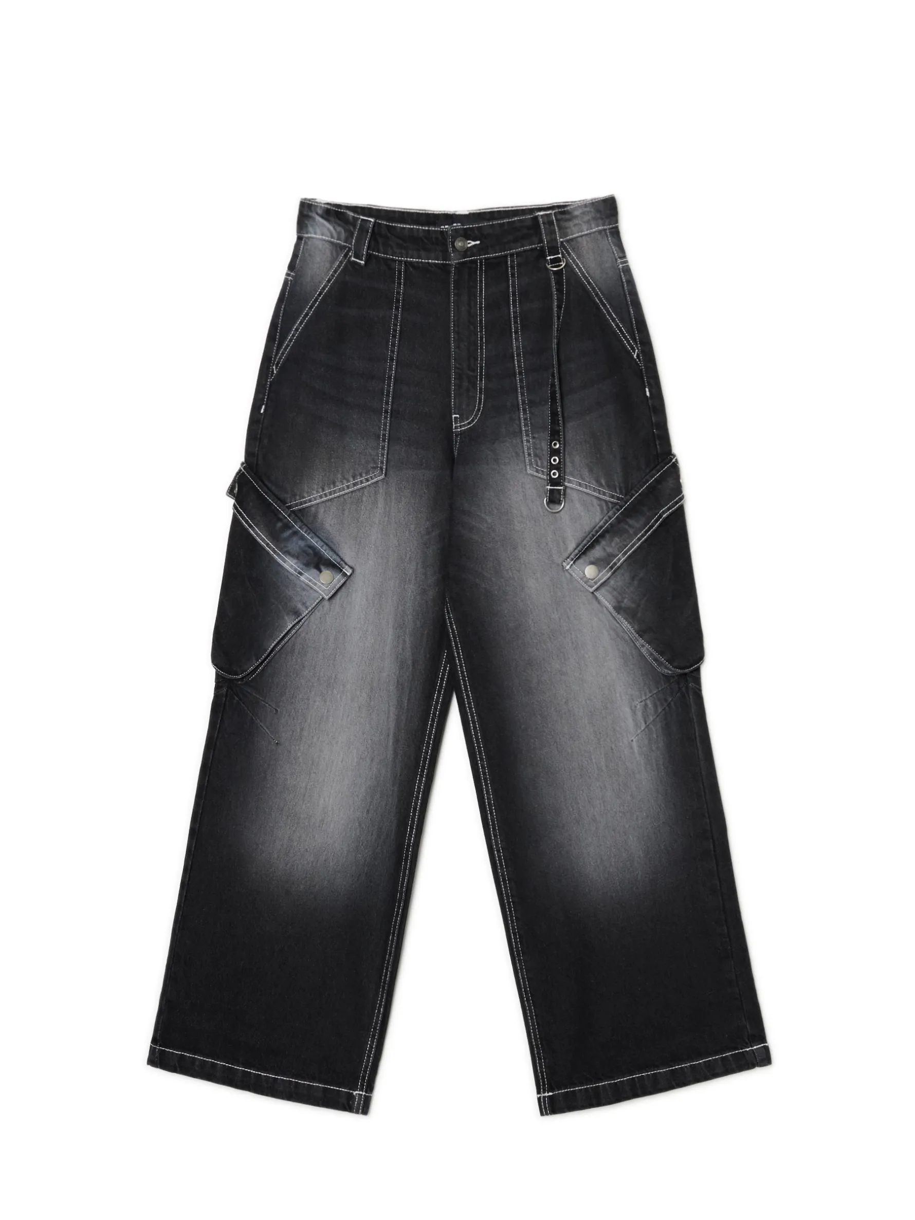 Damskie spodnie jeansowe o kroju super baggy, uszyte z bawełnianej tkaniny. Jeansy w kolorze czarnym to must-have w gardeobie każdej kobiety! 100% bawełny zapięcie na zamek i guzik długie, szerokie nogawki skośne kieszenie z przodu naszywane kieszenie z tyłu dwie kieszenie z patkami i zapięciem na zatrzaski kontrastowe przeszycia efekt sprania szerokie szlufki na pasek ozdobny pasek z metalowym wykończeniem