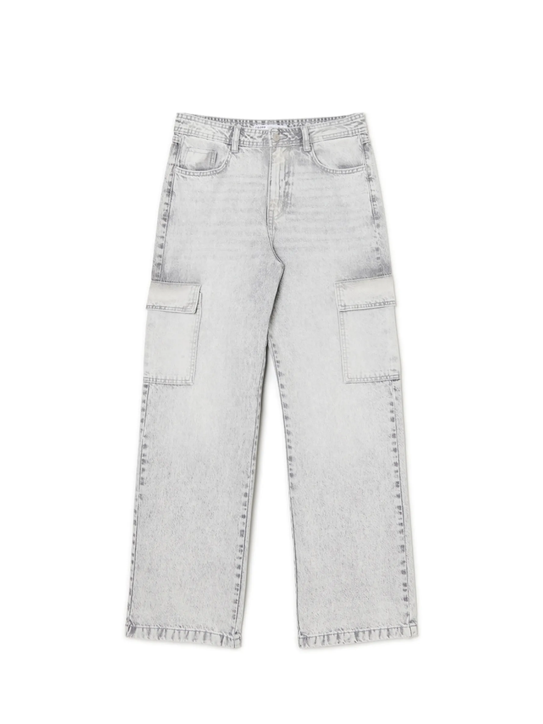 Damskie spodnie jeansowe uszyte z bawełnianej tkaniny. Szerokie nogawki, praktyczne kieszenie i szlufki blisko siebie – praktyczne rozwiązanie na pasek lub zmęczone ręce po całym dniu. denim o szarym odcieniu z delikatnym efektem sprania obszerny krój baggy zapięcie na zamek i guzik długie, szerokie nogawki pięć kieszeni dodatkowe kieszenie cargo na nogawkach Wzrost modelki: 177 cm