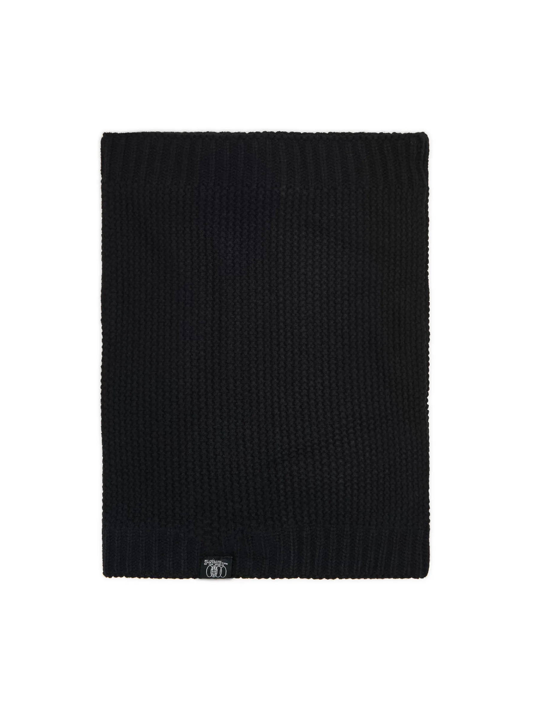 Czarny męski szalik typu komin, uszyty z grubej, mięsistej dzianiny o ciekawym splocie. U dołu ozdobiony niewielką metką z napisami. Praktyczne must-have na zimne miesiące!
