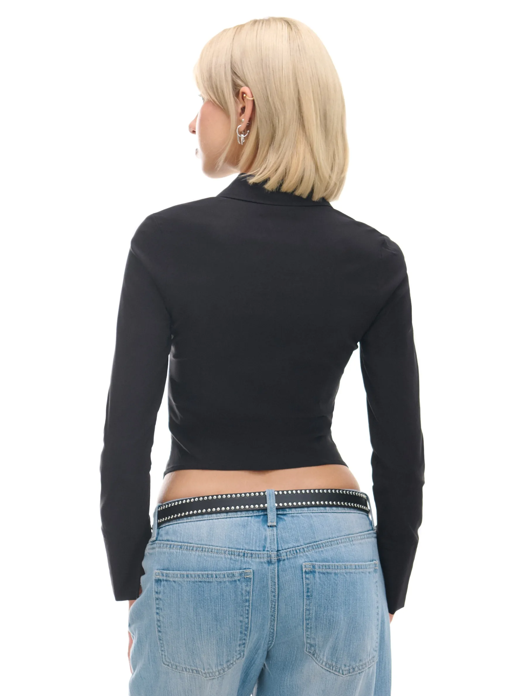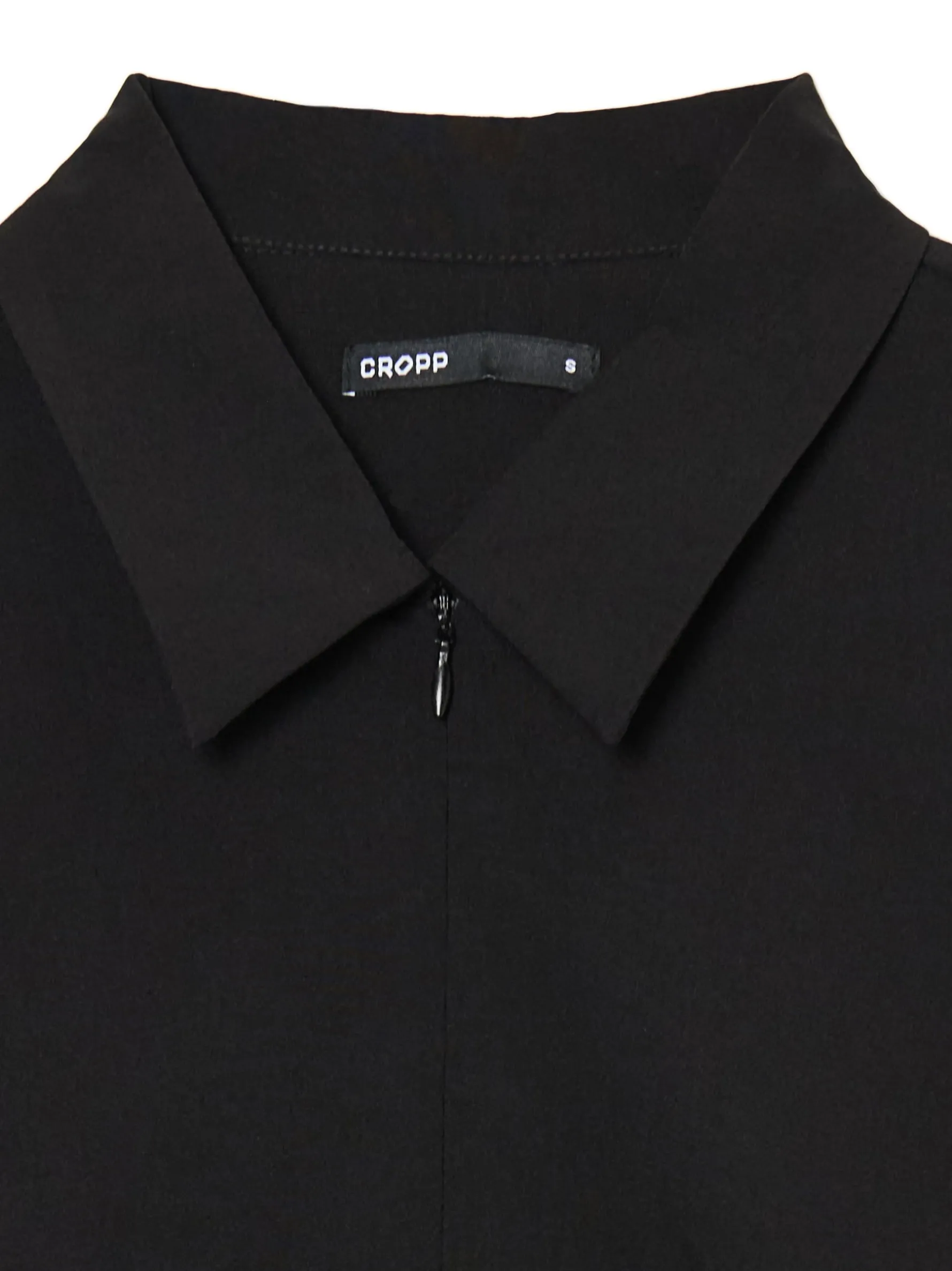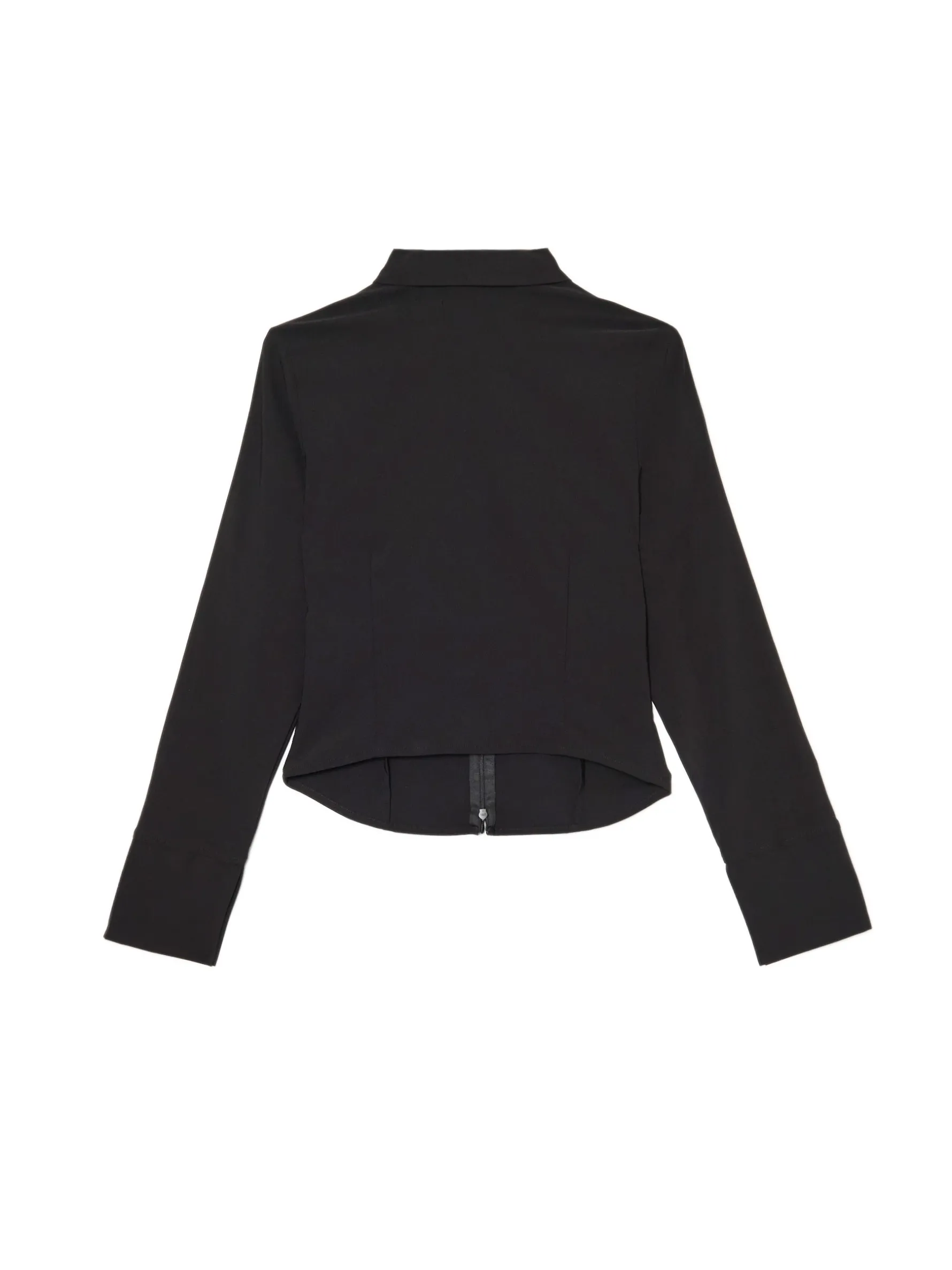 Czarna koszula damska z długim rękawem uszyta z mieszanki tkanin o wysokiej zawartości wiskozy. Posiada dwustronny suwak z możliwością regulacji długości zapięcia. Wypróbuj różne warianty. uszyta z tkaniny z dodatkiem wiskozy zapięcie na podwójny zamek krótki, dopasowany krój klasyczny kołnierzyk długie rękawy wykończone mankietami Wzrost modelki: 177 cm