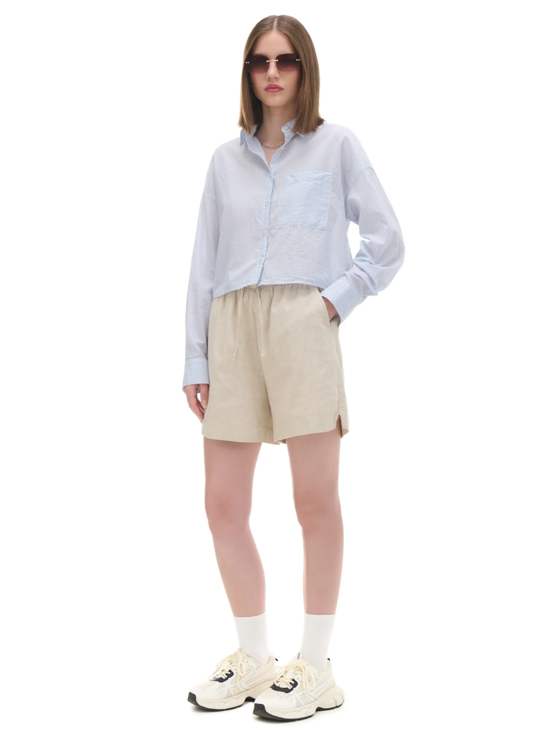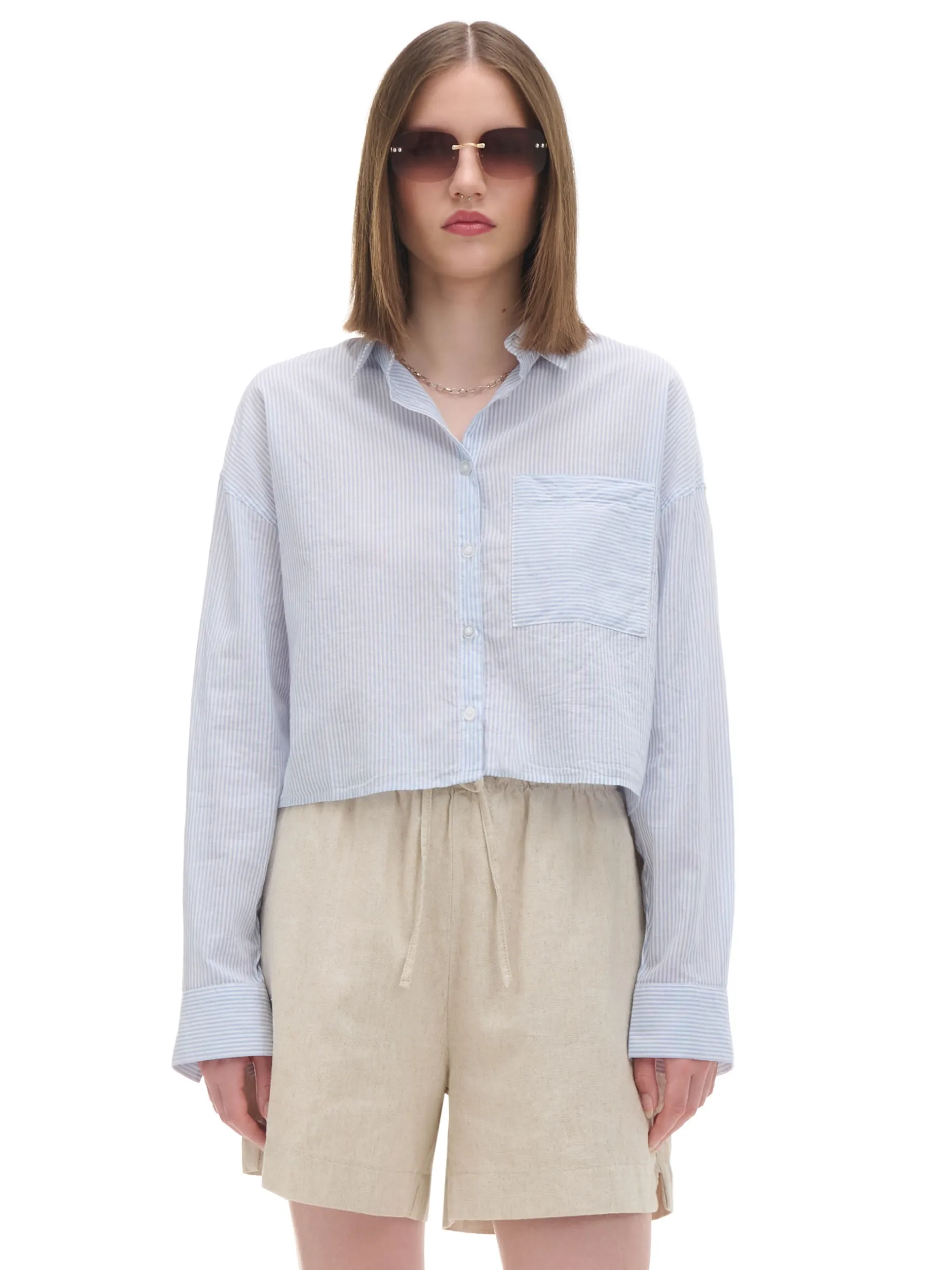 Damska koszula o krótszym kroju, uszyta z bawełny ze wzorem w paski. Dodatkowo na piersi wszyta kieszeń na drobiazgi. 100% bawełny krótki krój zapięcie na guziki na całej długości długie rękawy zakończone mankietem z guzikami klasyczny kołnierzyk kieszonka piersiowa wzór w paski na całości Wzrost modelki: 172 cm