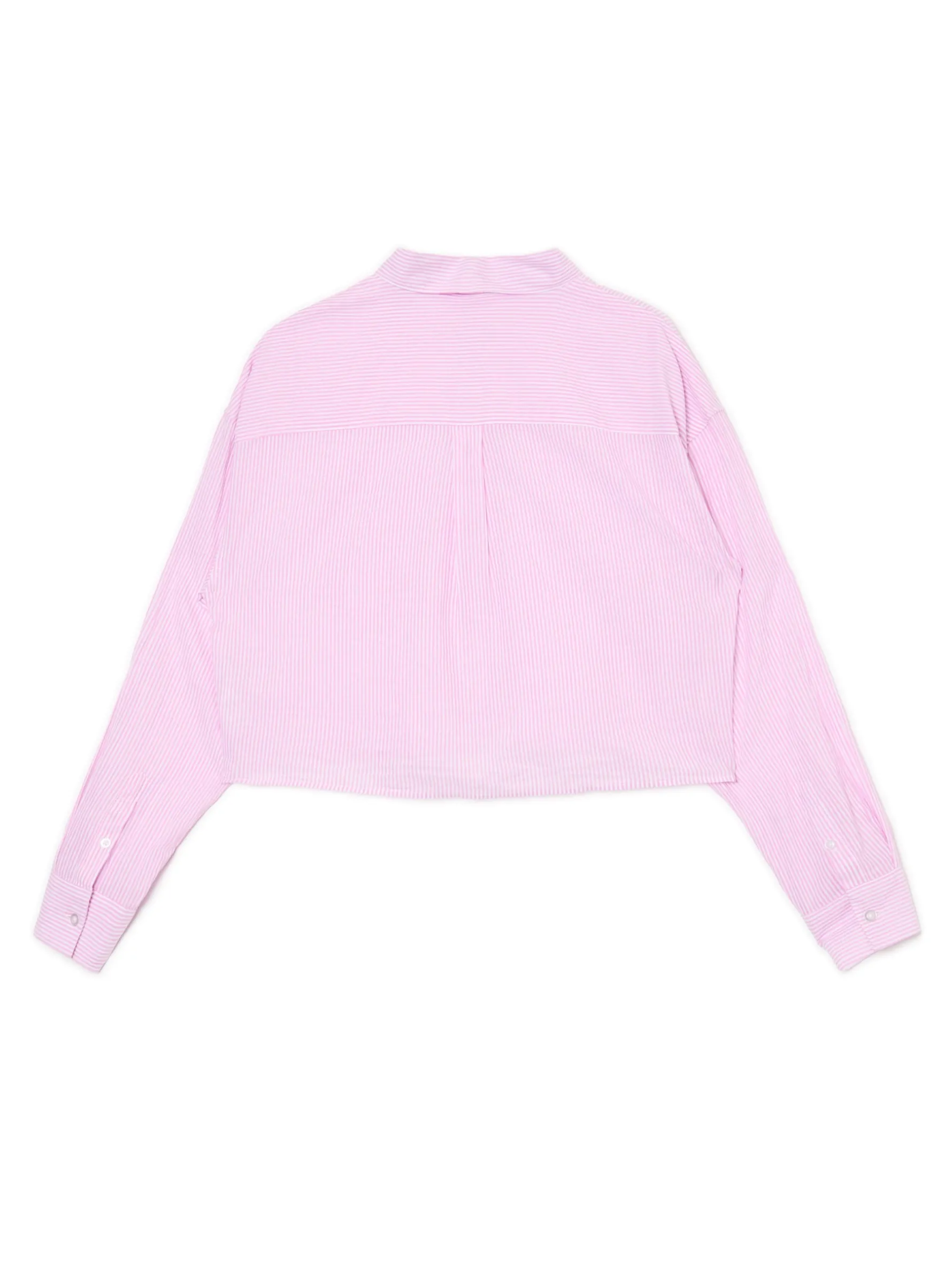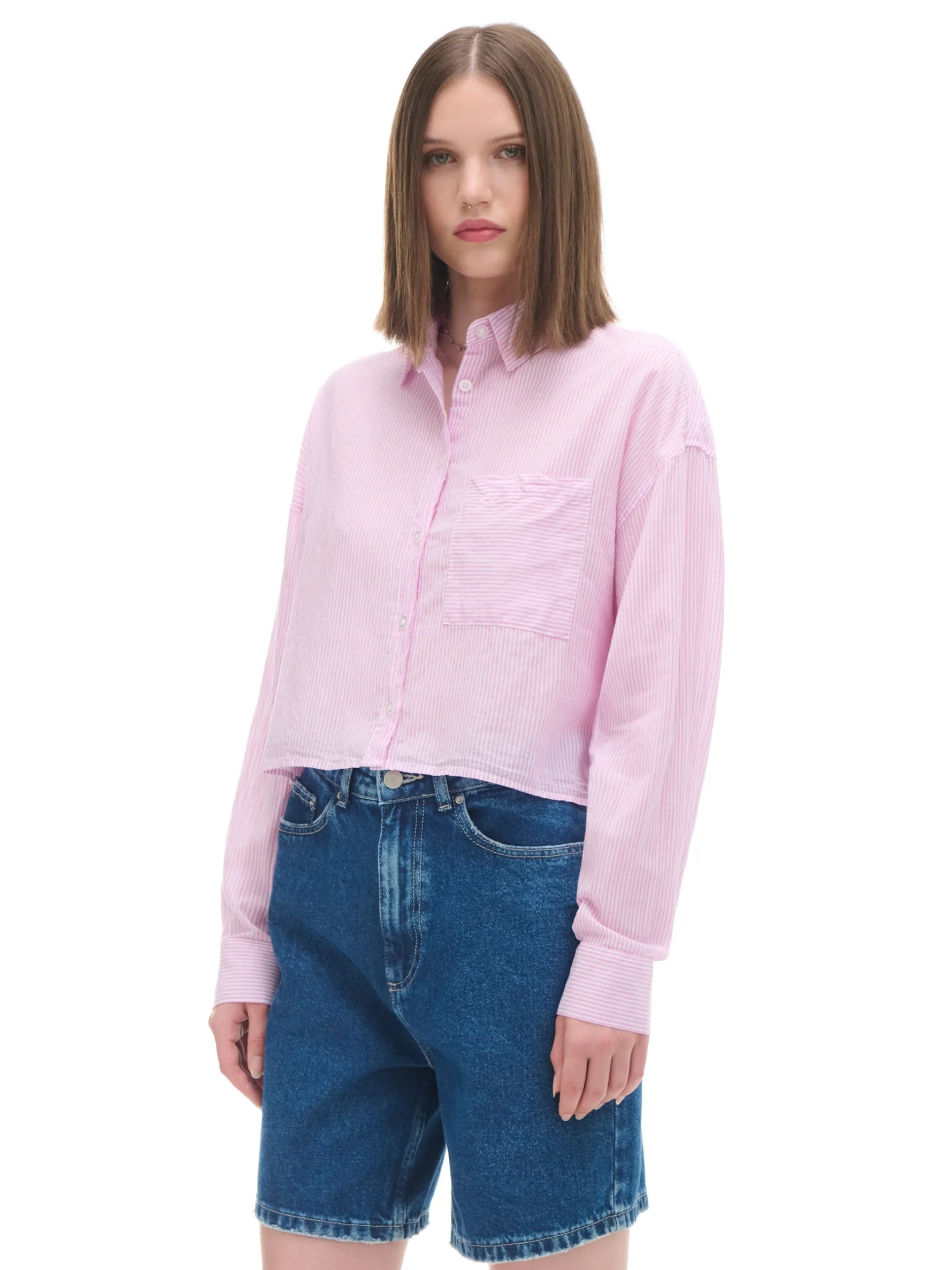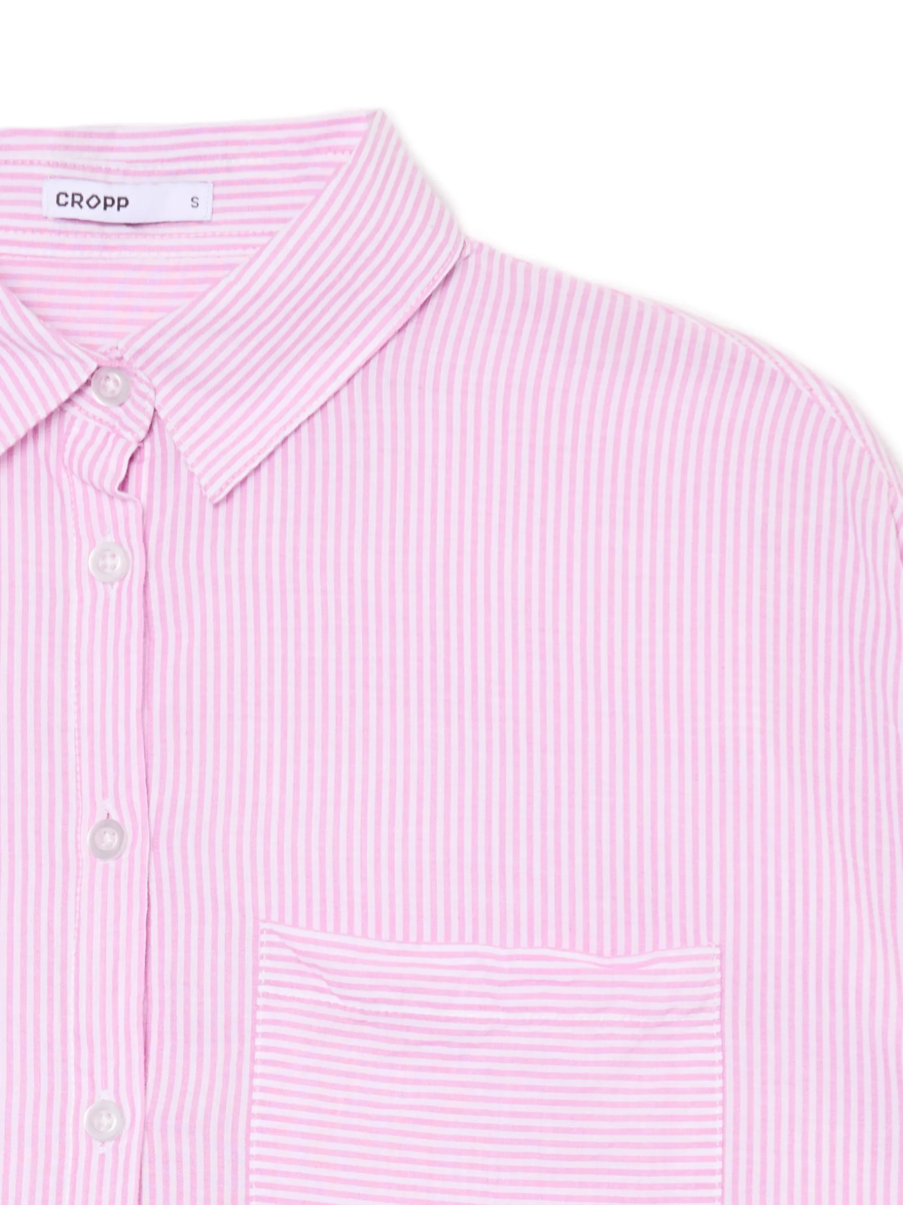 Damska koszula o krótszym kroju, uszyta z bawełny ze wzorem w paski. Dodatkowo na piersi wszyta kieszeń na drobiazgi. 100% bawełny krótki krój zapięcie na guziki na całej długości długie rękawy zakończone mankietem z guzikami klasyczny kołnierzyk kieszonka piersiowa wzór w paski na całości Wzrost modelki: 172 cm