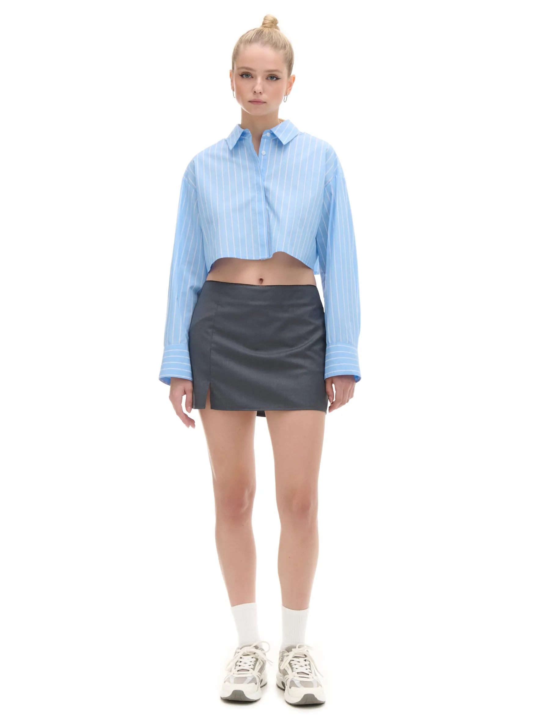 Damska koszula o krótszym kroju, uszyta z mieszanki dzianin z bawełną. Wzór w szerokie paski i oryginalny fason sprawiają, że ten item idealnie pasuje do casualowych stylizacji. dzianinowy materiał z bawełną krótszy krój jednorzędowe zapięcie na guziki klasyczny kołnierzyk długie rękawy zakończone mankietem z guzikami wzór w paski all over