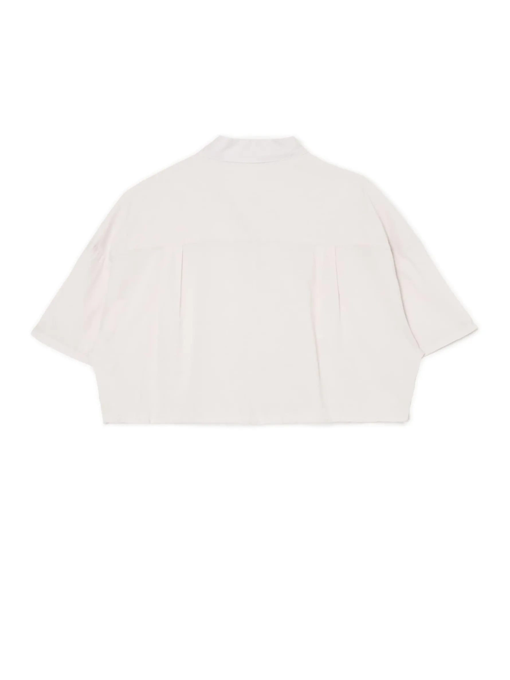 Damska koszula w kolorze kremowym, uszyta w 100% z lekkiej bawełnianej tkaniny. Możesz sparować ją z jeansami z wysokim stanem albo spódnicą mini – Twój wybór! obszerny, regularny krój zapięcie na guziki kołnierzyk pod szyją krótkie rękawy dwie kieszenie na piersiach Wzrost modelki: 172 cm