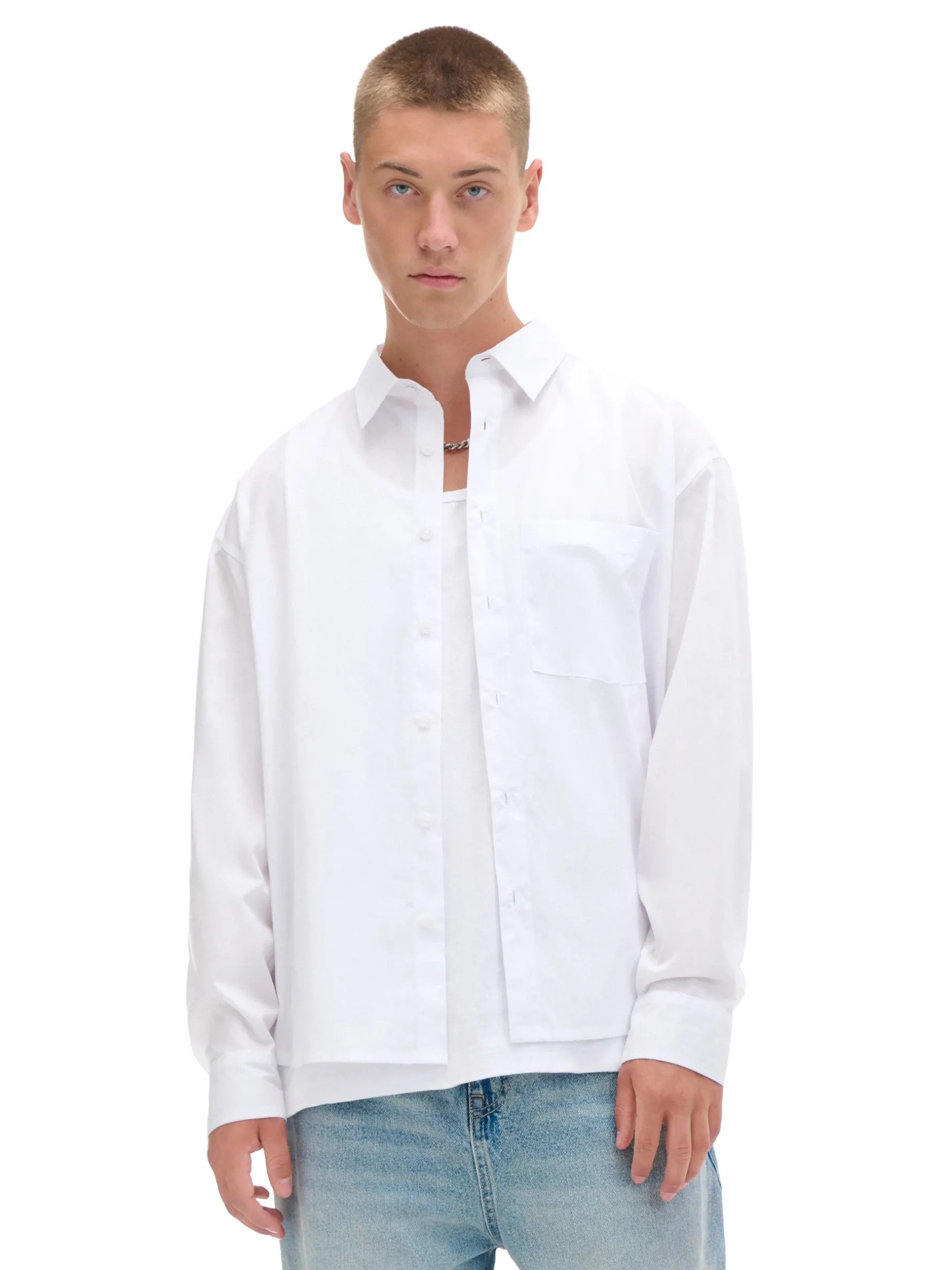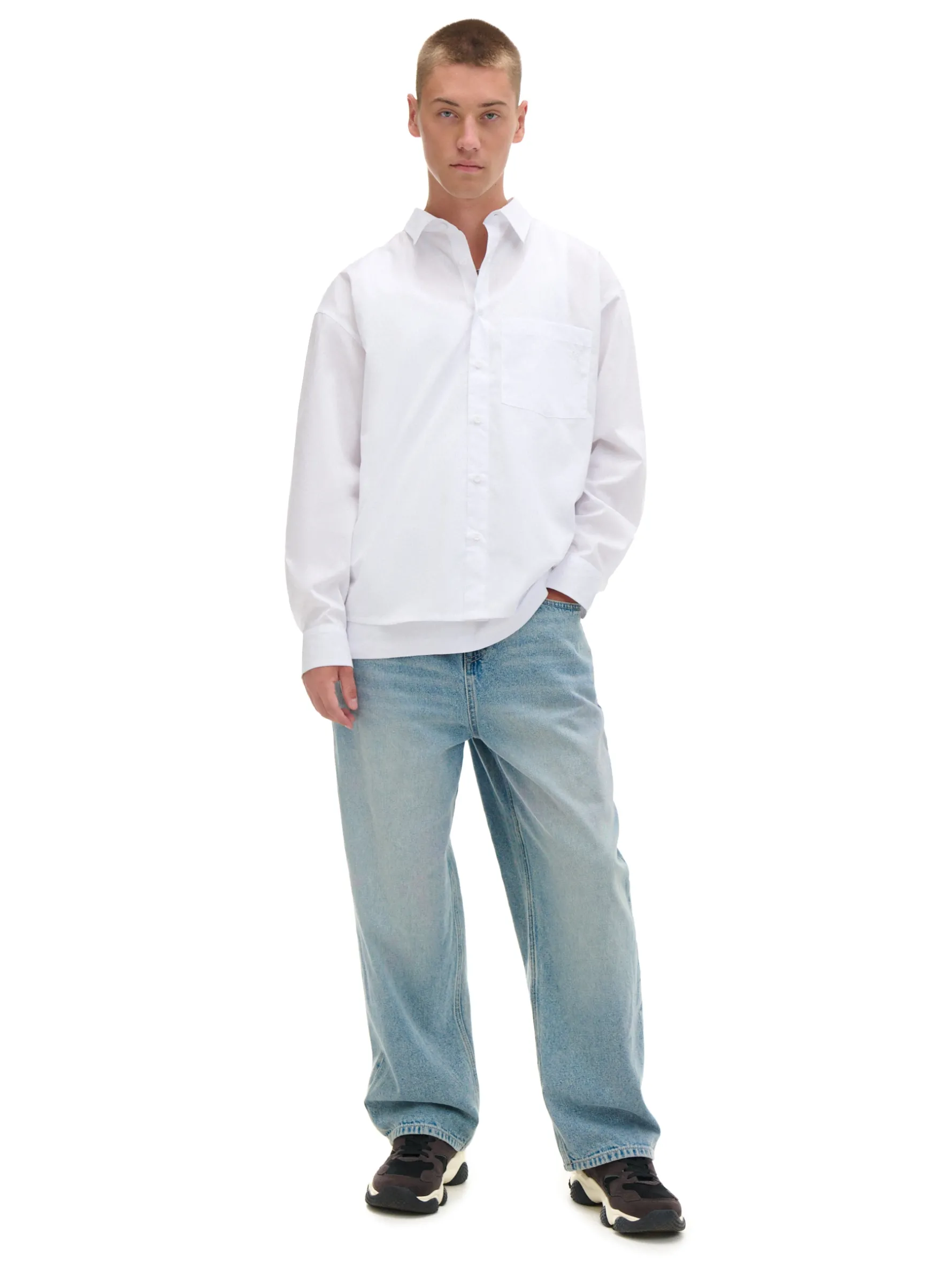 Biała męska koszula o kroju comfort z kołnierzykiem, uszyta z miękko wykończonej popeliny. Delikatny haft na kieszonce sprawia, że koszula pasuje do casualowej, jak i bardziej eleganckiej stylizacji. dzianinowy materiał z bawełną swobodny krój jednorzędowe zapięcie na guziki klasyczny kołnierzyk długie rękawy zakończone mankietem z guzikami kieszeń piersiowa niewielki haft z przodu Wzrost modela: 185 cm