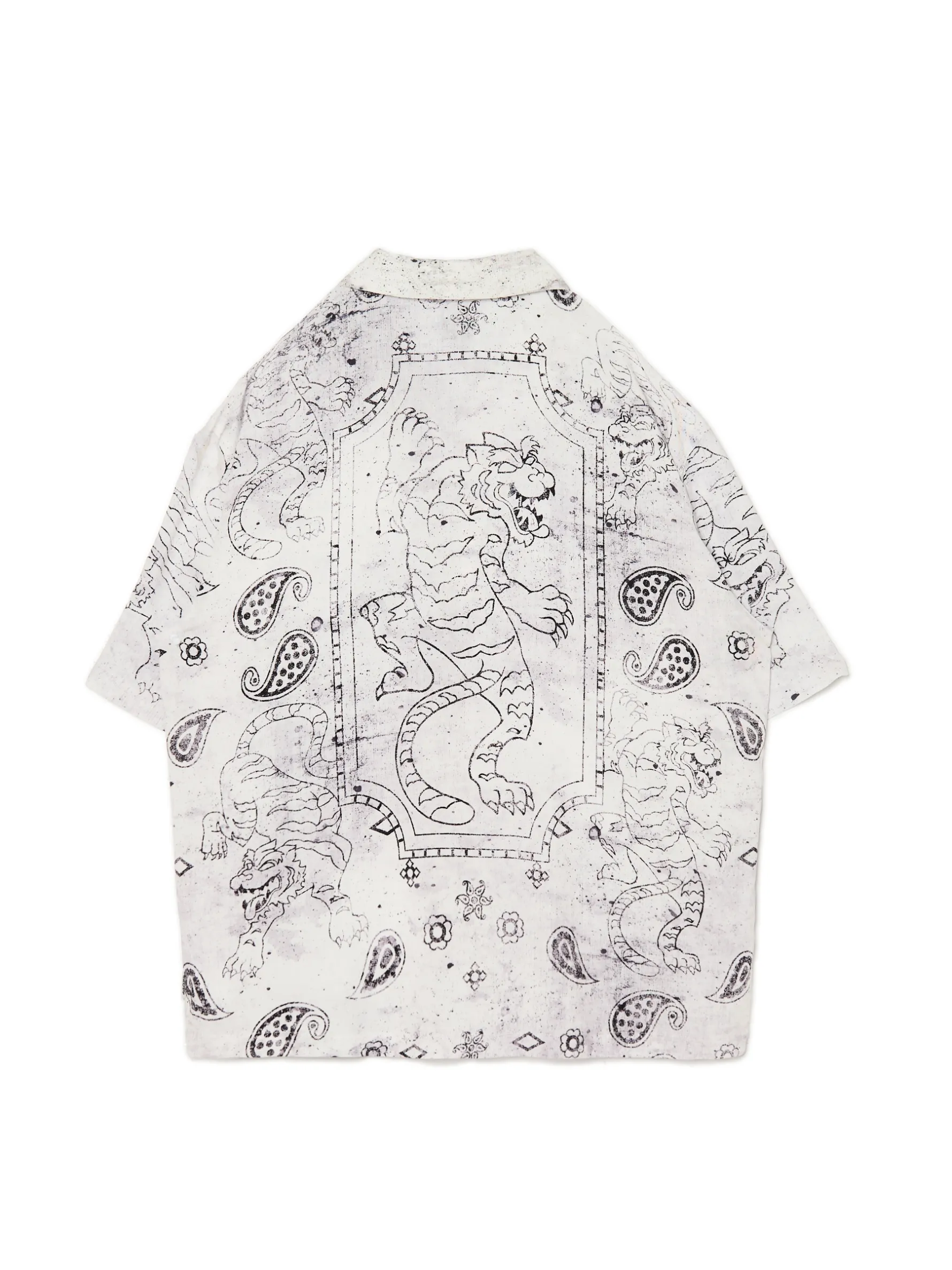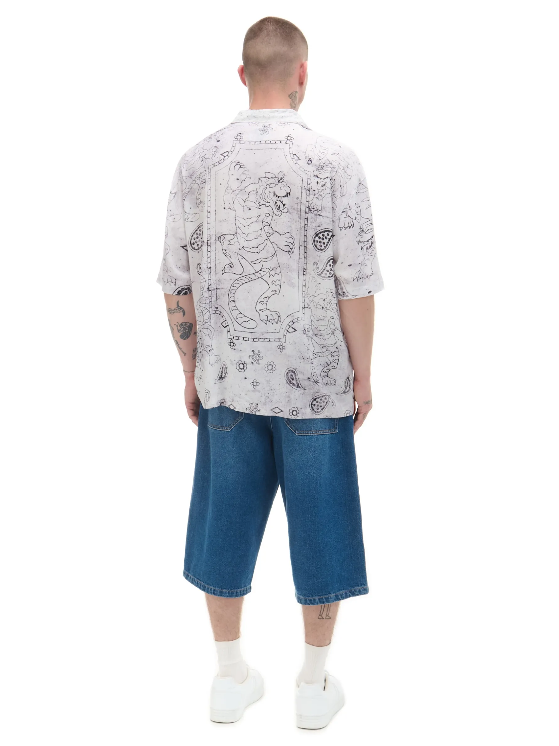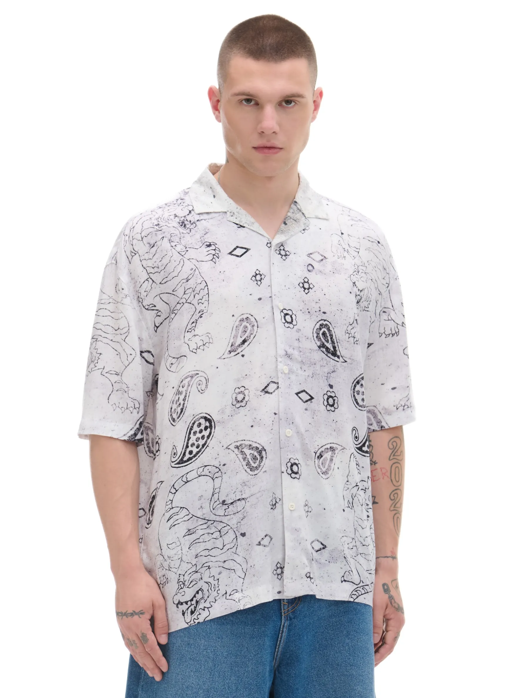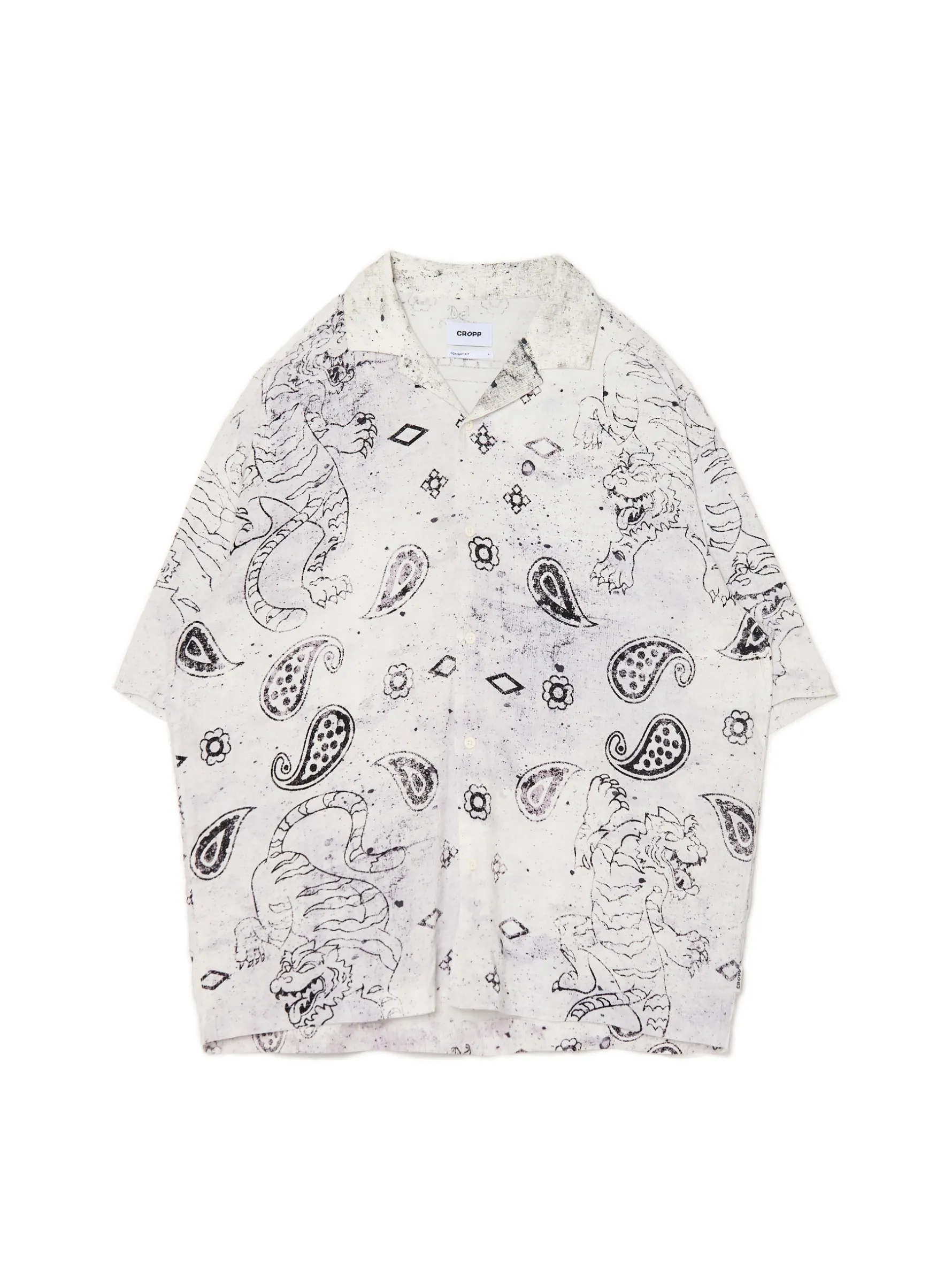 Męska biała koszula o kroju comfort, uszyta z lekkiego, wiskozowego materiału. Ozdobą jest wyjątkowy nadruk ze smokiem i elementami zgodnymi ze wzorem paisley. 100% wiskozy wygodny krój comfort jednorzędowe zapięcie na guziki kubański kołnierzyk krótkie, swobodne rękawy efektowny, malarski nadruk paisley na całości oryginalny print Model prezentuje produkt w rozmiarze M/L. Wzrost modela: 185 cm
