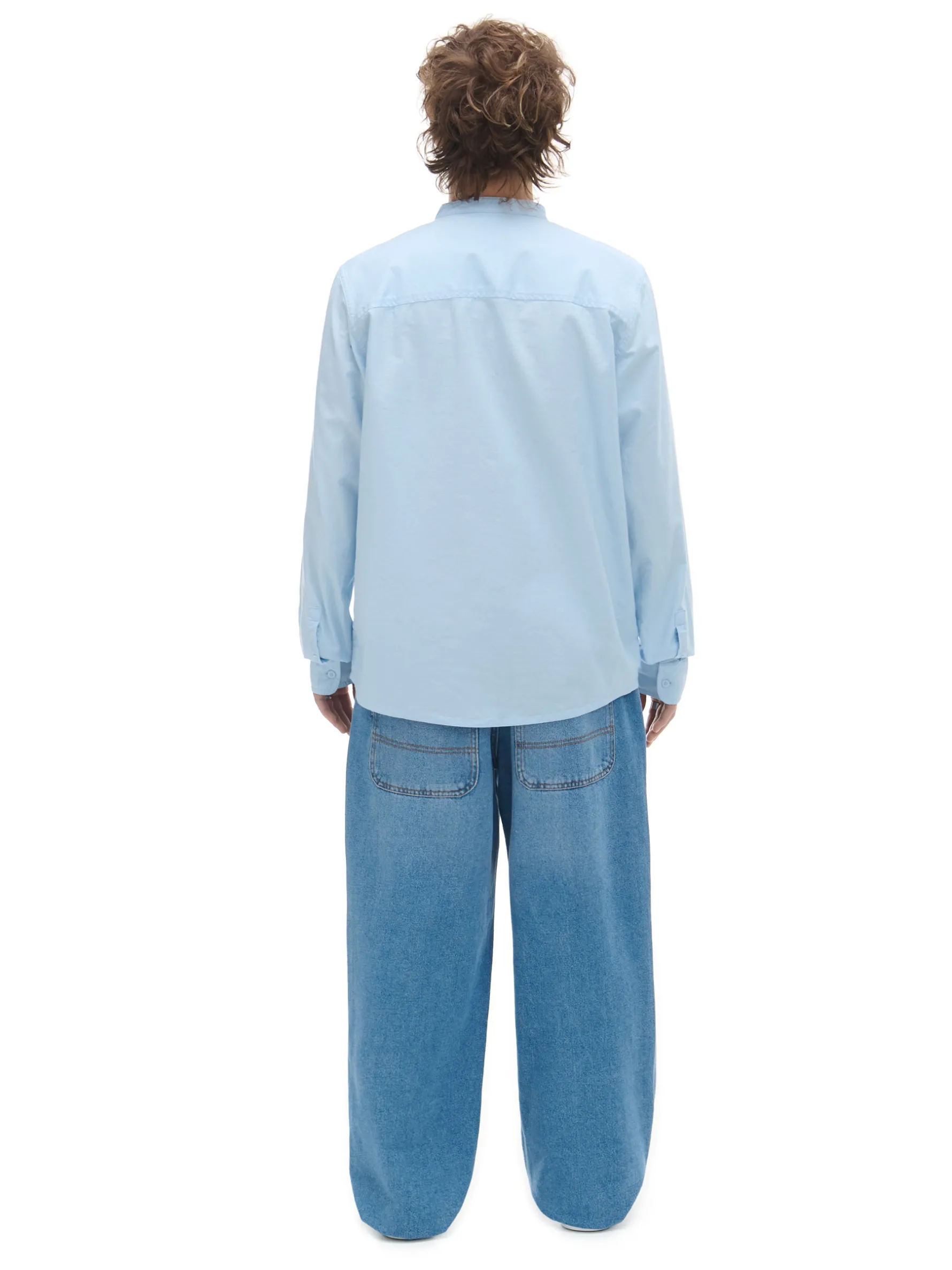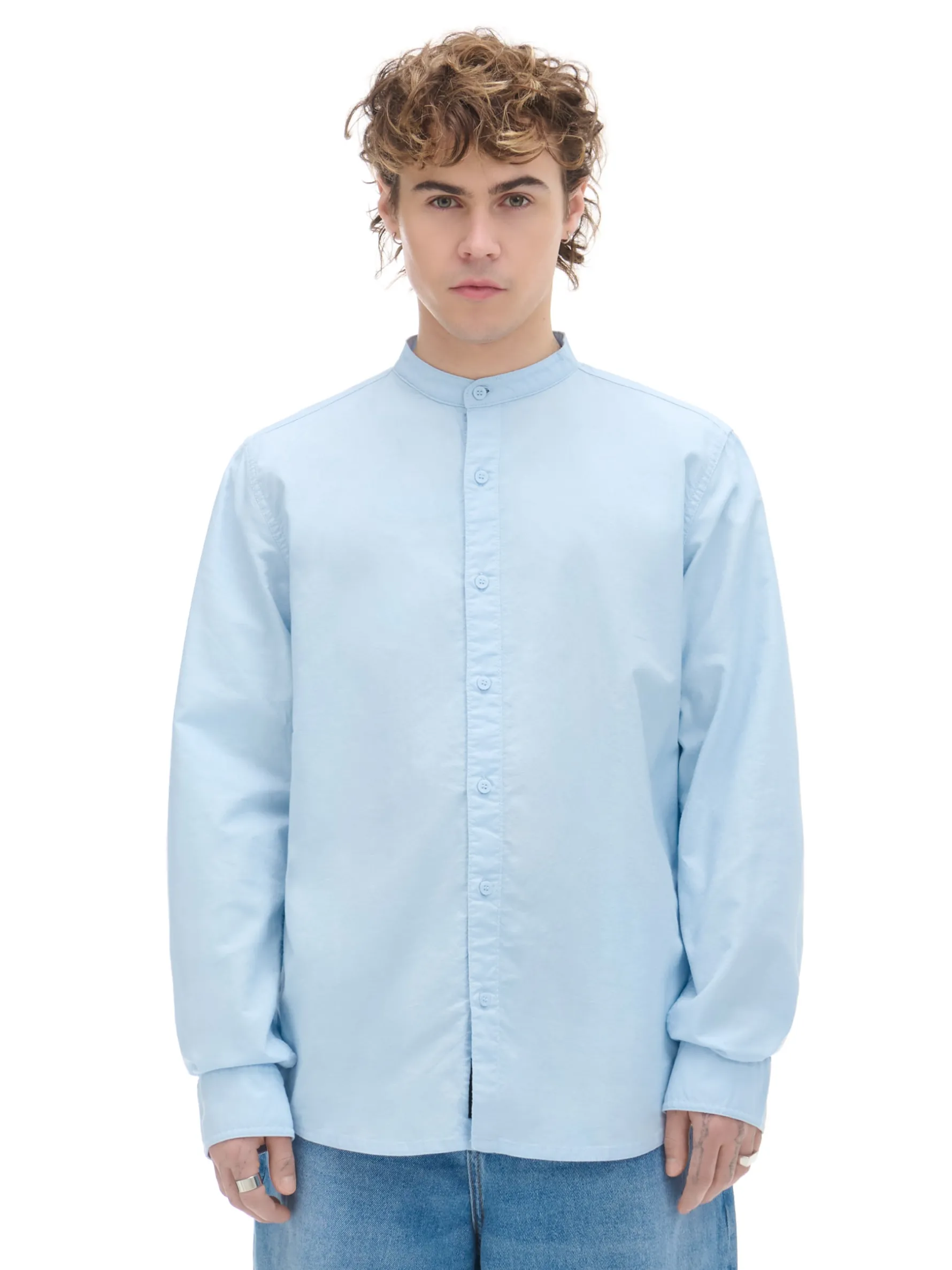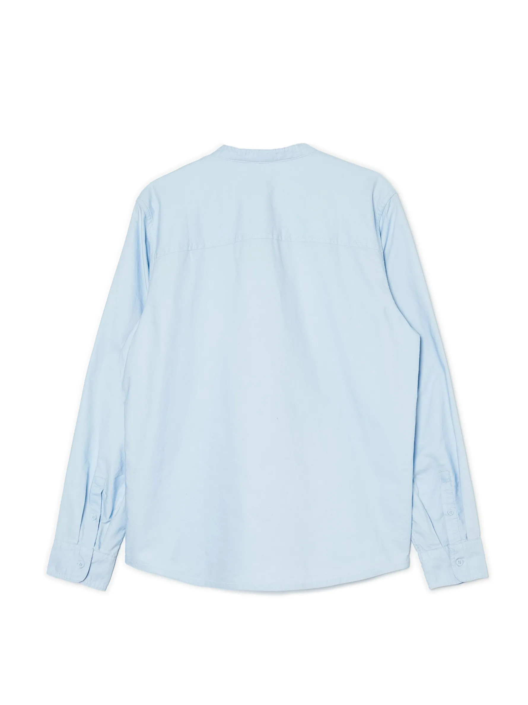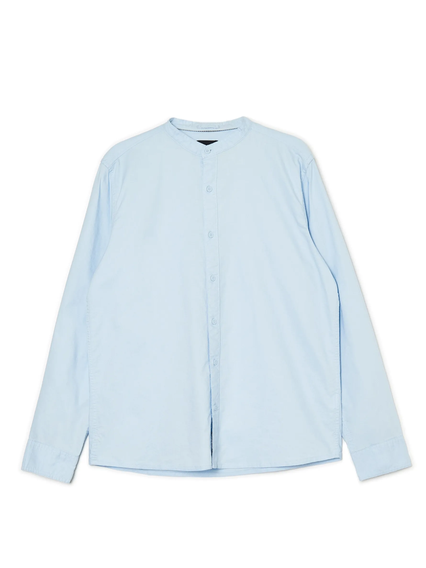 Błękitna męska koszula, uszyta w 100% z bawełny. regularny krój kołnierzyk typu mao zapięcie na guziki długie rękawy z mankietami zapinanymi na dwa guziki