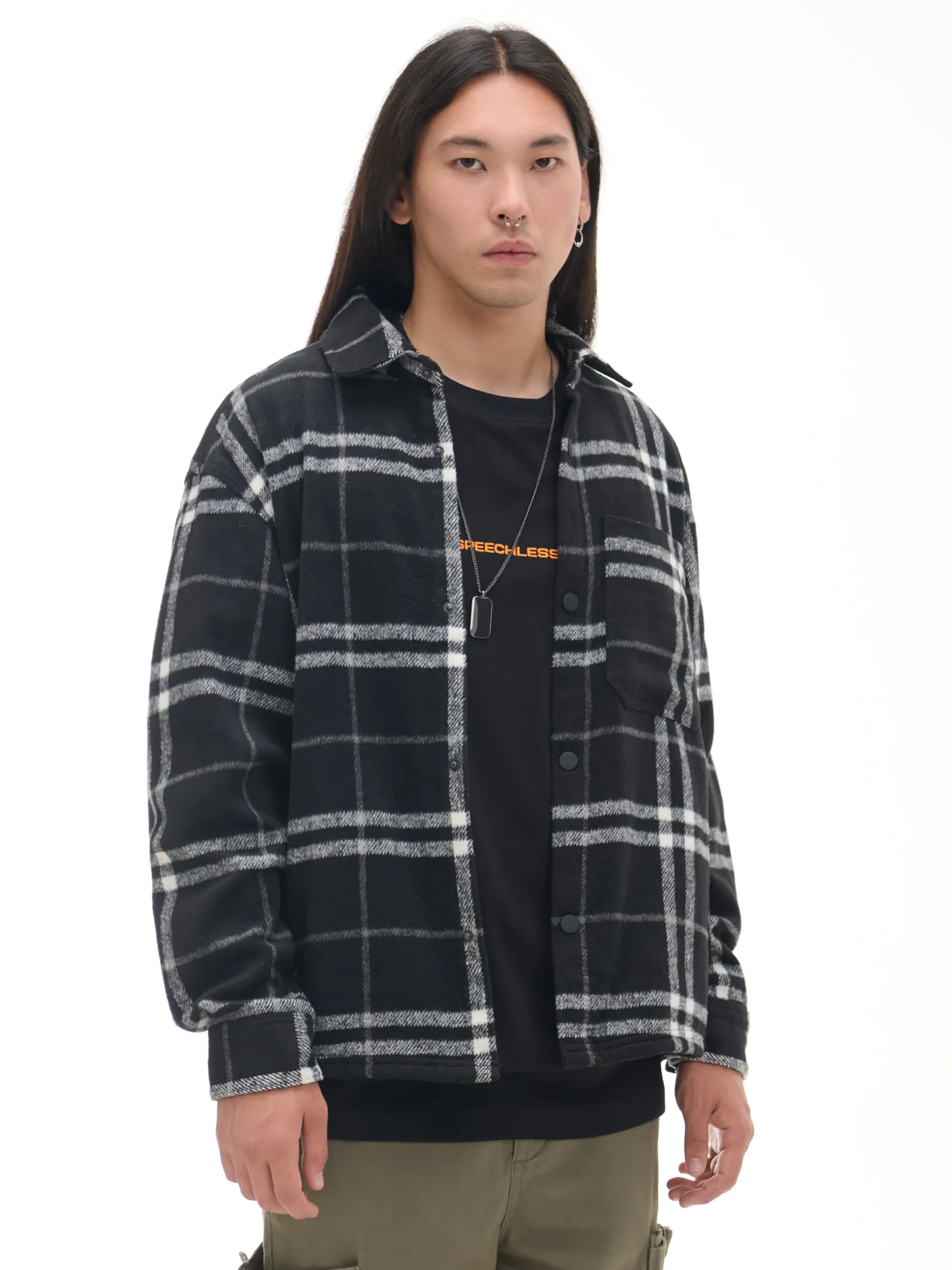 Solidna męska koszula uszyta z dzianiny zawierającej bawełnę, wiskozę oraz wełnę. Wyposażona w kieszeń na piersi i 2 kieszenie w szwach bocznych. Idealny item na casualowe lub bardziej okazjonalne wyjścia. uszyta z tkaniny w kratę miękkie i przyjemne w dotyku wykończenie krój oversize zapięcie na zatrzaski na całej długości kołnierz z otwartymi klapami długie rękawy z zatrzaskami przy mankietach kieszeń piersiowa praktyczne kieszenie wewnętrzne poręczny uchwyt na plecach mała naszywka z boku