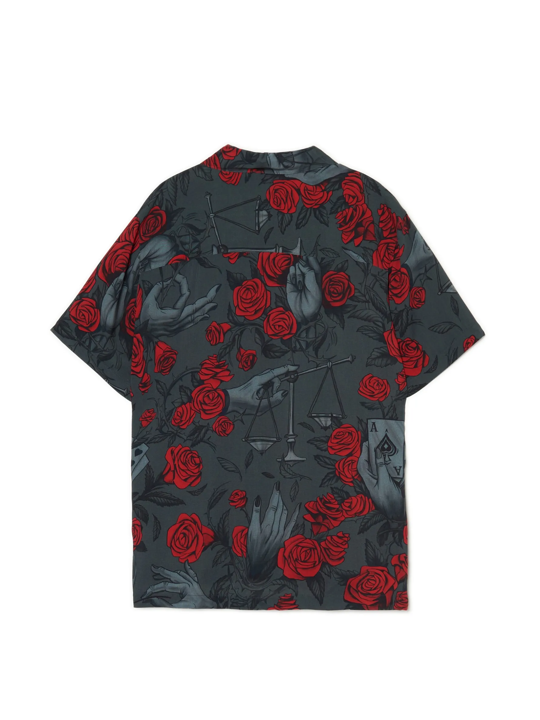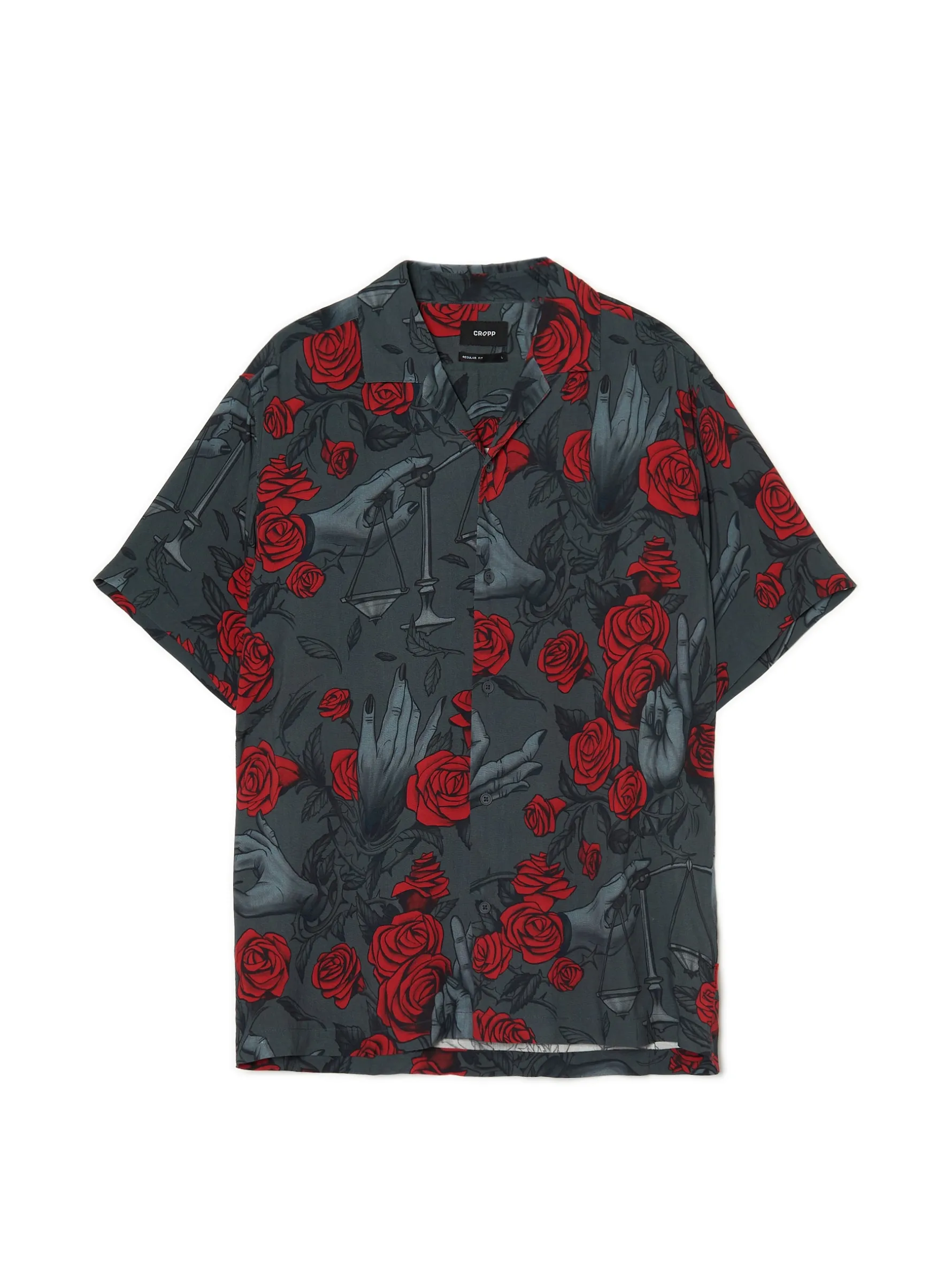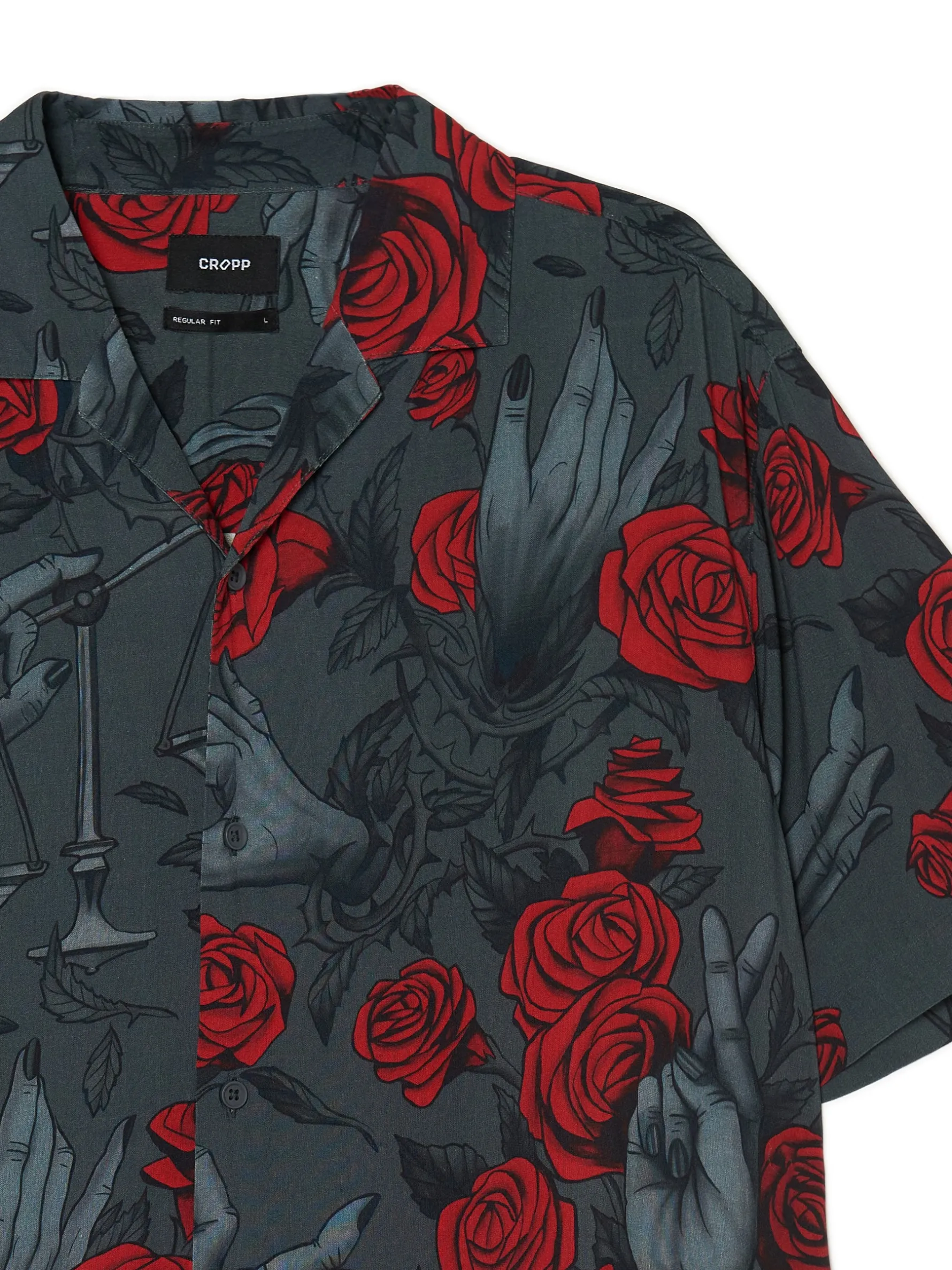 Męska czarna zwiewna koszula z kwiatowym motywem idealna na ciepłe wieczorne wyjścia. uszyta z lekkiej tkaniny swobodny, wygodny krój krótkie rękawy i luźny kołnierzyk