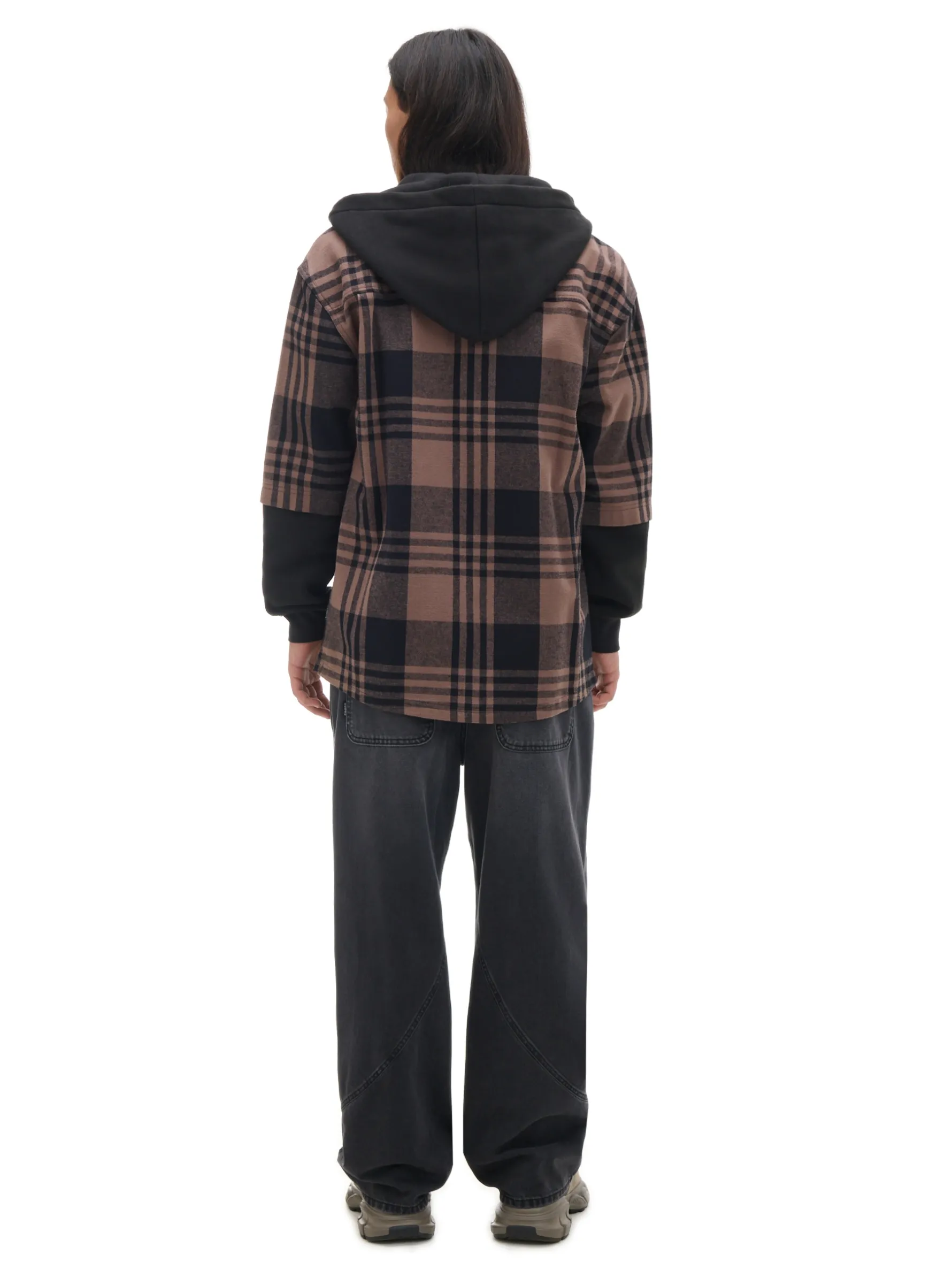 Męska koszula uszyta z grubszej tkaniny z rękawami i kapturem charakterystycznymi dla bluz typu hoodie. Look & vibe! uszyta z tkaniny z dodatkiem wiskozy swobodny, luźny krój praktyczne zapięcie na zatrzaski obszerny kaptur długie rękawy wykończone ściągaczami skośne kieszenie po bokach naszywana kieszeń na piersi ozdobne wstawki niewielki haft z przodu wzór w kratę