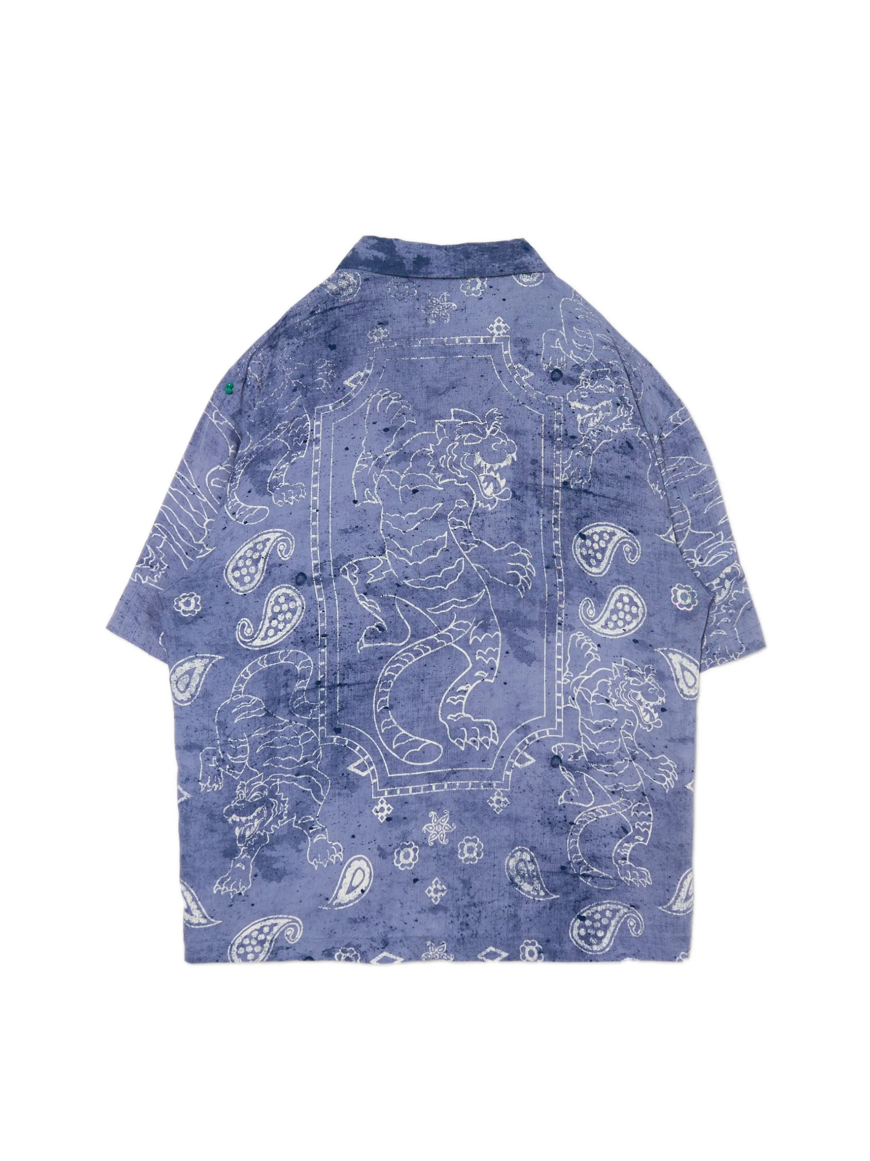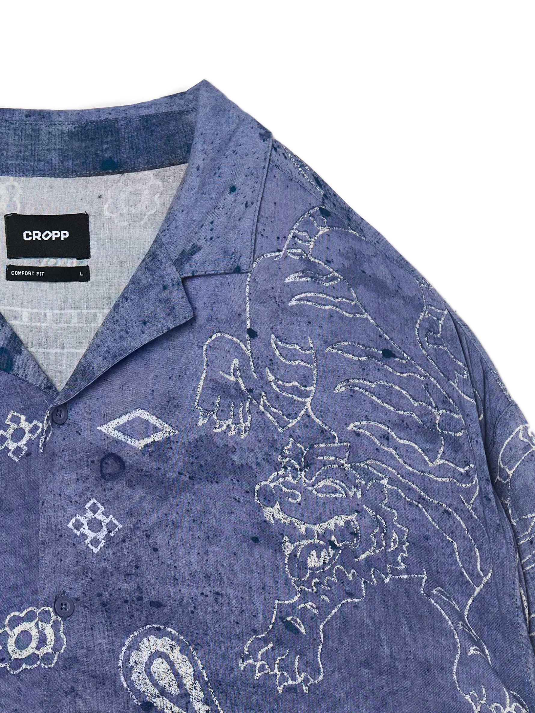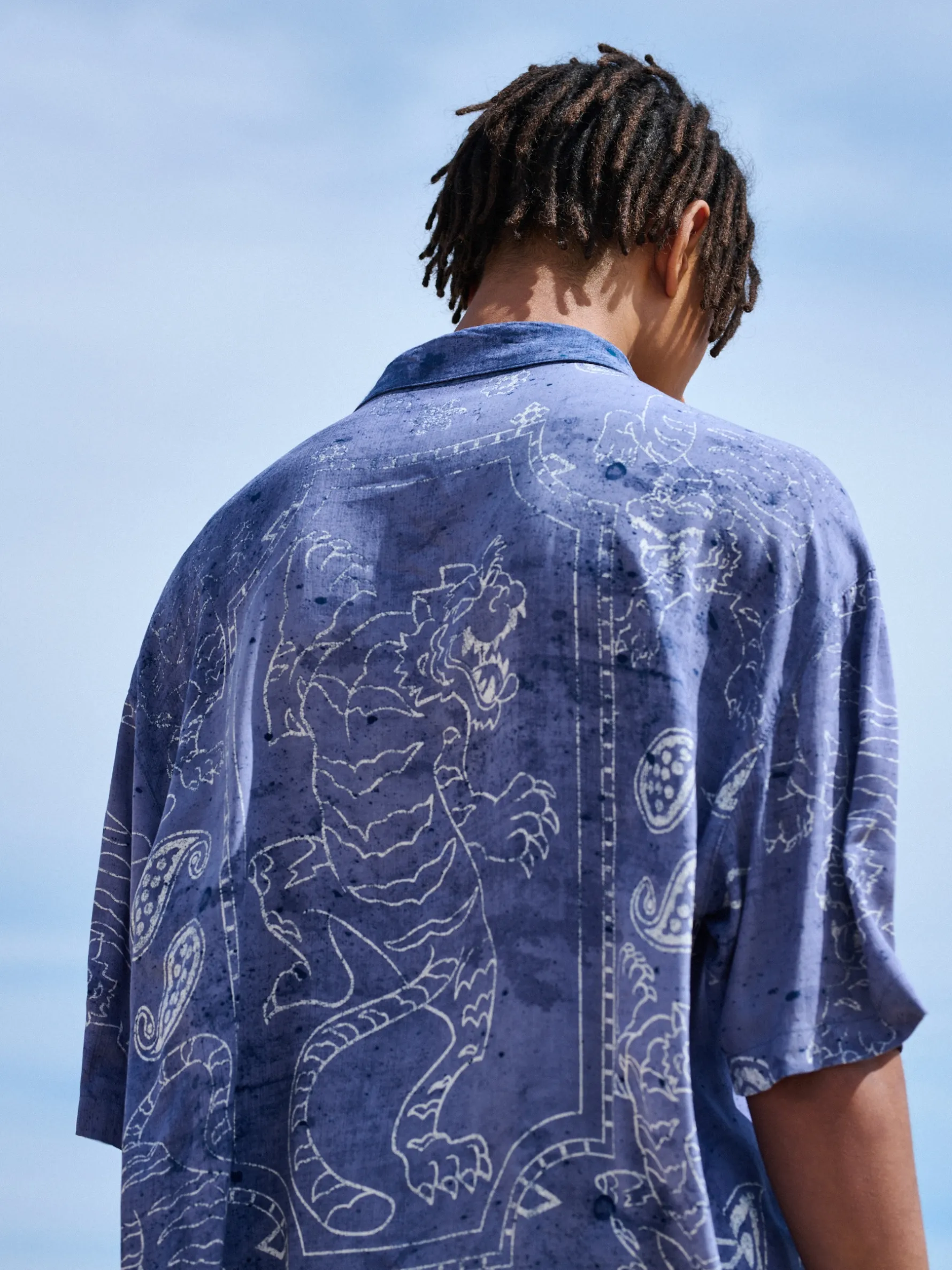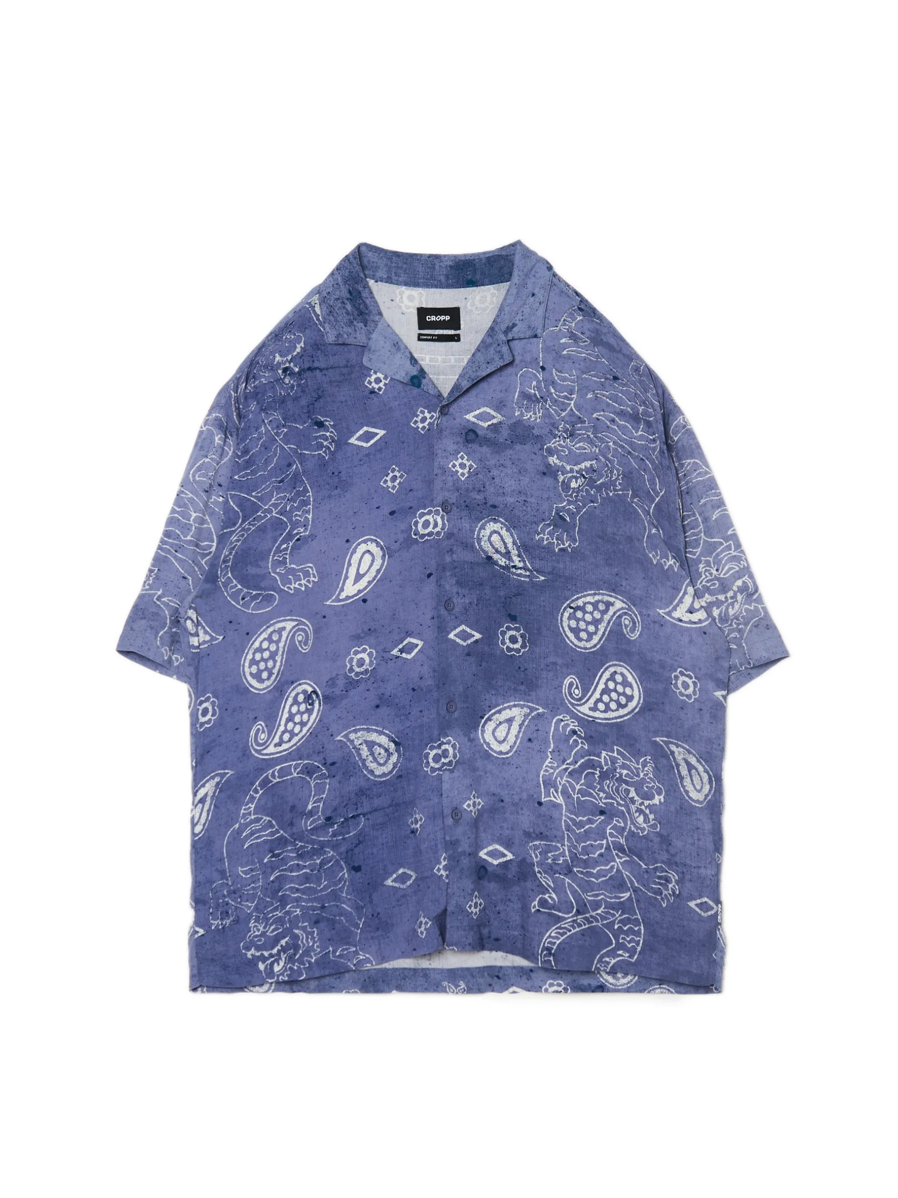 Męska niebieska koszula o kroju comfort, uszyta z lekkiego, wiskozowego materiału. Ozdobą jest wyjątkowy nadruk ze smokiem i elementami zgodnymi ze wzorem paisley. 100% wiskozy wygodny krój comfort jednorzędowe zapięcie na guziki kubański kołnierzyk krótkie, swobodne rękawy efektowny, malarski nadruk paisley na całości oryginalny print