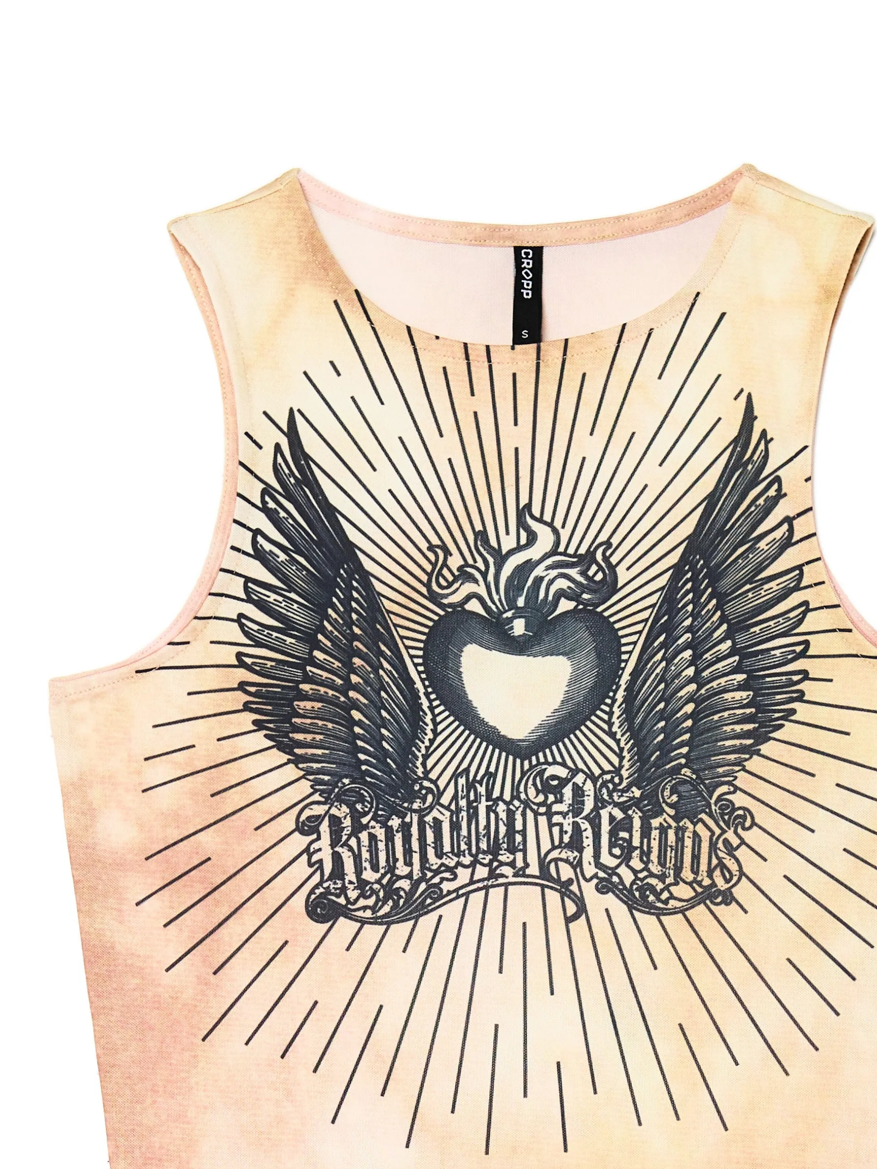 Damski top na ramiączkach z okrągłym dekoltem i printem dla rockowej dziewczyny.