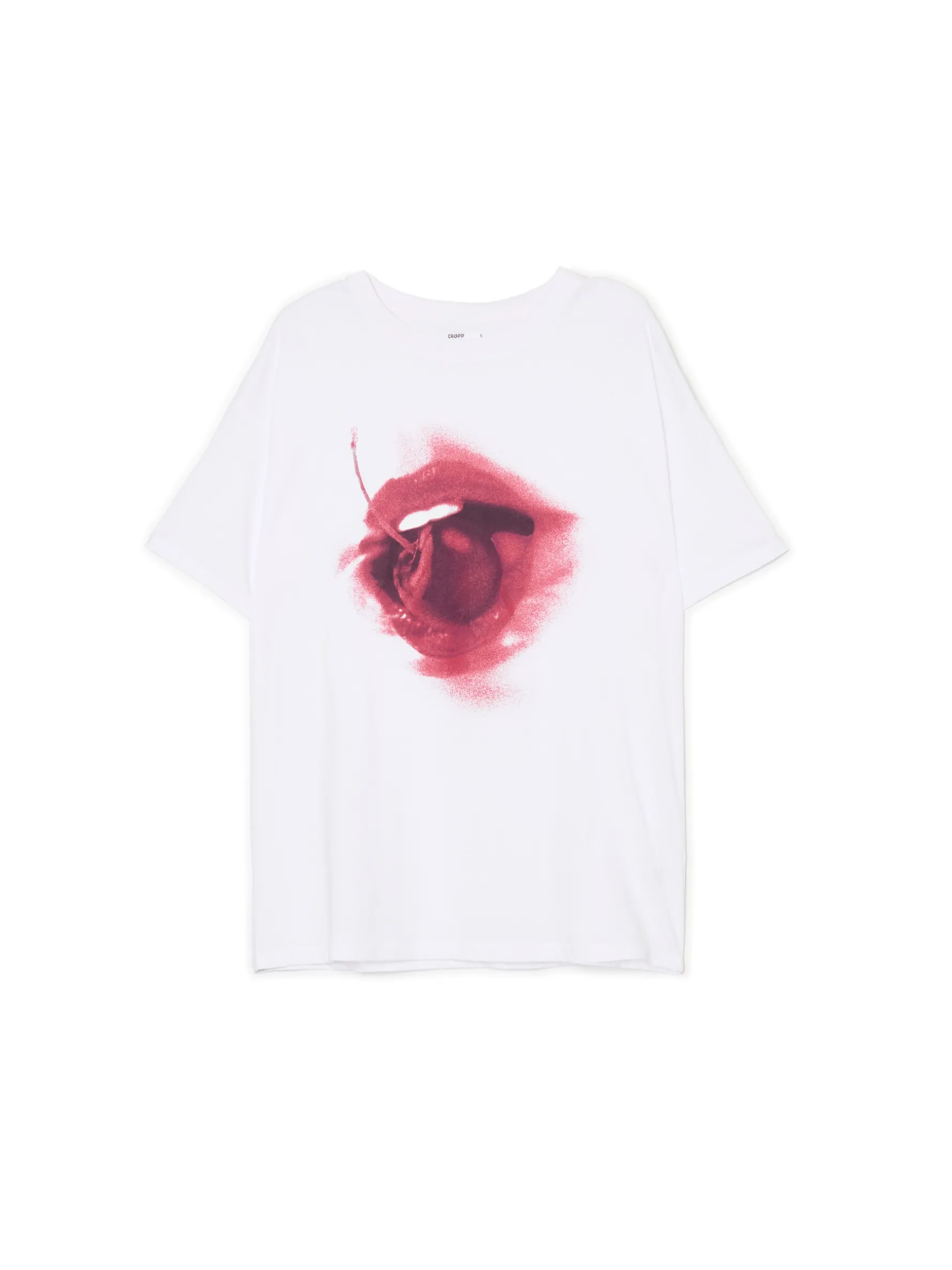 Czerwone, ponętne usta na damskiej koszulce z krótkim rękawem o kroju oversize. Wystarczy kilka kliknięć i są Twoje! 100% bawełny krój oversize krótkie, swobodne rękawy okrągły dekolt z lamówką oryginalny print