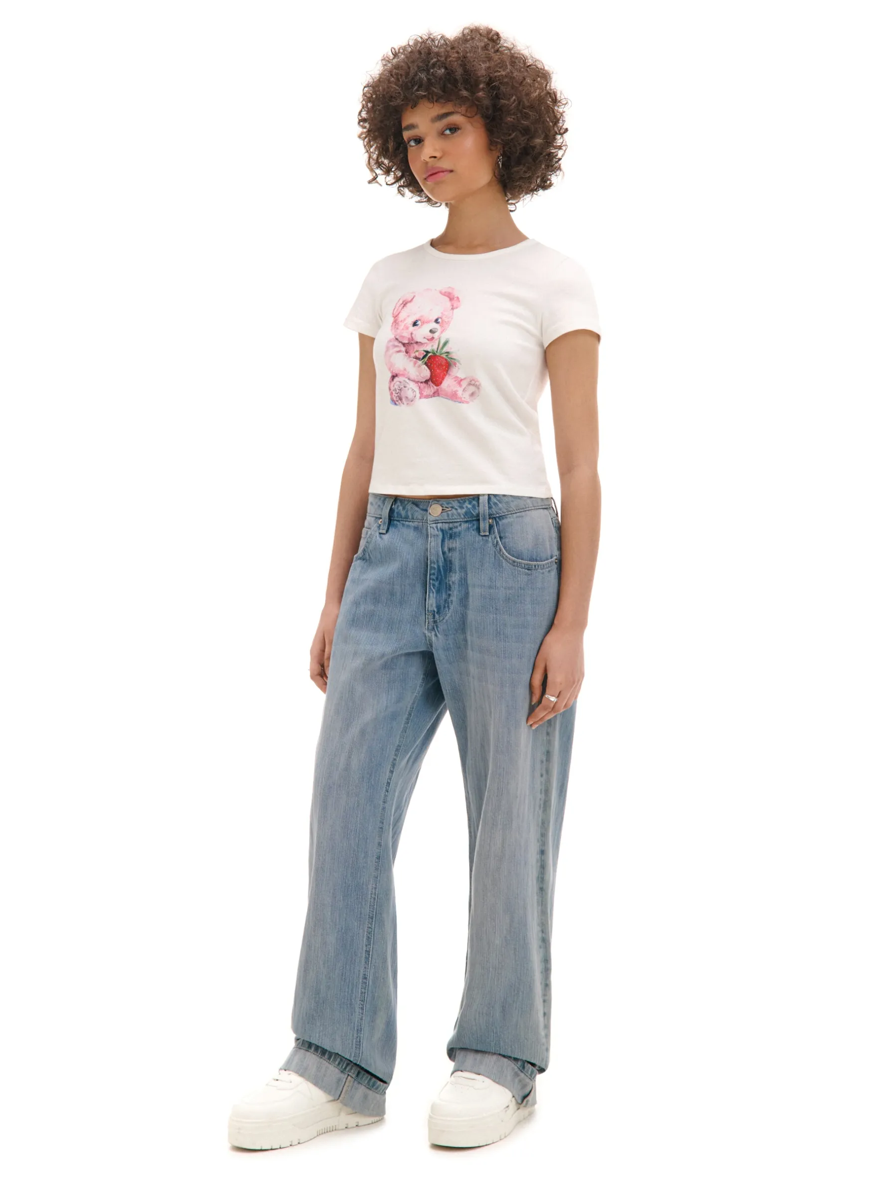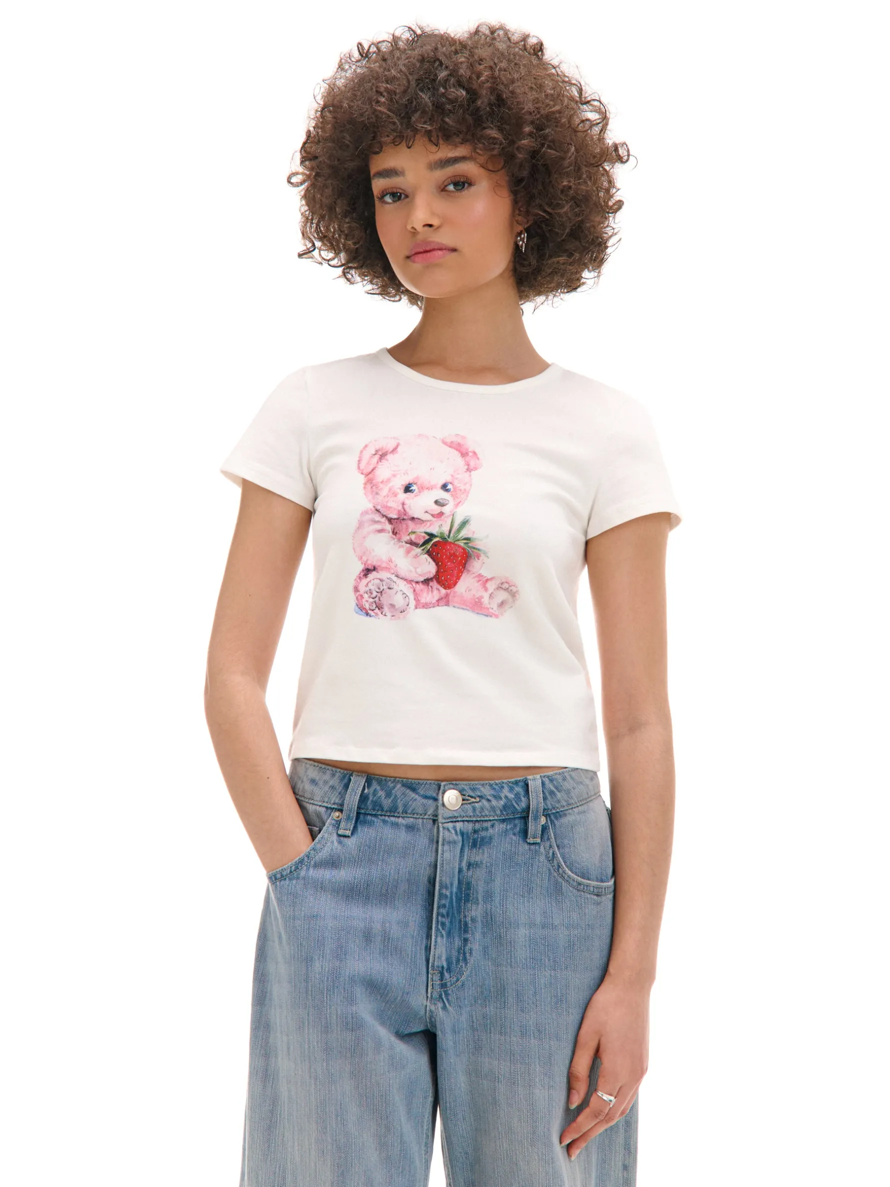 Damski T-shirt z krótkim rękawem uszyty z bawełnianej tkaniny z dodatkiem elastycznych włókien. Na przodzie duży nadruk z uroczym, różowym misiem trzymającym truskawkę. Wrzuć słodziaka do koszyka! bawełna z dodatkiem elastycznych włókien dopasowany krój podkreślający sylwetkę okrągły dekolt krótkie, ścięte rękawy oryginalny print