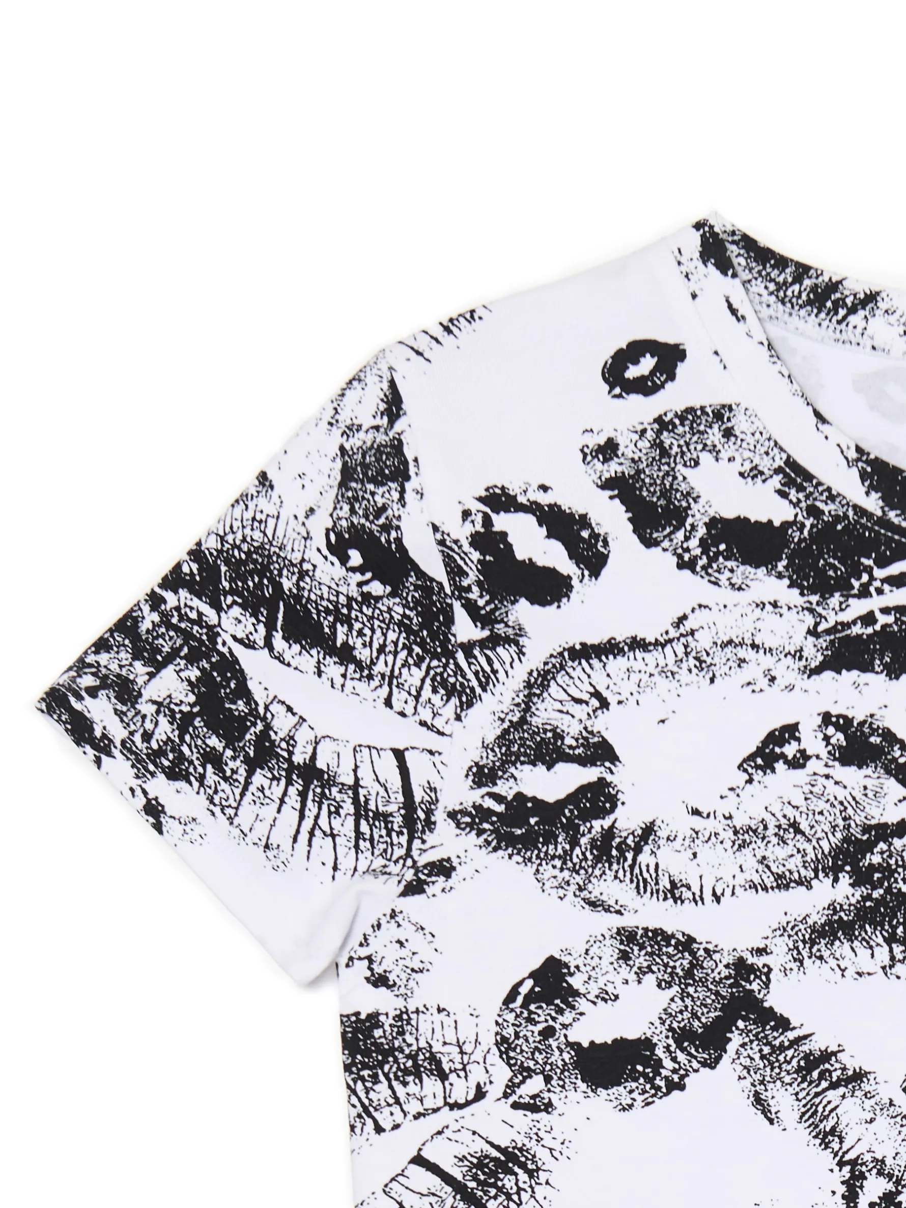 Damski T-shirt, uszyty z mieszanki bawełny i elastycznych włókien. dopasowany, krótki krój zabudowany, półokrągły dekolt krótkie rękawy nadruk z motywem ust all over