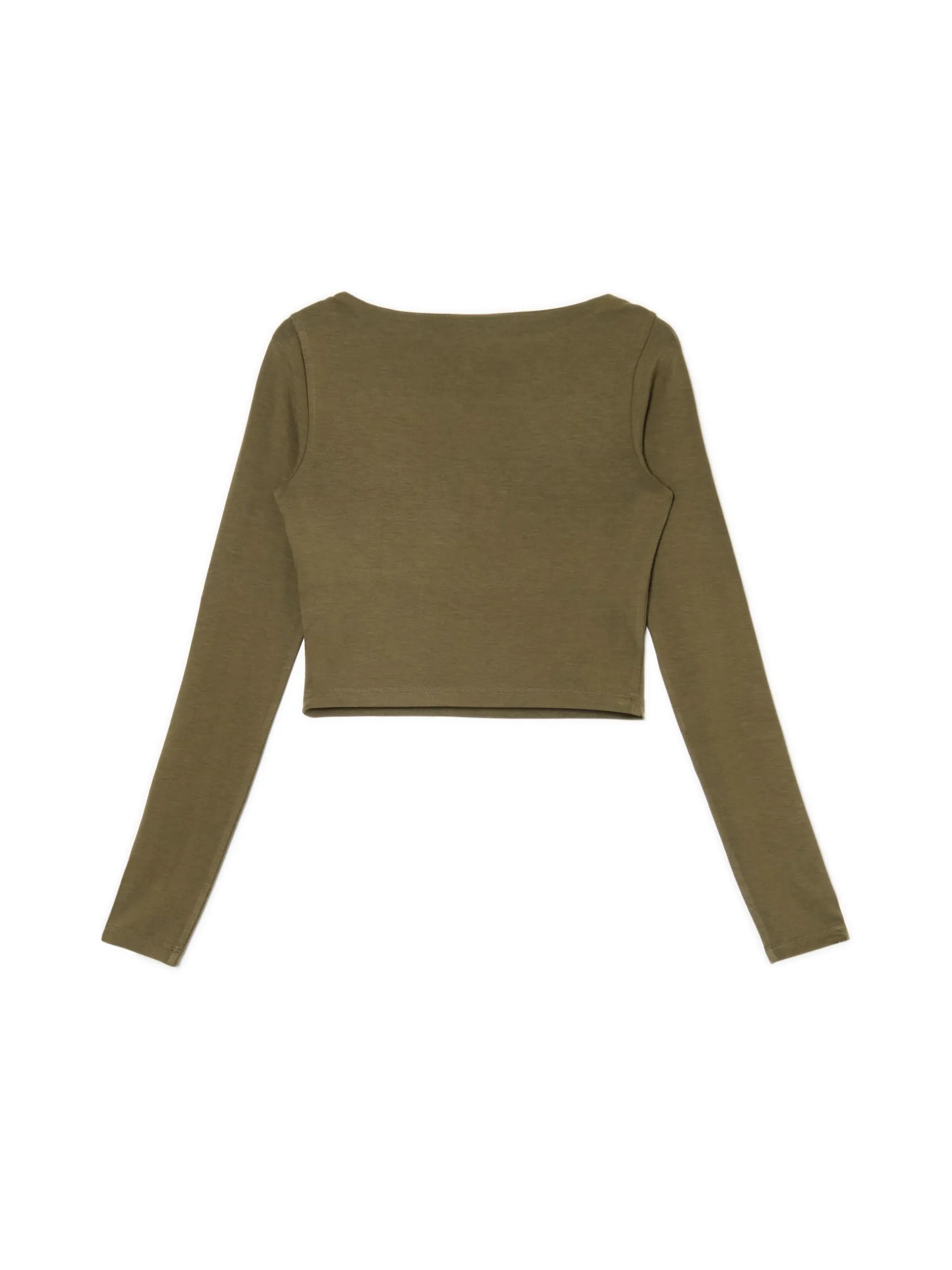 Damska bluzka z długimi rękawami o krótszym, dopasowanym fasonie z dekoltem w łódkę. Idealny item na chłodniejsze wieczory. wiskoza z domieszką elastycznych włókien dopasowany krój podkreślający sylwetkę dekolt w łódkę długie, dopasowane rękawy Wzrost modelki: 177 cm