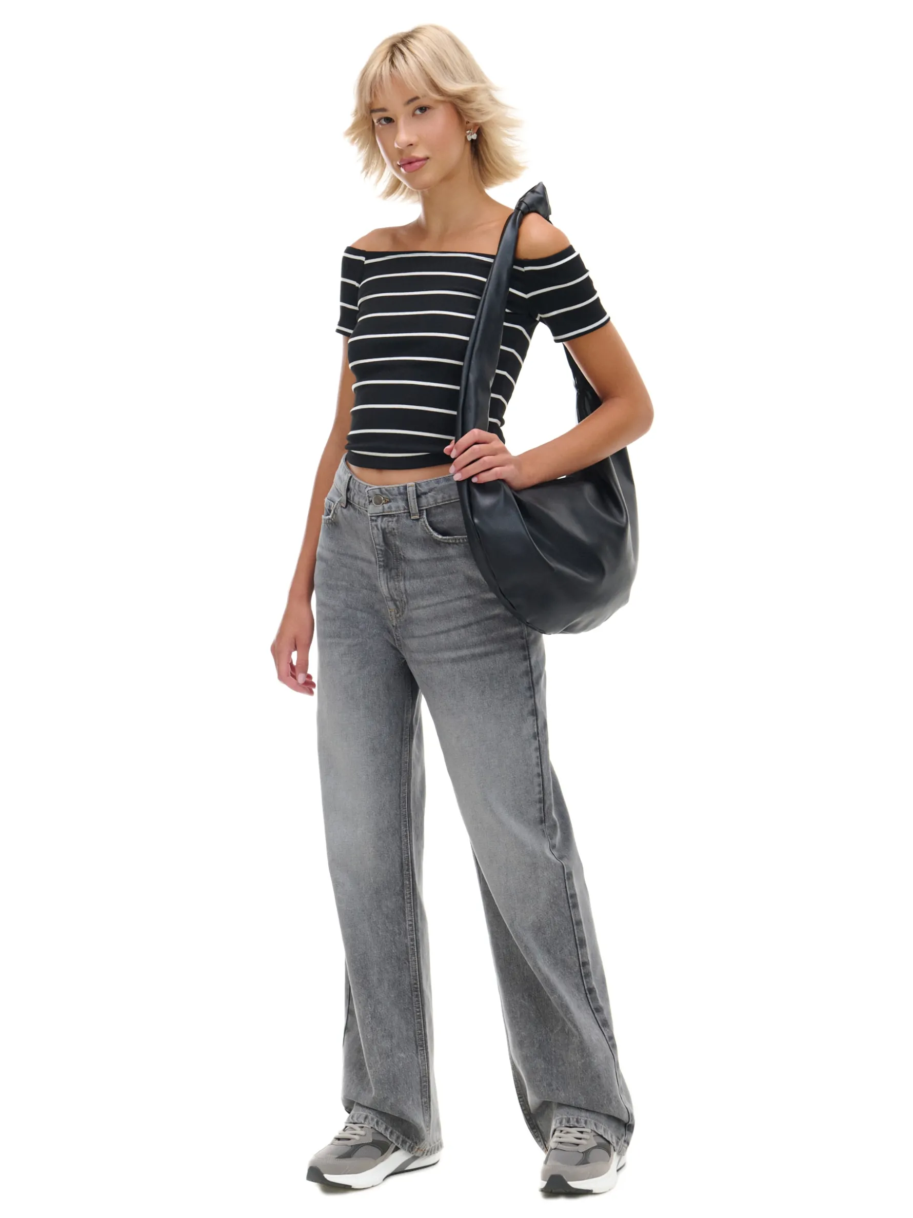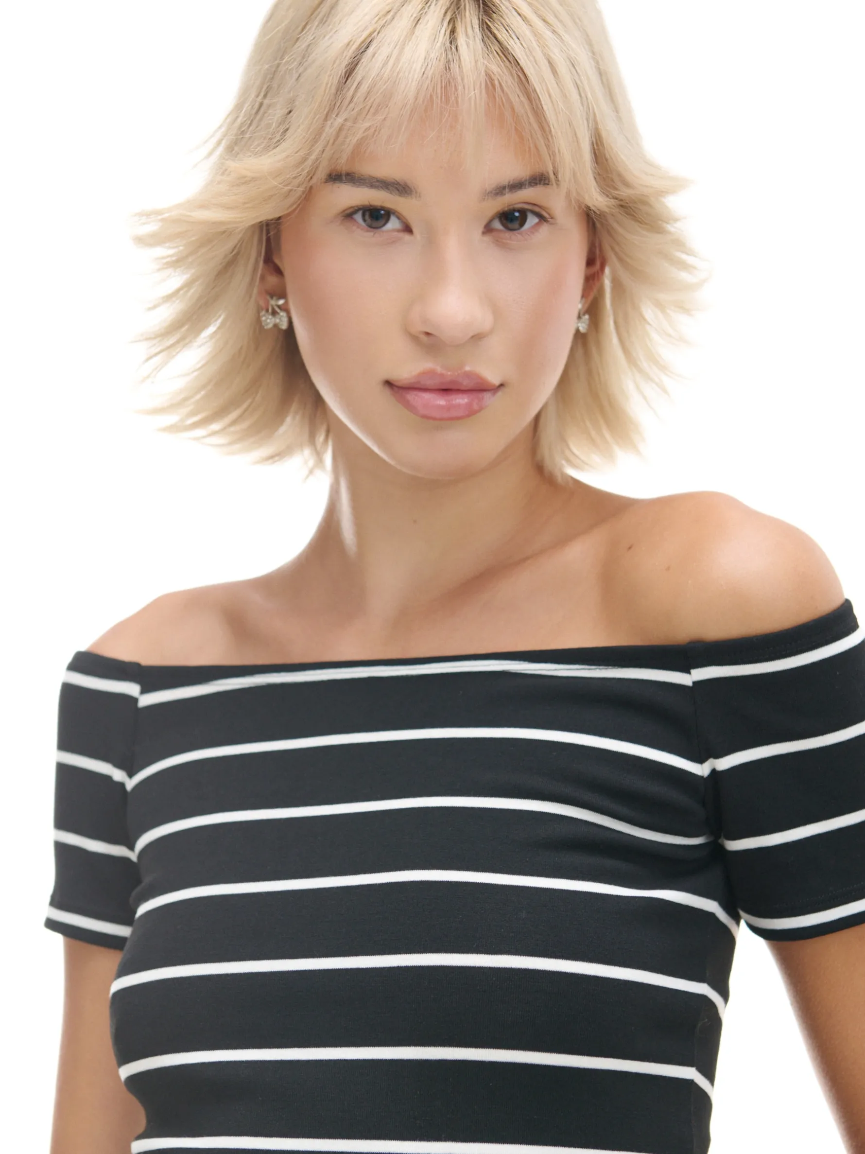 Bluzka damska z krótkim rękawem uszyta z lekkiej dzianiny ze wzorem w paski. Idealna na spontaniczne wypady z kumpelą. lekki materiał z wiskozą dopasowany krój podkreślający sylwetkę dekolt w łódkę krótkie, ścięte rękawy opadające ramiona wzór w paski na całości Wzrost modelki: 177 cm