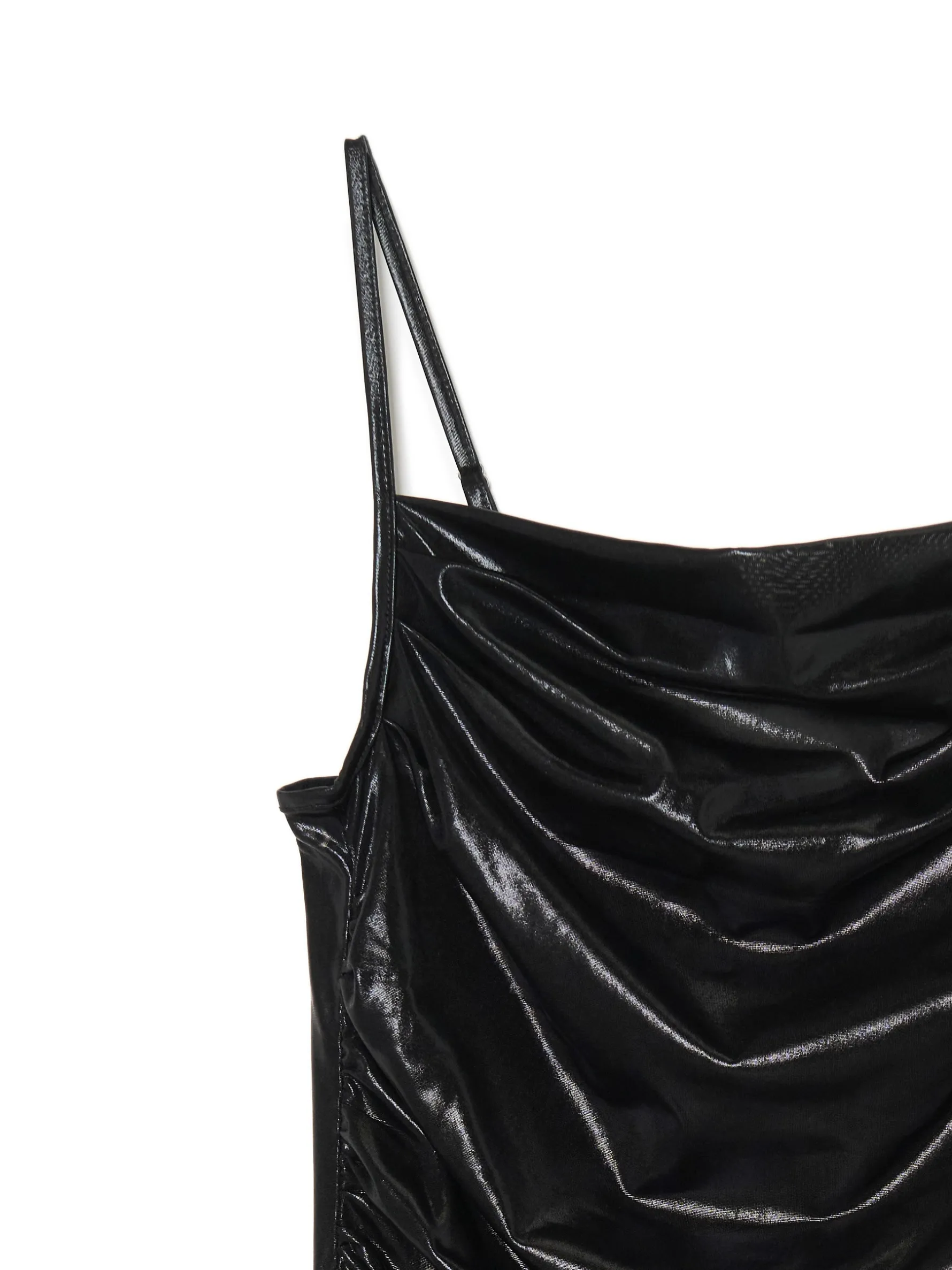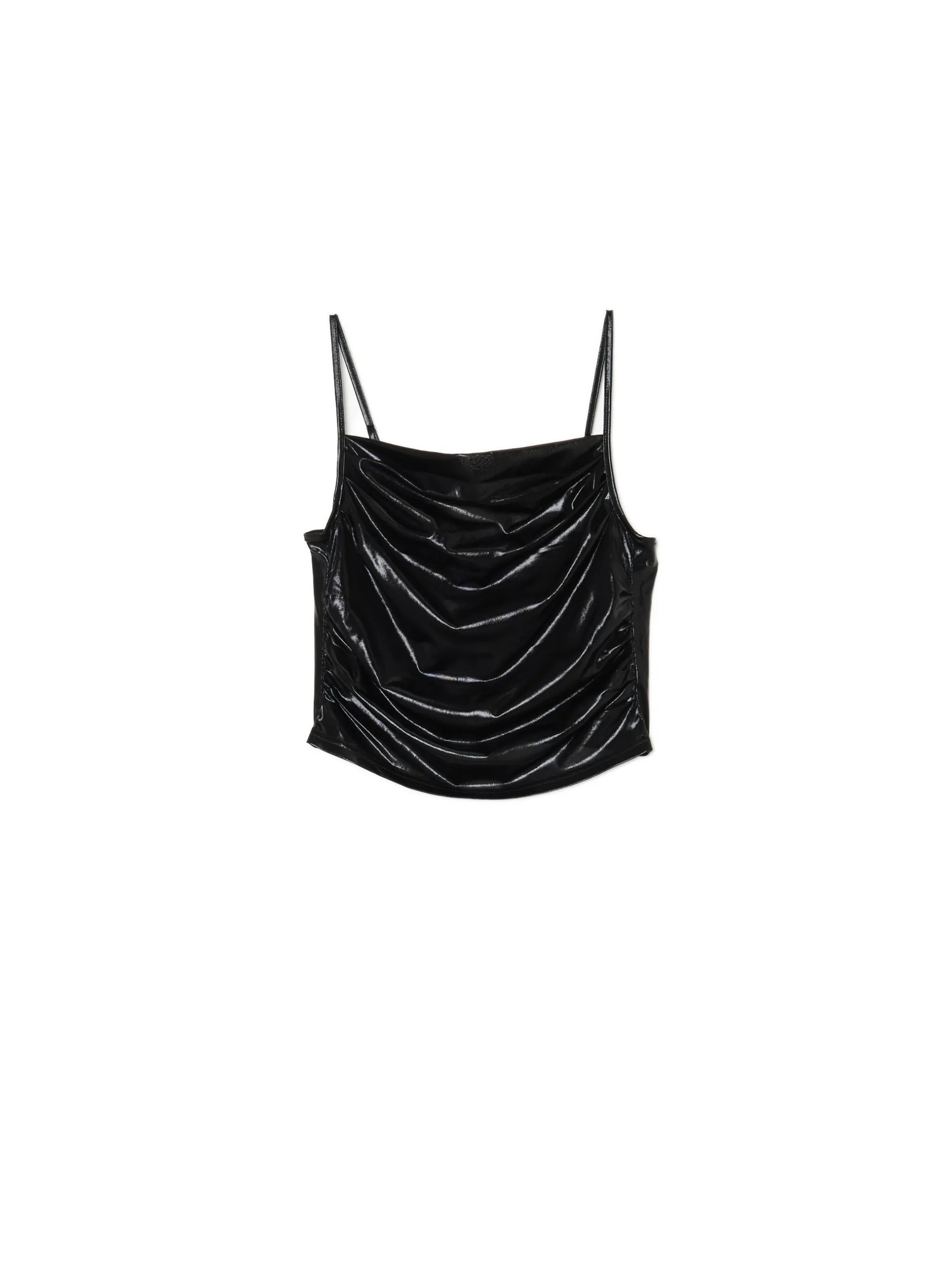 Szukasz ciekawych stylizacji na Sylwestra? Łap top z regulowanymi, cienkimi ramiączkami. Uszyty z mieszanki dzianin z dodatkiem elastycznym włókien. Dzięki temu model pięknie układa się na sylwetce. W tym itemie zabłyśniesz na imprezie! dzianina z domieszką elastycznych włókien dopasowany krój podkreślający sylwetkę wąskie ramiączka z regulacją długości ozdobne marszczenie z przodu