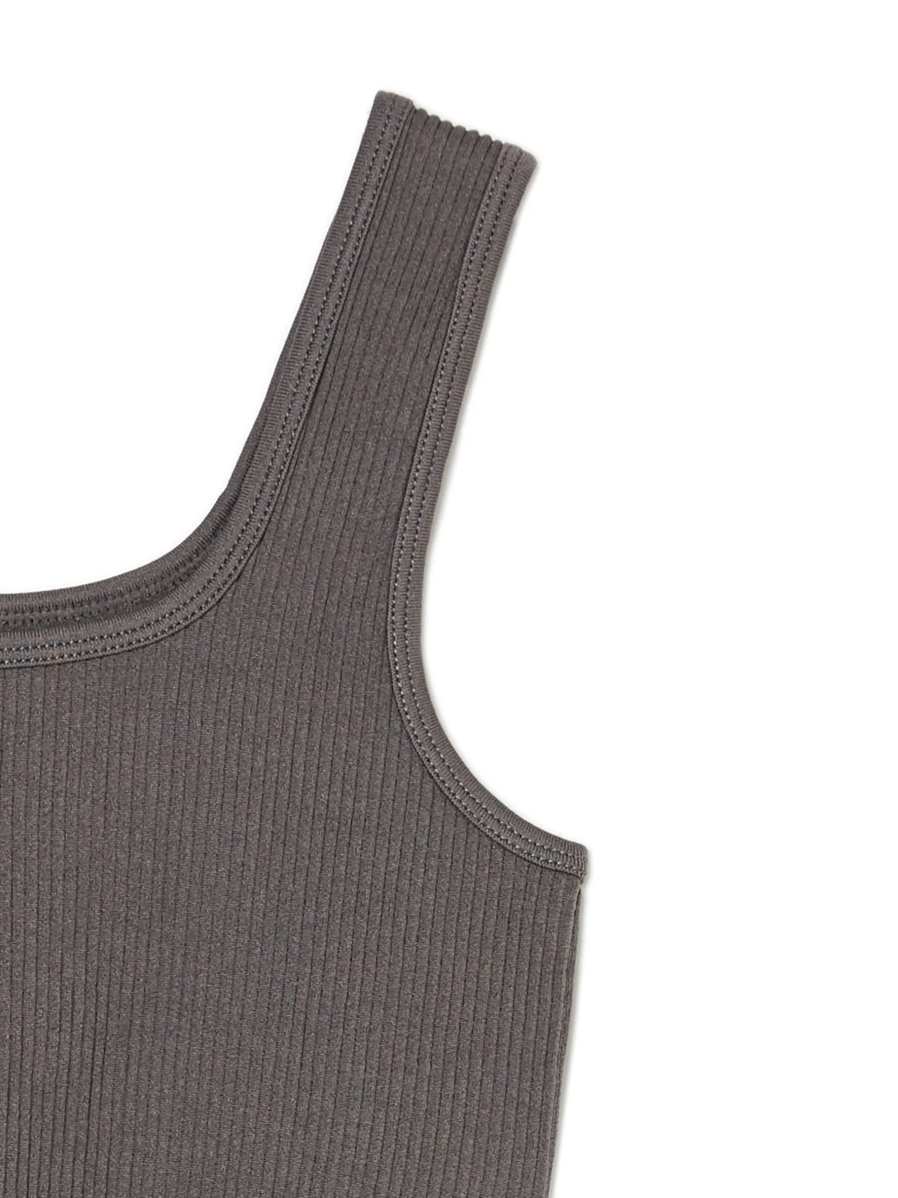 Damski crop top, uszyty z elastycznej dzianiny, gwarantującej komfort i dopasowanie do figury. krótki, dopasowany krój dekolt karo grube ramiączka prążkowana faktura materiału Wzrost modelki: 168 cm