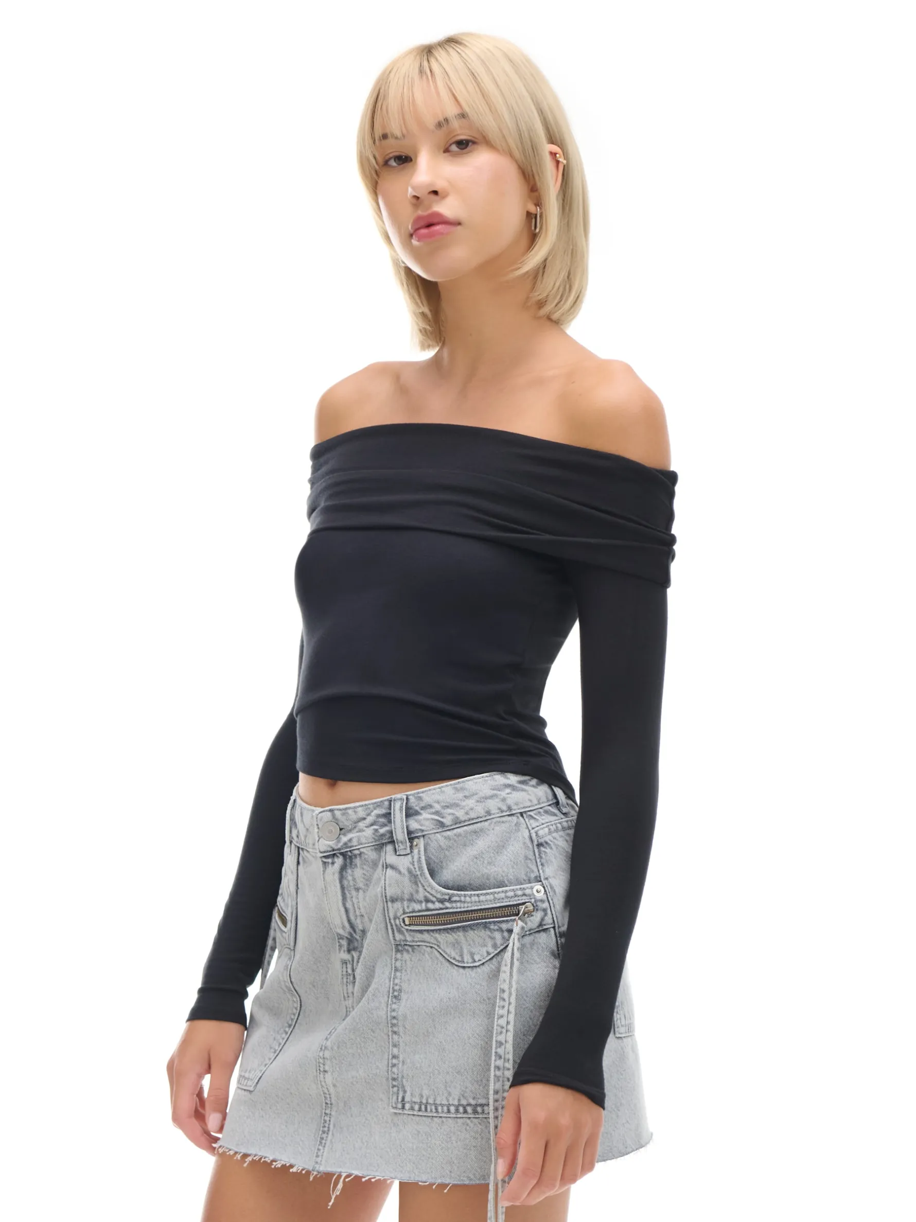 Czarna damska bluzka, uszyta z dzianiny o bardzo wysokiej zawartości bawełny. Domieszka elastanu gwarantuje idealnie dopasowanie do Twojej figury! dopasowany krój, podkreślający sylwetkę długie rękawy zakładka tworząca hiszpański dekolt, odsłaniający ramiona Wzrost modelki: 177 cm