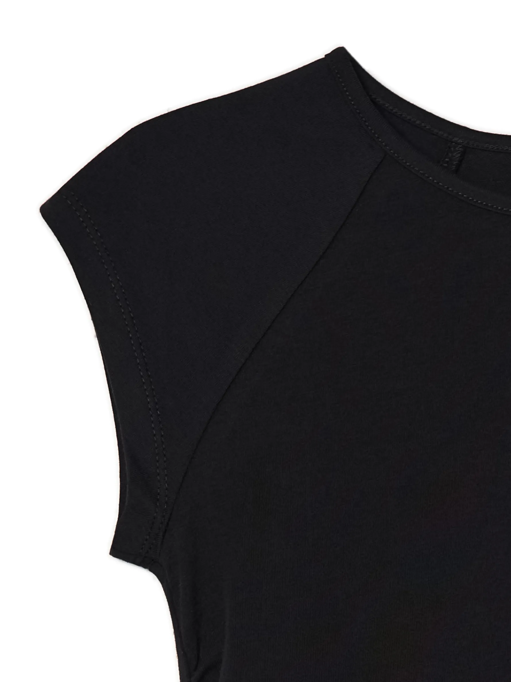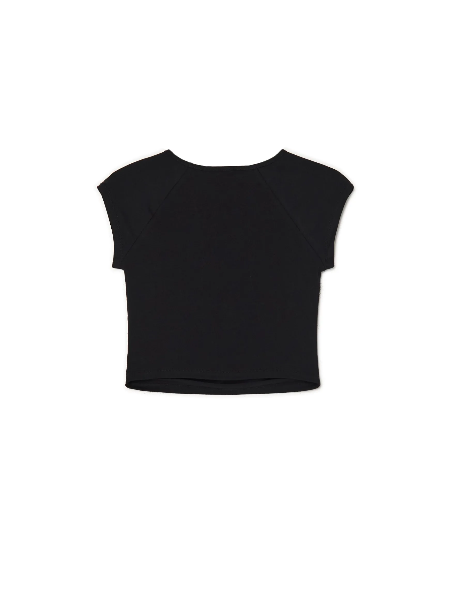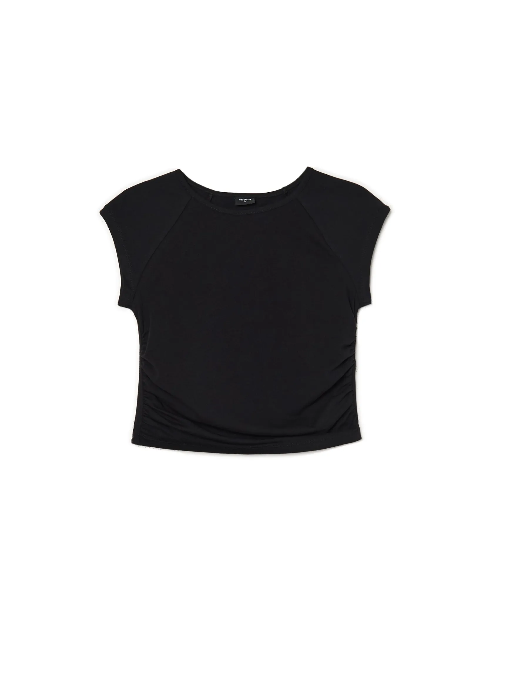 Bluzka damska z krótkimi rękawami uszyta z mieszanki dzianin w gładkim, czarnym kolorze. Klasyczny dodatek do wielu stylizacji. bawełna z dodatkiem elastycznych włókien dopasowana bluzka okrągły dekolt krótkie, ścięte rękawy lekkie marszczenia po bokach dla idealnego dopasowania materiału wokół brzucha