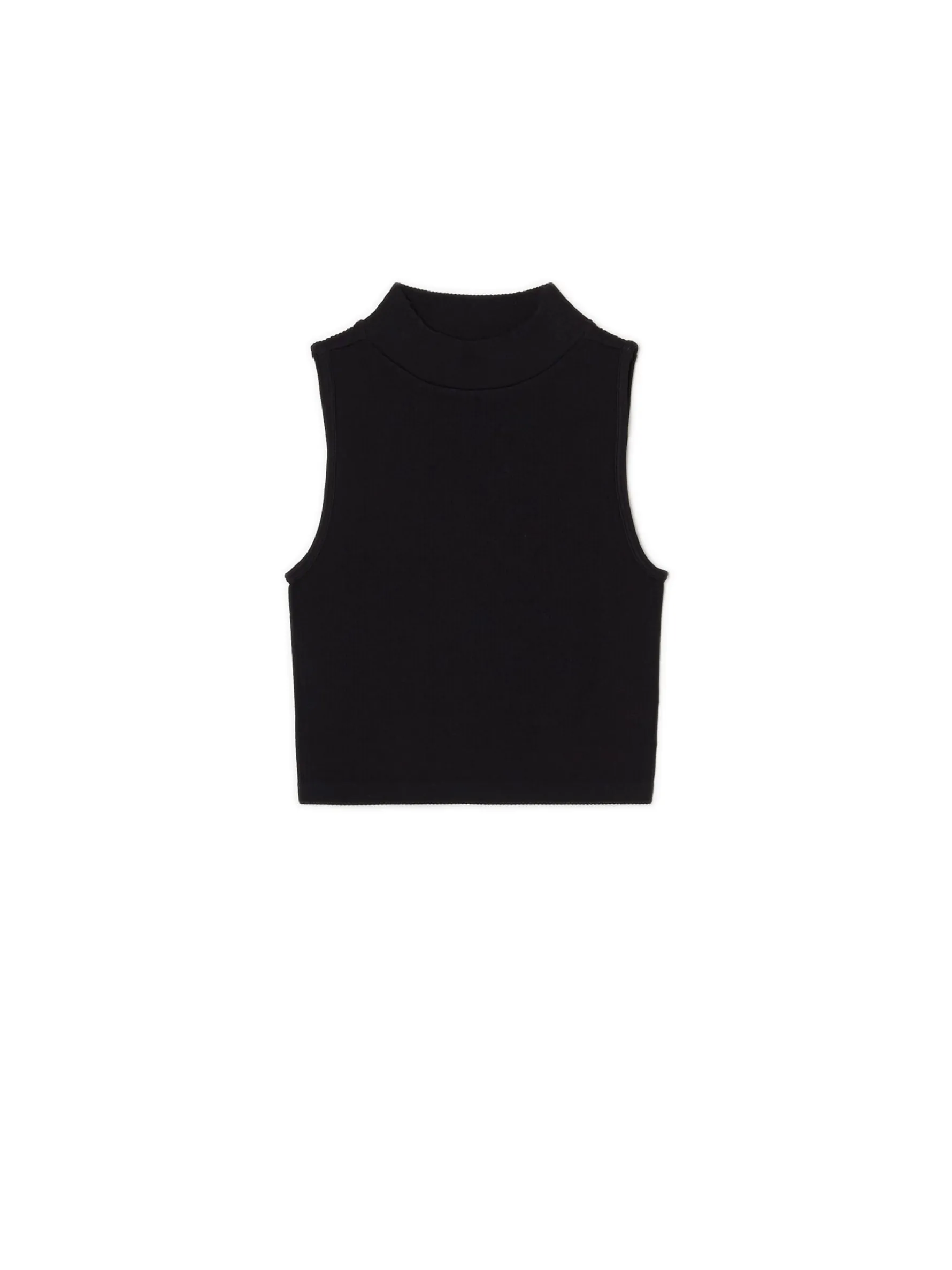 Damska czarna koszulka prążkowana na całej długości, bez rękawów i ze stójką. Idealny dodatek do wielu stylizacji.