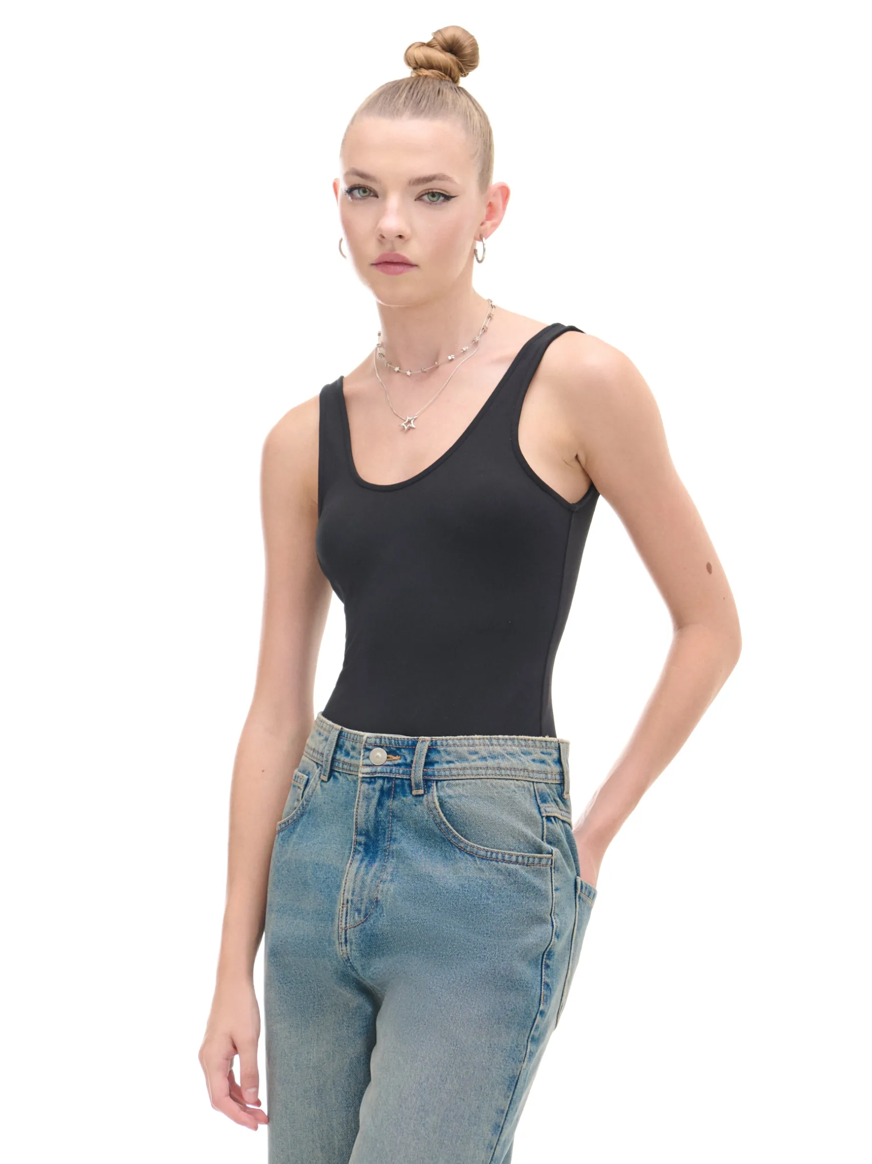 Damskie body w kolorze czarnym, uszyte z dzianiny z dodatkiem elastycznych włókien. Item do noszenia w formie soft lub jako dodatek do różnych stylizacji. dzianina z domieszką elastycznych włókien dopasowany krój podkreślający sylwetkę zapięcie na zatrzaski w kroku głęboki dekolt z przodu i na plecach na ramiączkach