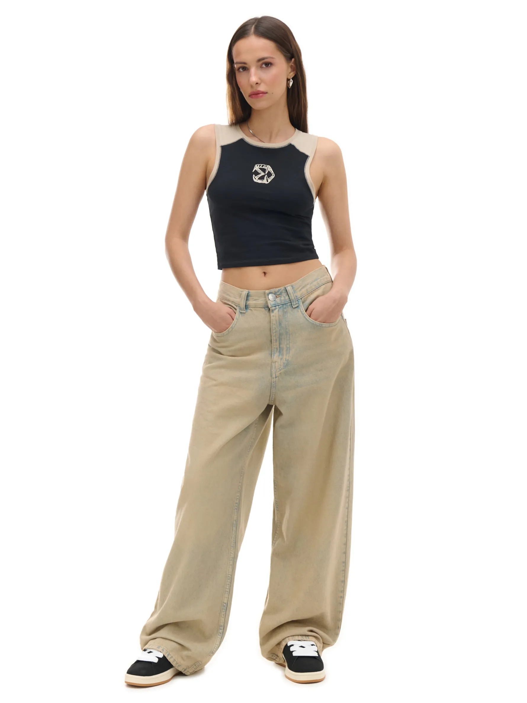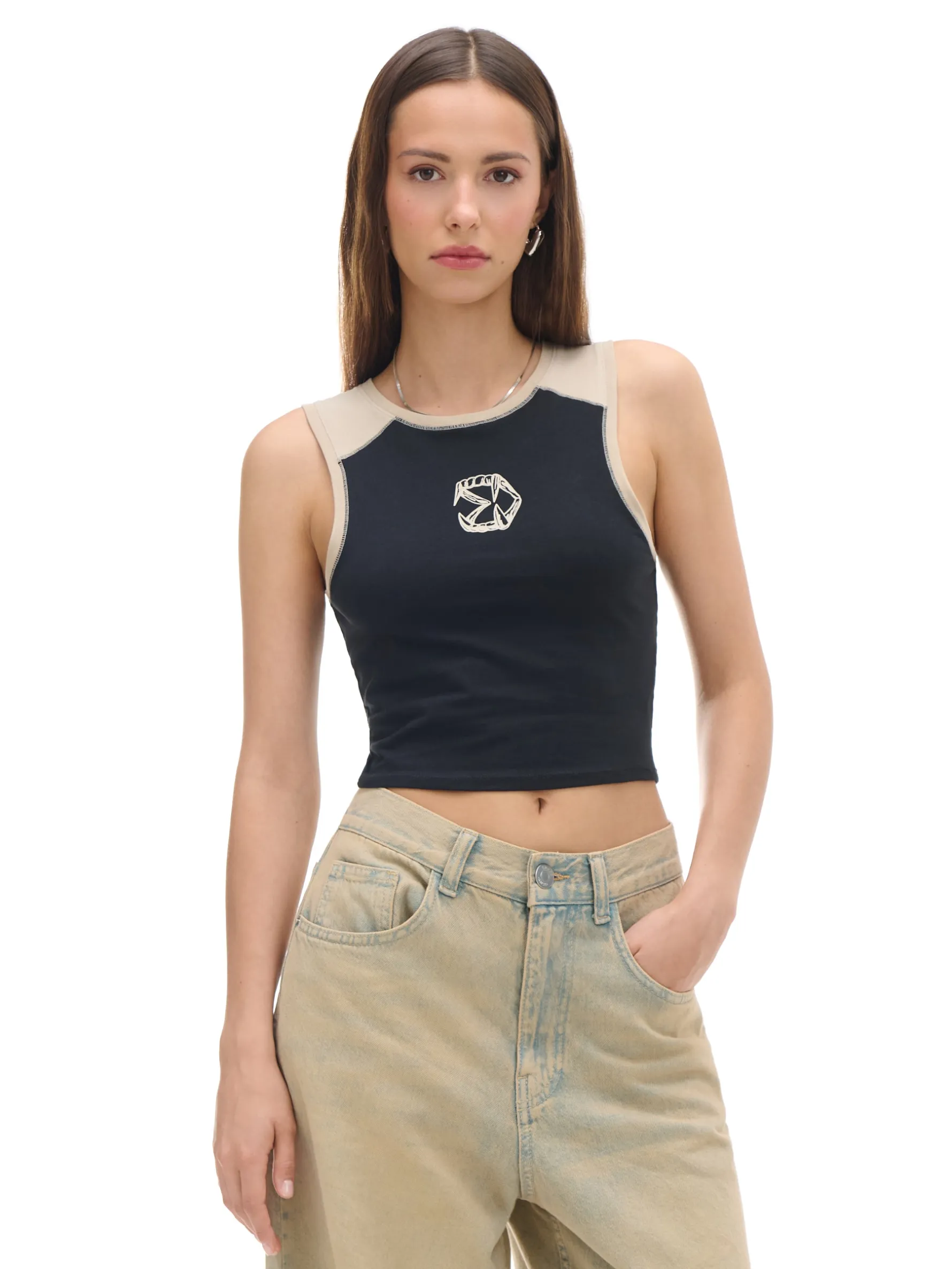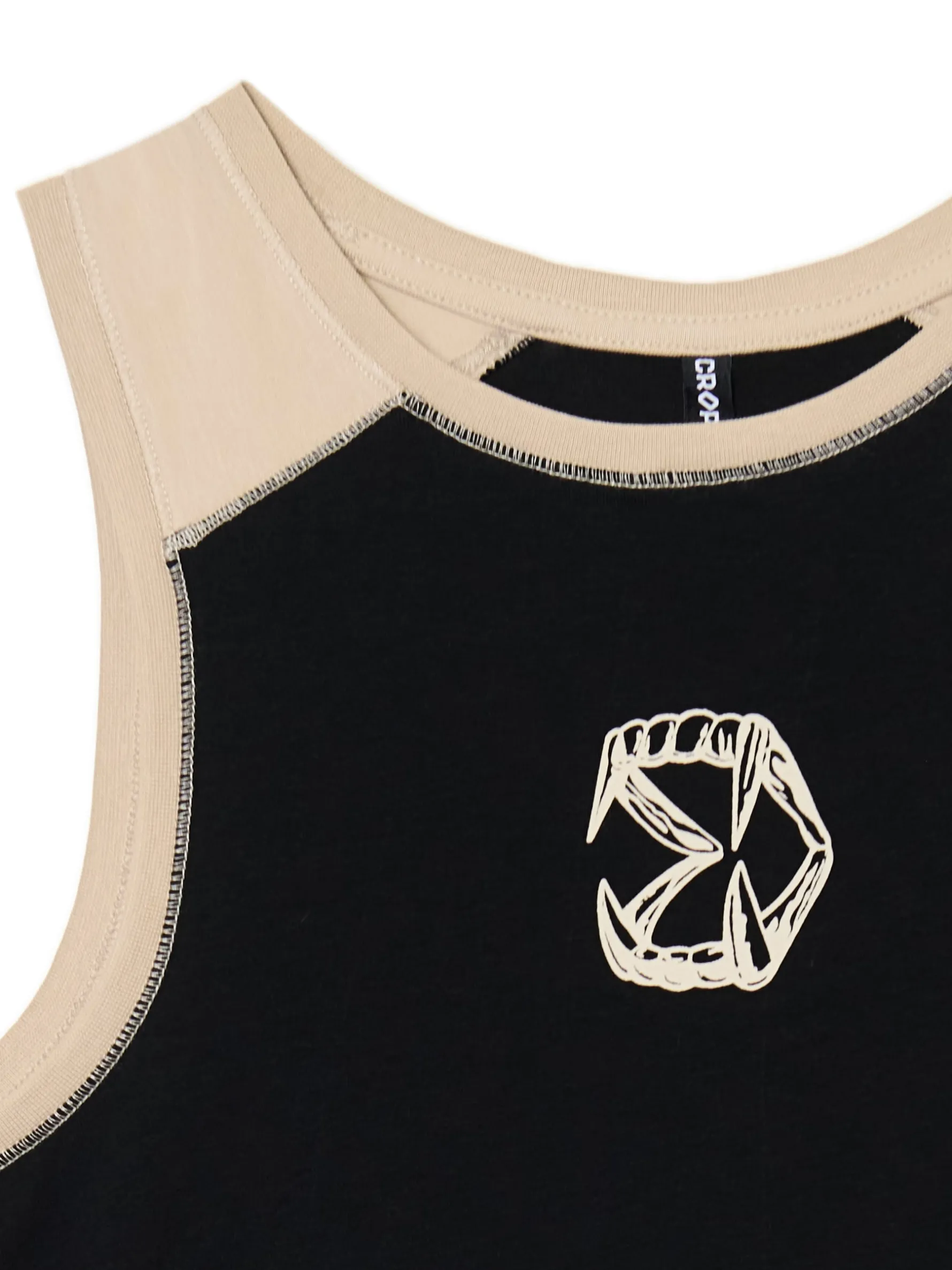 Damska koszulka na szerokich ramiączkach, uszyta z elastycznej dzianiny w kolorze czarnym. Hitem tego modelu są beżowe wstawki i nadruk z motywem szczęki. bawełna z dodatkiem elastycznych włókien dopasowany krój podkreślający sylwetkę bez rękawów nadruk z przodu