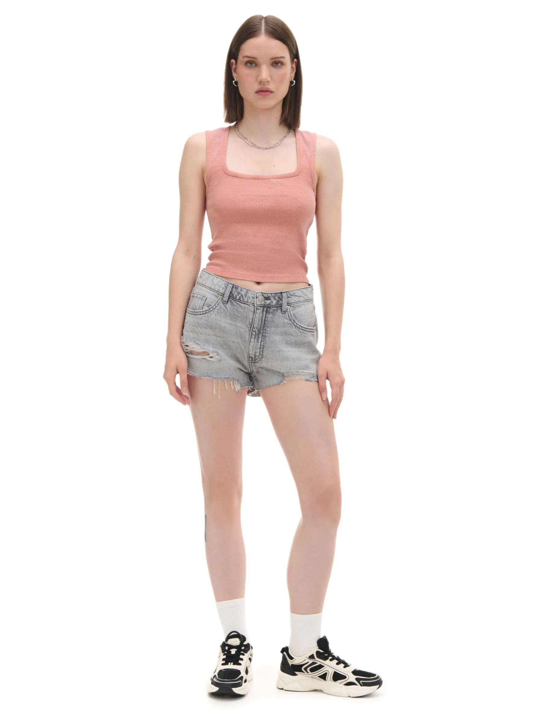 Damska koszulka na szerokich ramiączkach z kwadratowym, głębokim dekoltem. Ten item fituje zarówno z bluzą, jak i kurtką jeansową. Sprawdź! dzianina z domieszką elastycznych włókien dopasowany krój podkreślający sylwetkę szerokie ramiączka kwadratowy, elastyczny dekolt efekt sprania na całości