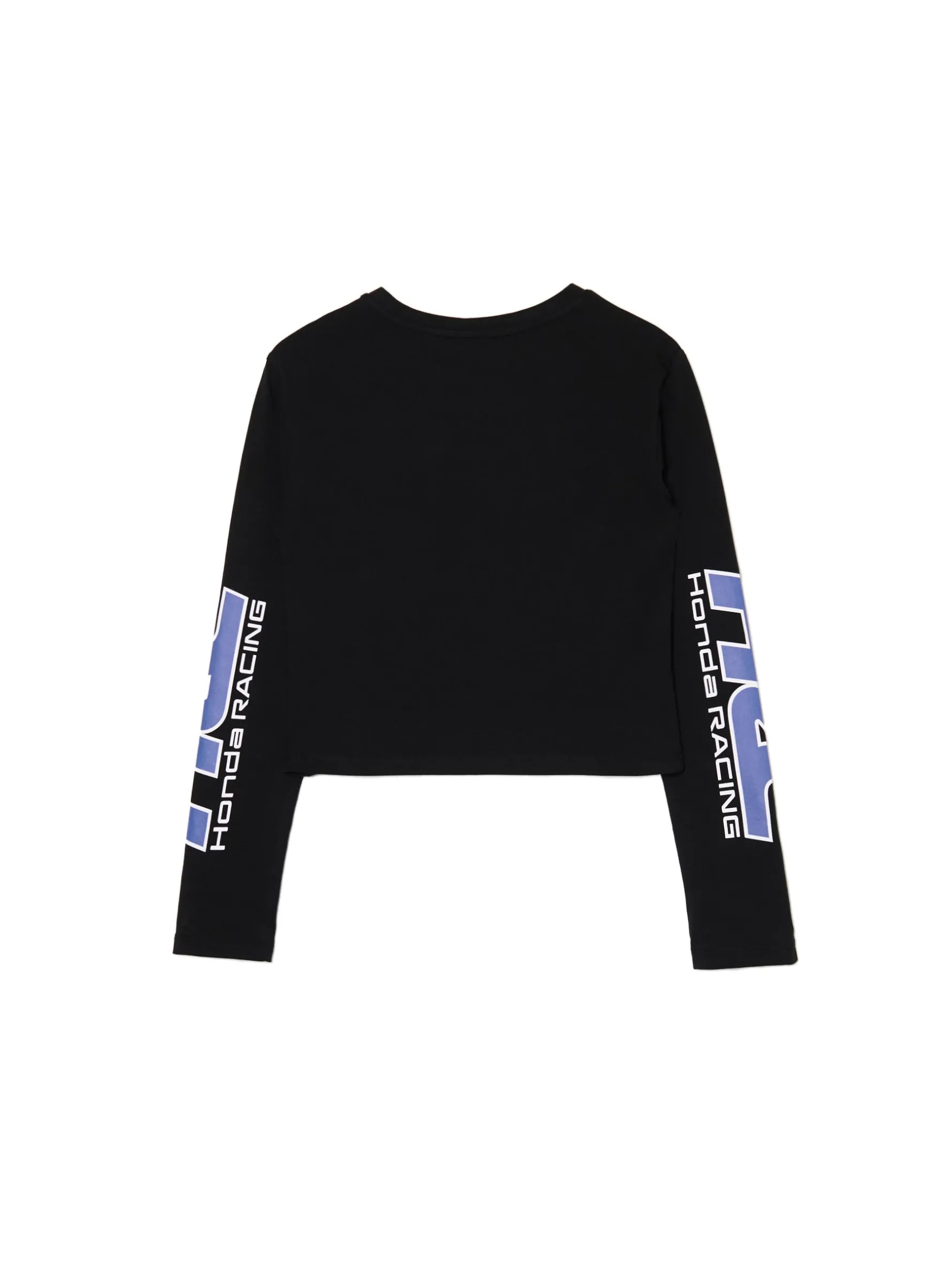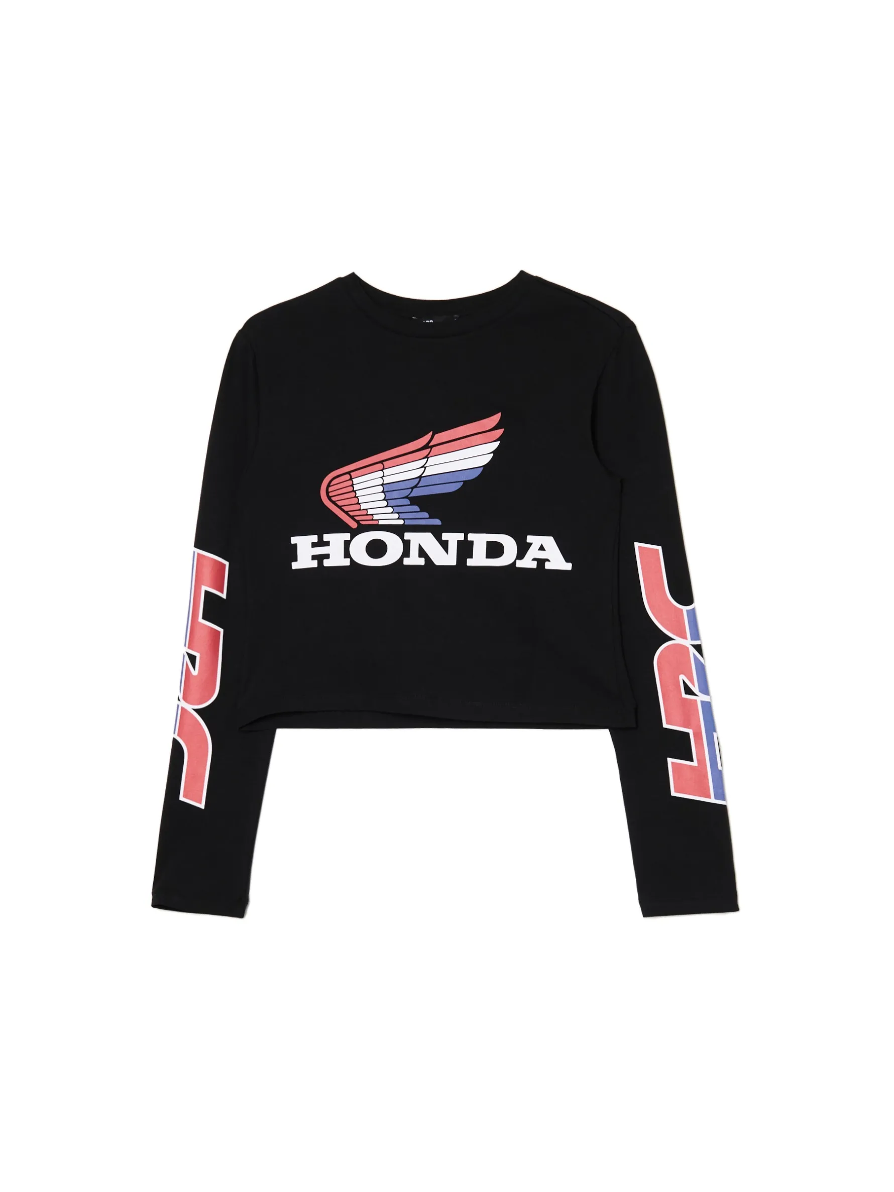 Czarna damska koszulka z długim rękawem uszyta z bawełny z domieszką elastycznych włókien. Wyobraź sobie siebie w tym efektownym outficie. Idealny match! dzianina z domieszką elastycznych włókien dopasowany krój podkreślający sylwetkę półokrągły dekolt z lamówką długie, dopasowane rękawy kolorowe nadruki z Honda Racing na przodzie i rękawach Wzrost modelki: 172 cm