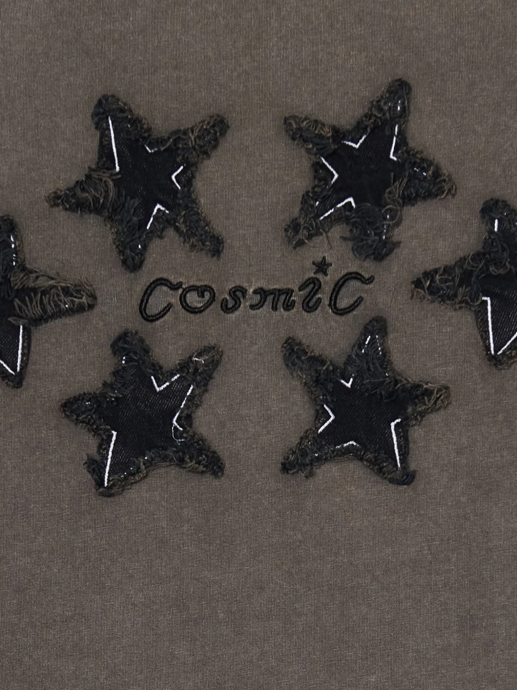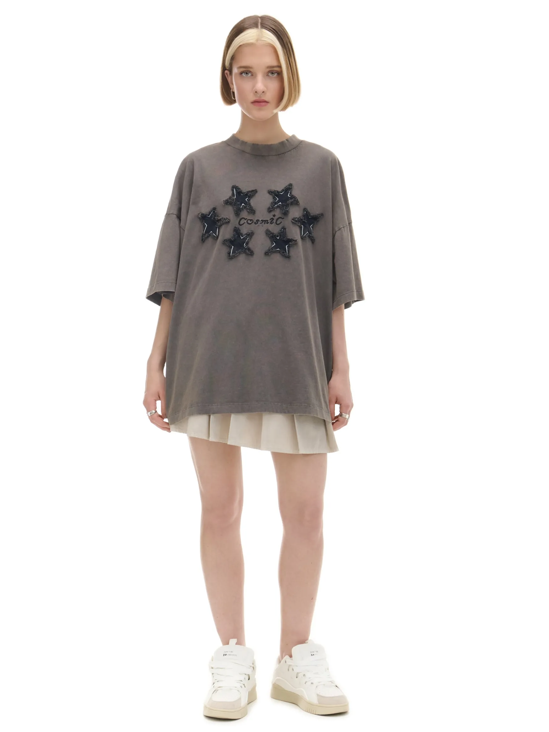 Damski t-shirt z krótkim rękawem uszyty z bawełny o modnym kroju oversize. Naszywki w kształcie gwiazdek zostaną zauważone w tłumie! 100% bawełny krój oversize z obniżoną linią ramion krótkie, szerokie rękawy półokrągły dekolt z lamówką efekt sprania na całości ozdobne naszywki z przodu