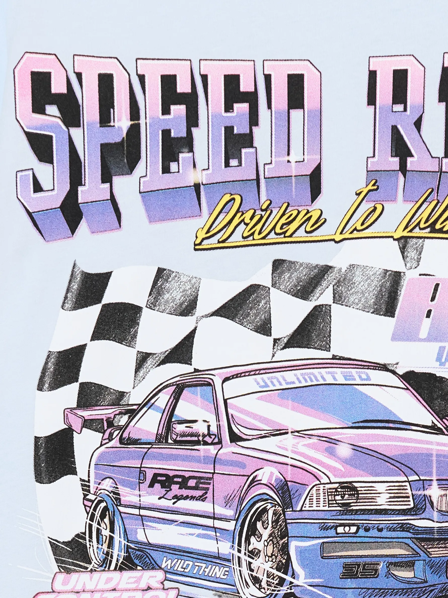 Bawełniana koszulka damska o kroju oversize, z obniżoną linią ramion. Z przodu duży nadruk z motywem motoryzacyjnym. 100% bawełny krój oversize krótkie, swobodne rękawy duży nadruk z przodu
