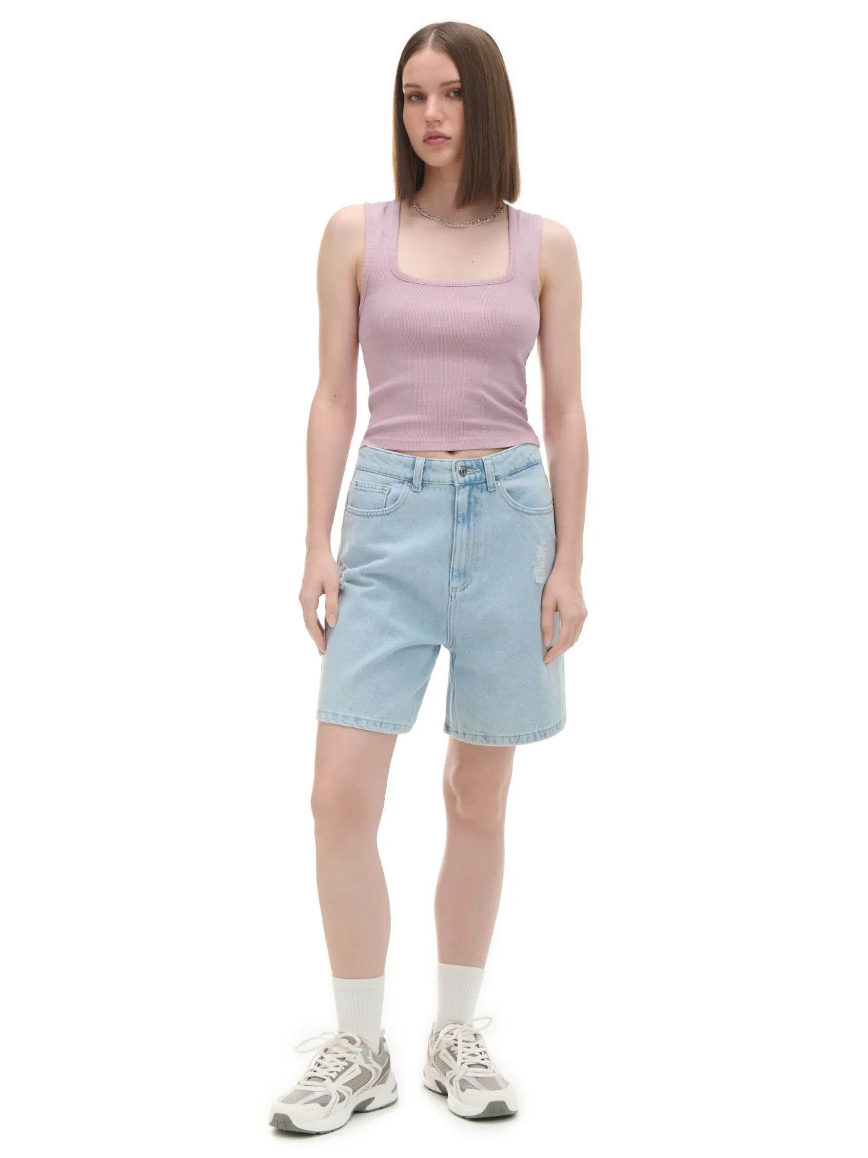 Damska koszulka na szerokich ramiączkach z kwadratowym, głębokim dekoltem. Ten item fituje zarówno z bluzą, jak i kurtką jeansową. Sprawdź! dzianina z domieszką elastycznych włókien dopasowany krój podkreślający sylwetkę szerokie ramiączka kwadratowy, elastyczny dekolt efekt sprania na całości