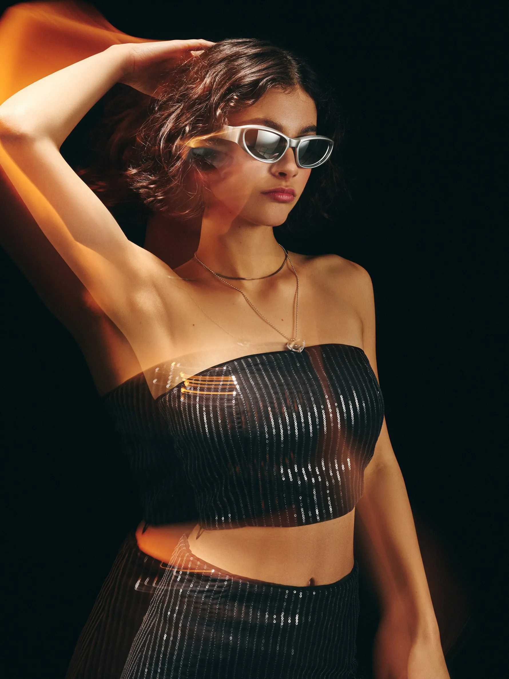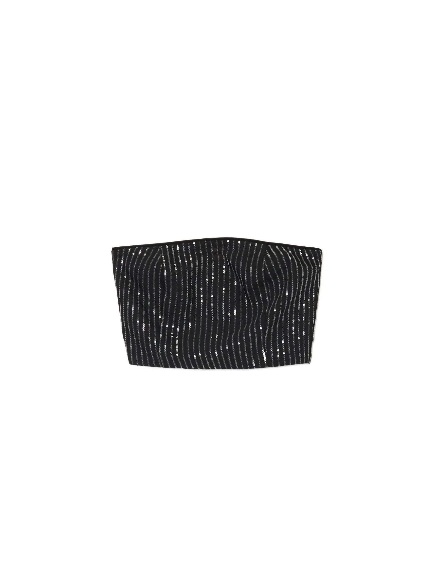Błyszczący top uszyty z mieszanki tkanin z dodatkiem wiskozy. Na całej powierzchni aplikacja w formie cekinowych pasów. Dzięki niemu nie przejdziesz niezauważona w tłumie! uszyte z tkaniny z dodatkiem wiskozy dopasowany krój podkreślający sylwetkę zapięcie na kryty zamek z boku cekinowa aplikacja all over