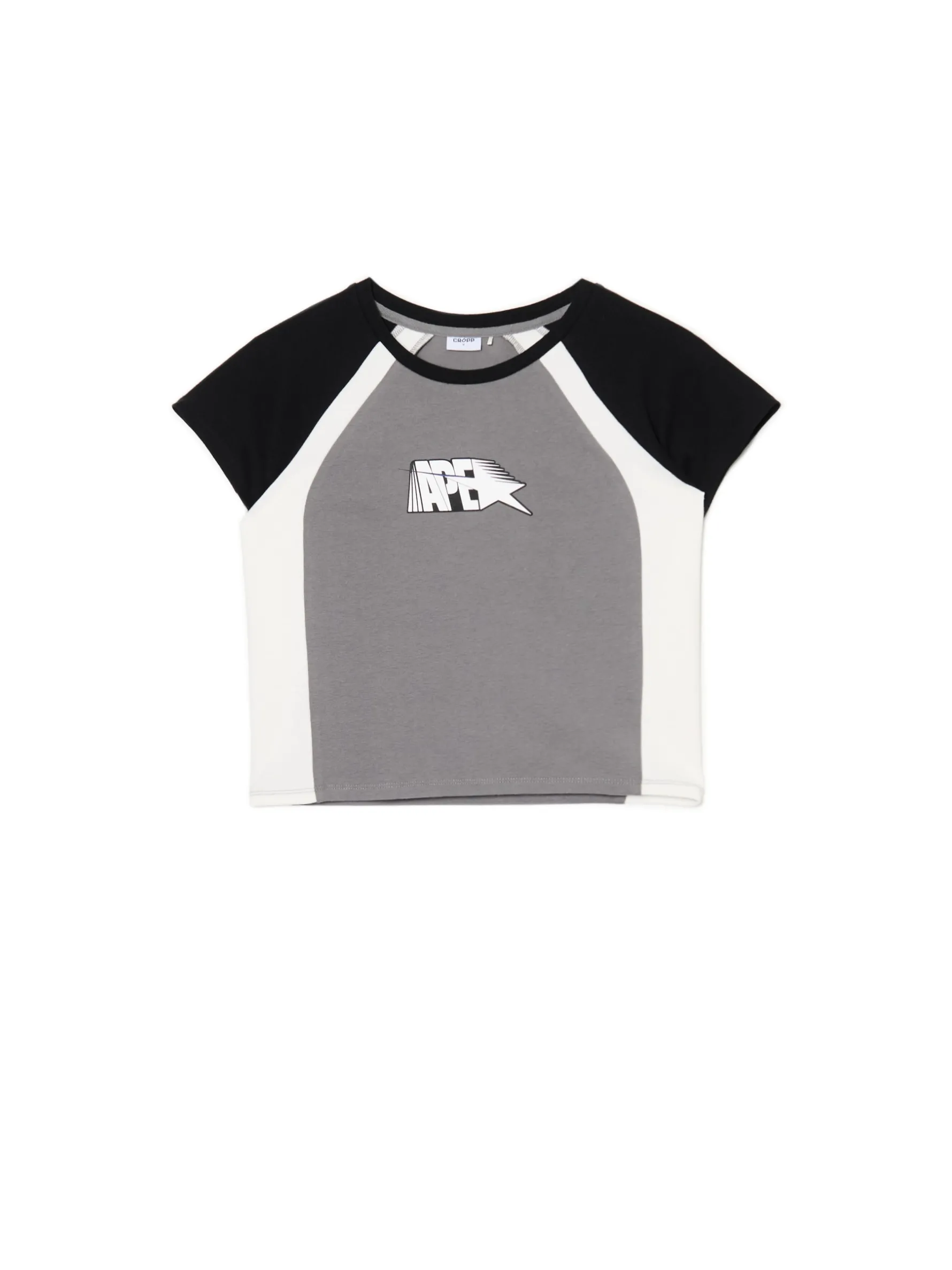 Bawełniana damska koszulka uszyta z dzianiny z dodatkiem elastycznych włókien. Idealna na sportowe zmagania w trakcie trwania Baltic Games! bawełna z dodatkiem elastycznych włókien dopasowany krój podkreślający sylwetkę krótkie, raglanowe rękawy napis z przodu Wzrost modelki: 172 cm