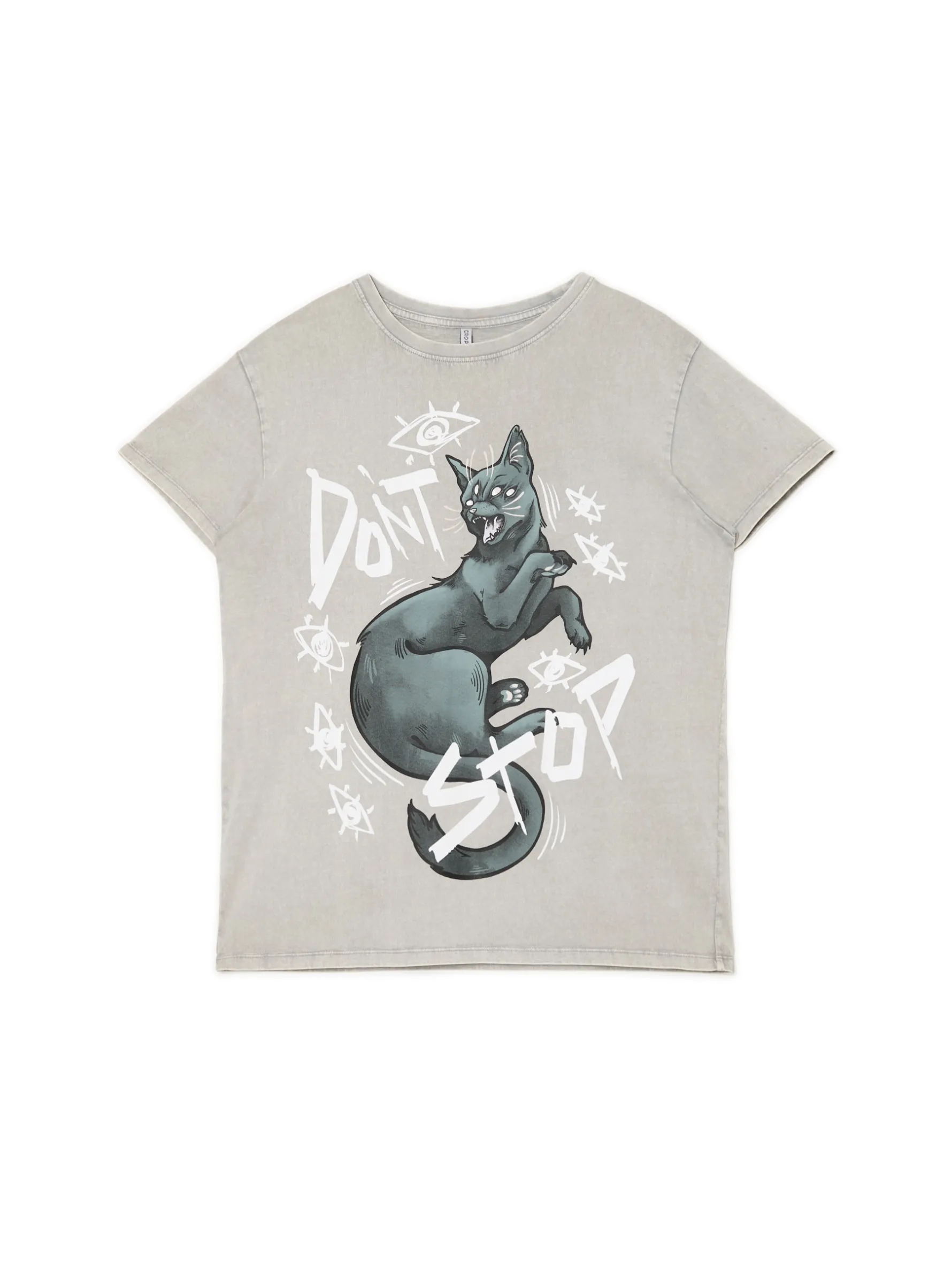 Damski T-shirt z krótkim rękawem, uszyty z bawełny w szarym odcieniu. Na przodzie unikatowy nadruk z kocim motywem. Nie tylko dla cat lovers! 100% bawełny krój oversize krótkie, swobodne rękawy nadruk z kotami z przodu