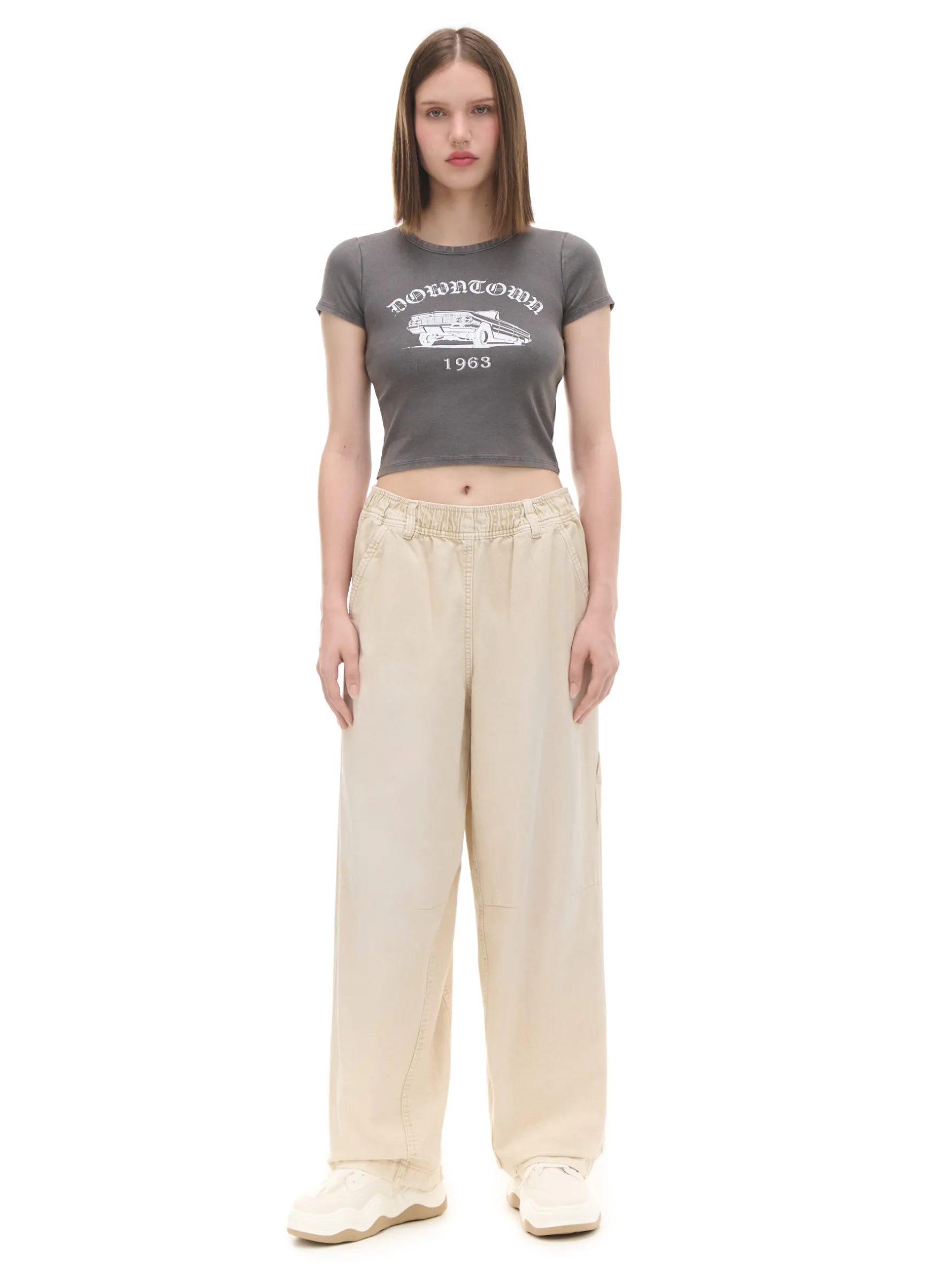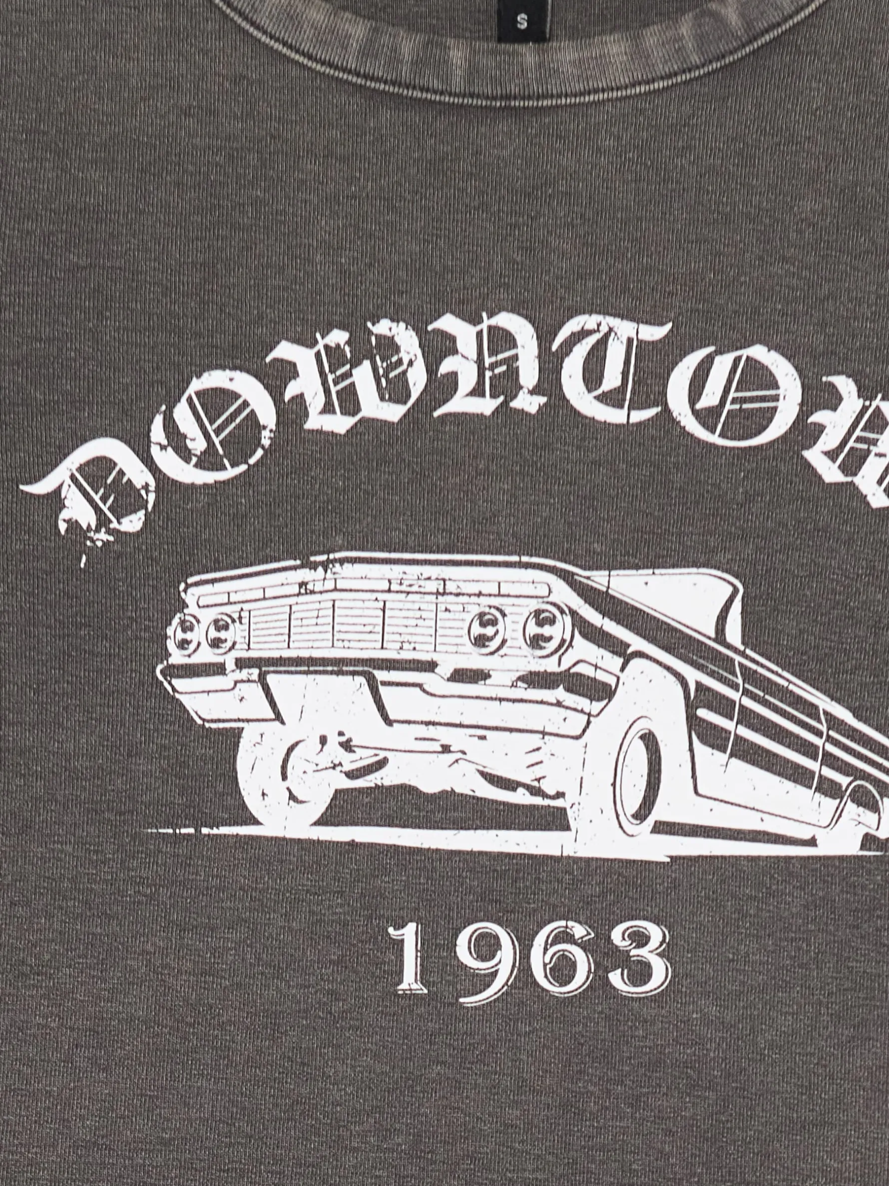 Damska koszulka uszyta z mieszanki bawełnianej i elastycznej dzianiny. Na przodzie nadruk z motoryzacyjnym motywem w stylu vintage. bawełna z dodatkiem elastycznych włókien krótki, dopasowany fason krótkie rękawy duży nadruk z przodu Wzrost modelki: 172 cm
